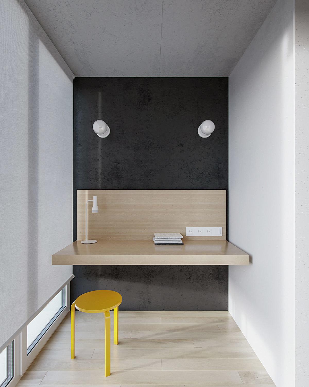 Svoje mjesto u stanu, i to sa suprotne strane prozora, pronašao je radni kutak - radni stol, svjetiljka i stolac upečatljive žute boje. Da bi dodatno istaknuli minimalistički dio stana, jedan dio zida dizajneri su obojili u crnu boju.