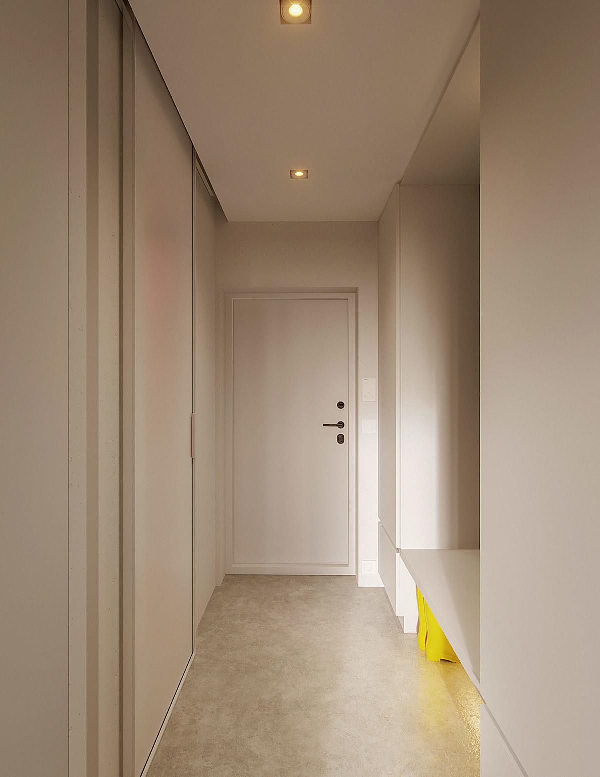 Uz sam ulaz u stan smješteni su bijeli ugradbeni ormari, a u samoj sredini prostorije nalazi se jednostavna klupica sa spremištem za obuću.