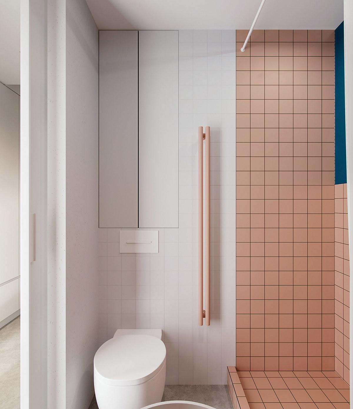 Kupaonica je, kao i ostatak stana, uređena u minimalističkom stilu kako bi se postigla što bolja funkcionalnost i oslobodilo što više mjesta. Ne smijemo zaboraviti da je ovdje riječ o samo 28 kvadrata.