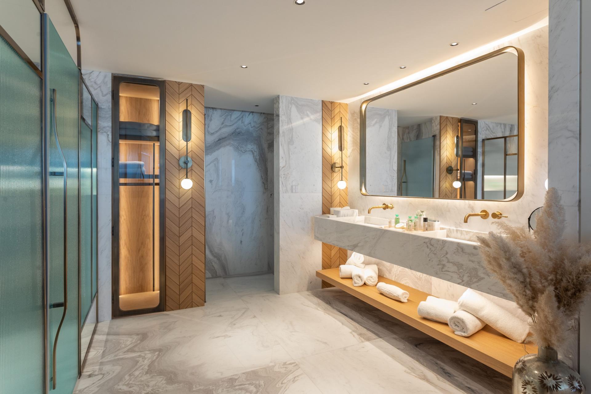 U kupaonici je mramorni pod s grijanjem te antičko zlatna oprema. Tu su i Bulgari dodaci. Nudi i razne tehničke uređaje, recimo za kontrolu rasvjete ili sound sustav.