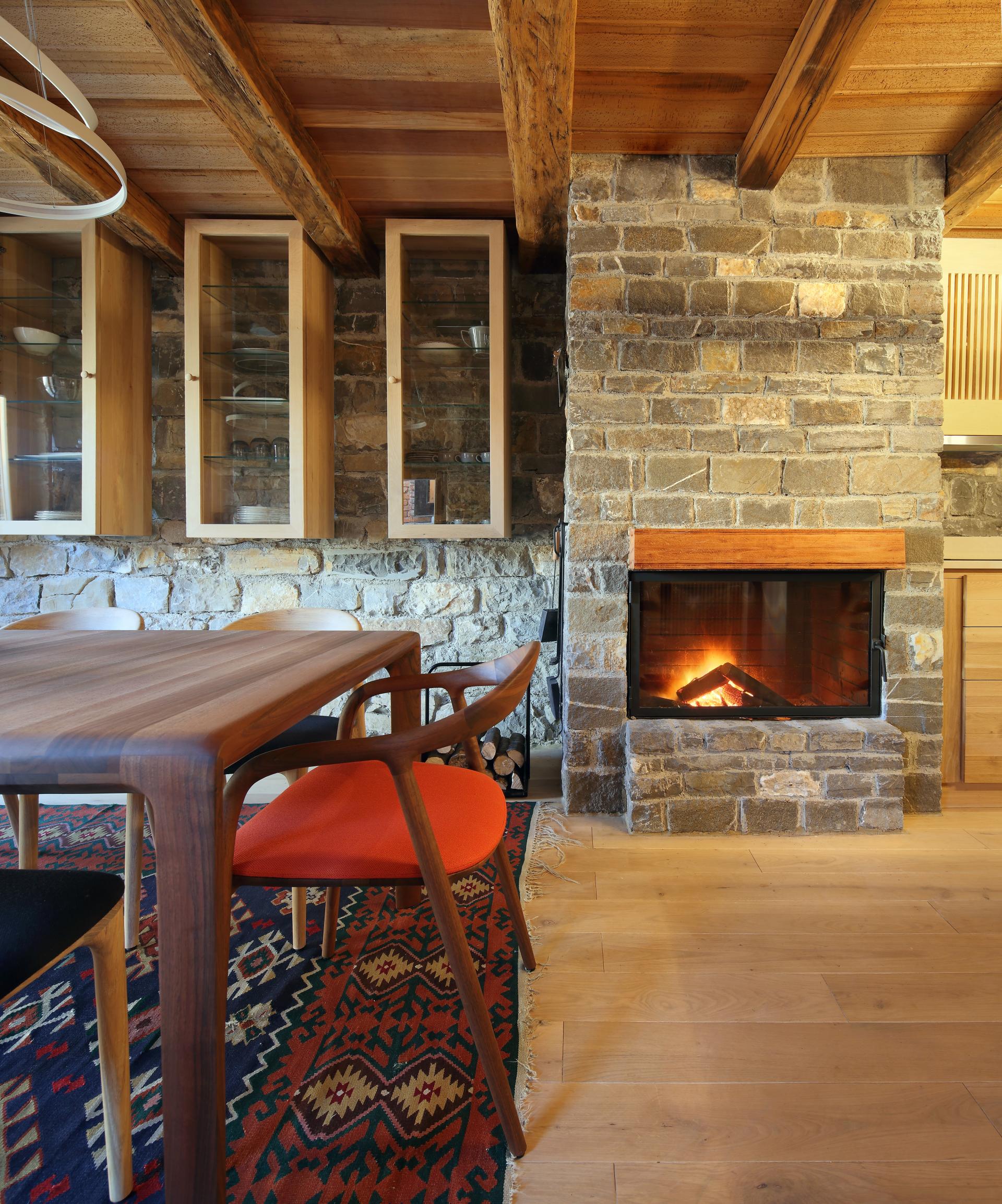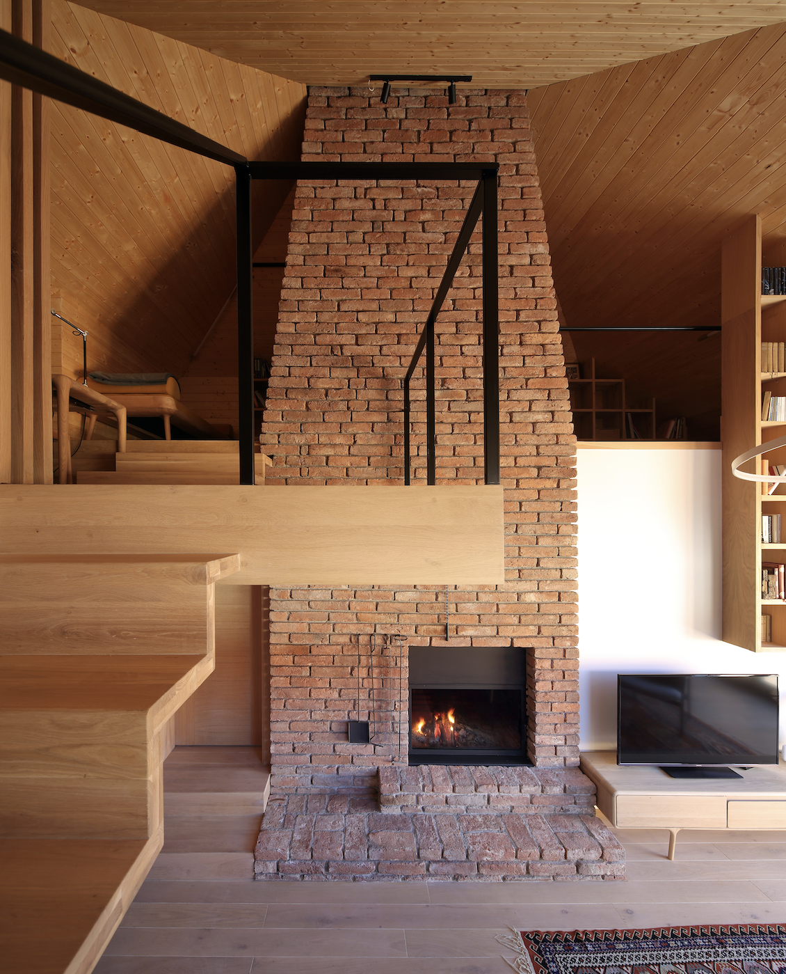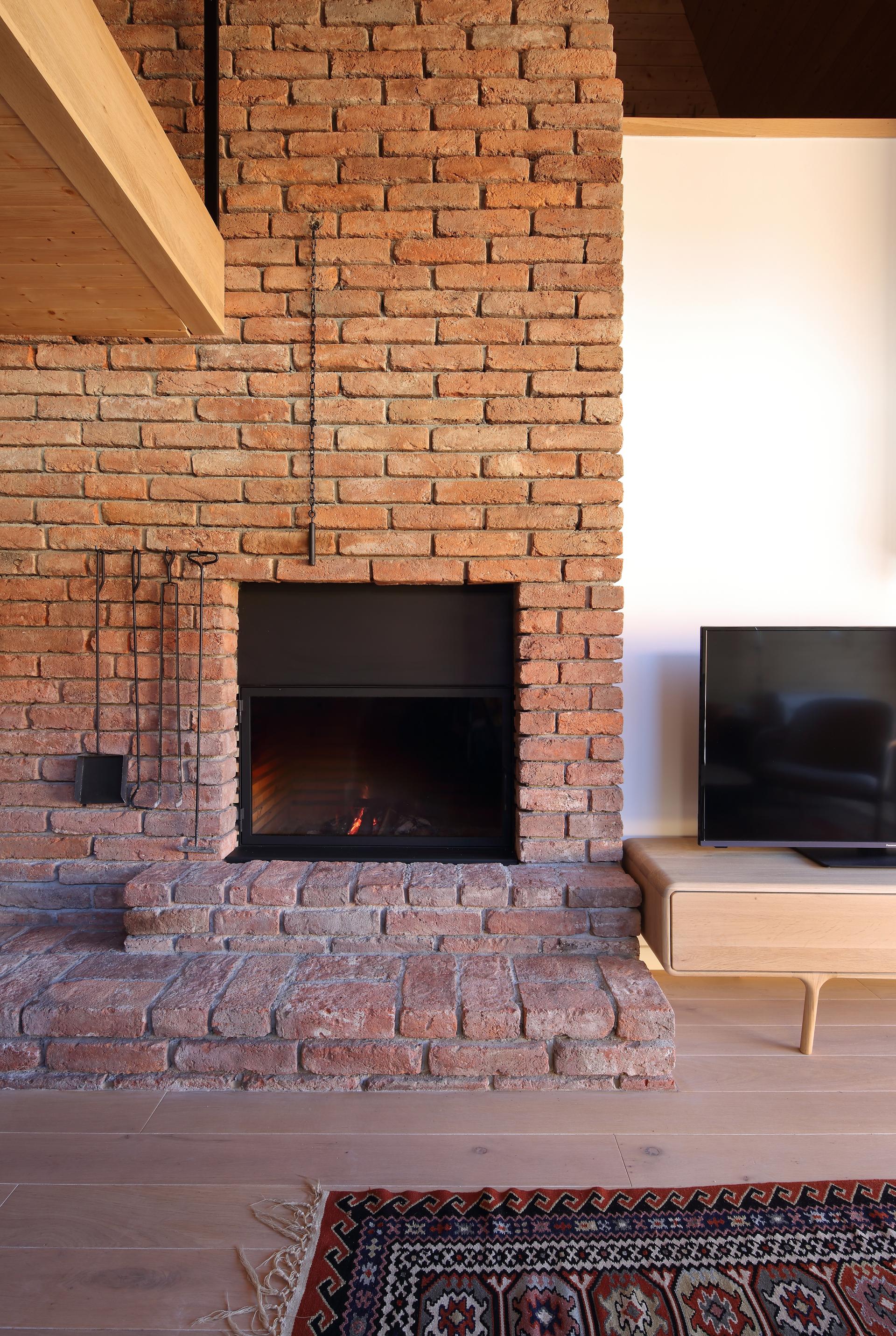 Četverovodno krovište i centralno ognjište korijeni su tradicionalnih kuća na ovim prostorima. Arhitekti su i to rekreirali, ali samo bez streha. Princip centralnog ognjišta se primjenjuje i ovdje s kamenim ognjištem u spremištu i onim od opeke na katu kao reminiscencija na originalne materijale od čega je kuća bila napravljena. I dimaluk odnosno centralni dimnjak izlazi točno na vrhu četverovodnog krova. Krovište se ne zatvara s unutrašnje strane, nego se ostavlja kao galerija - biblioteka.