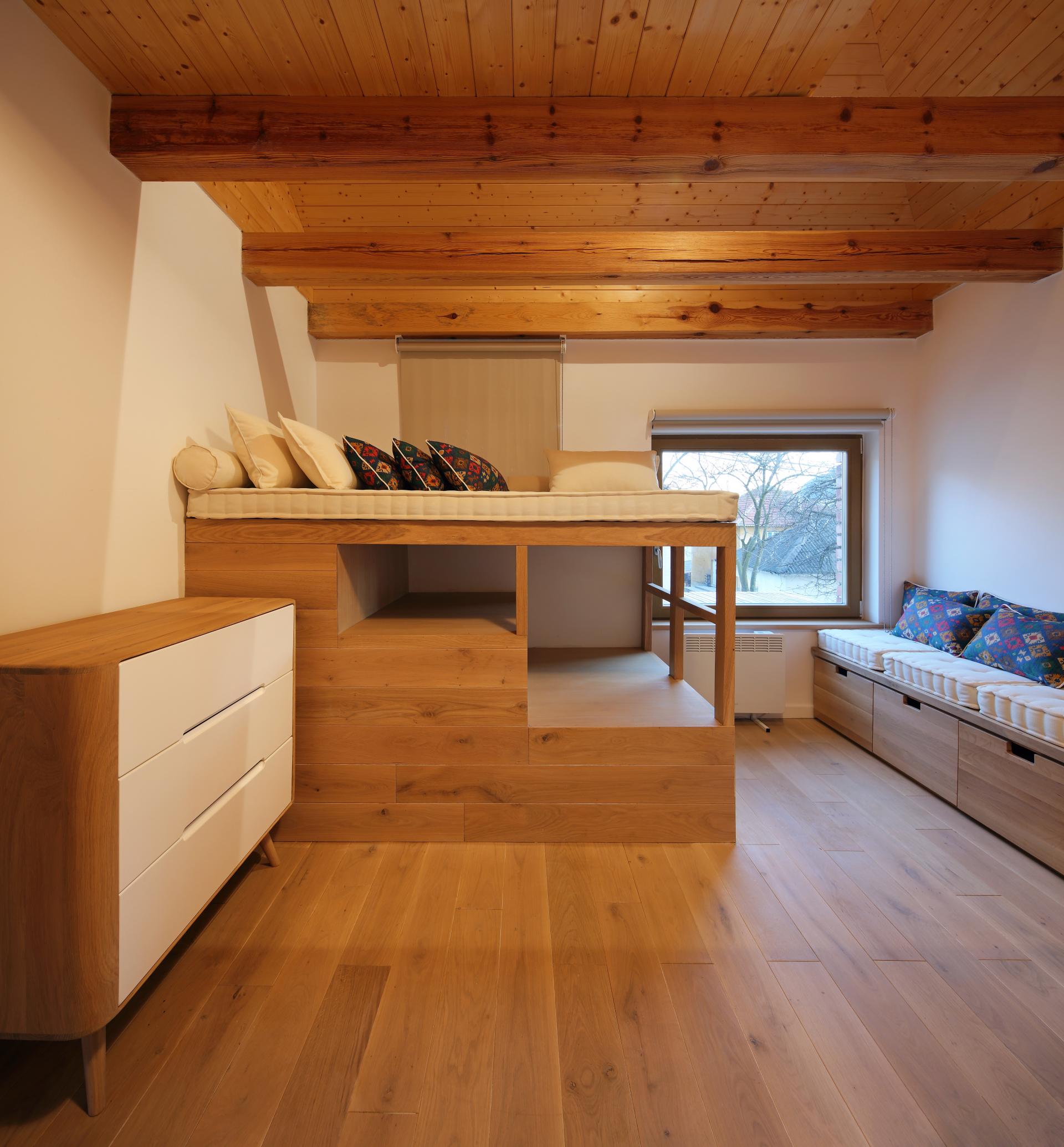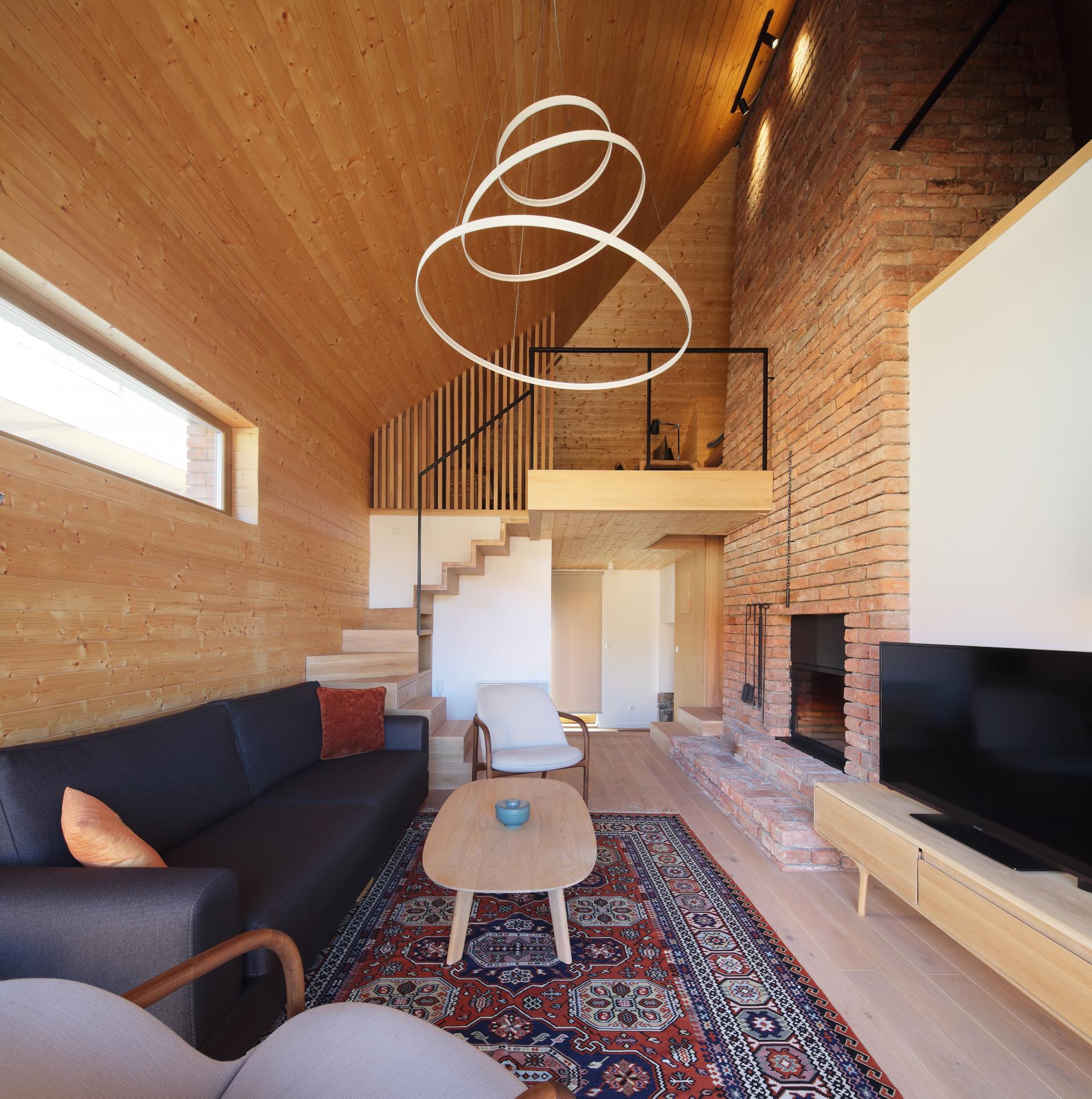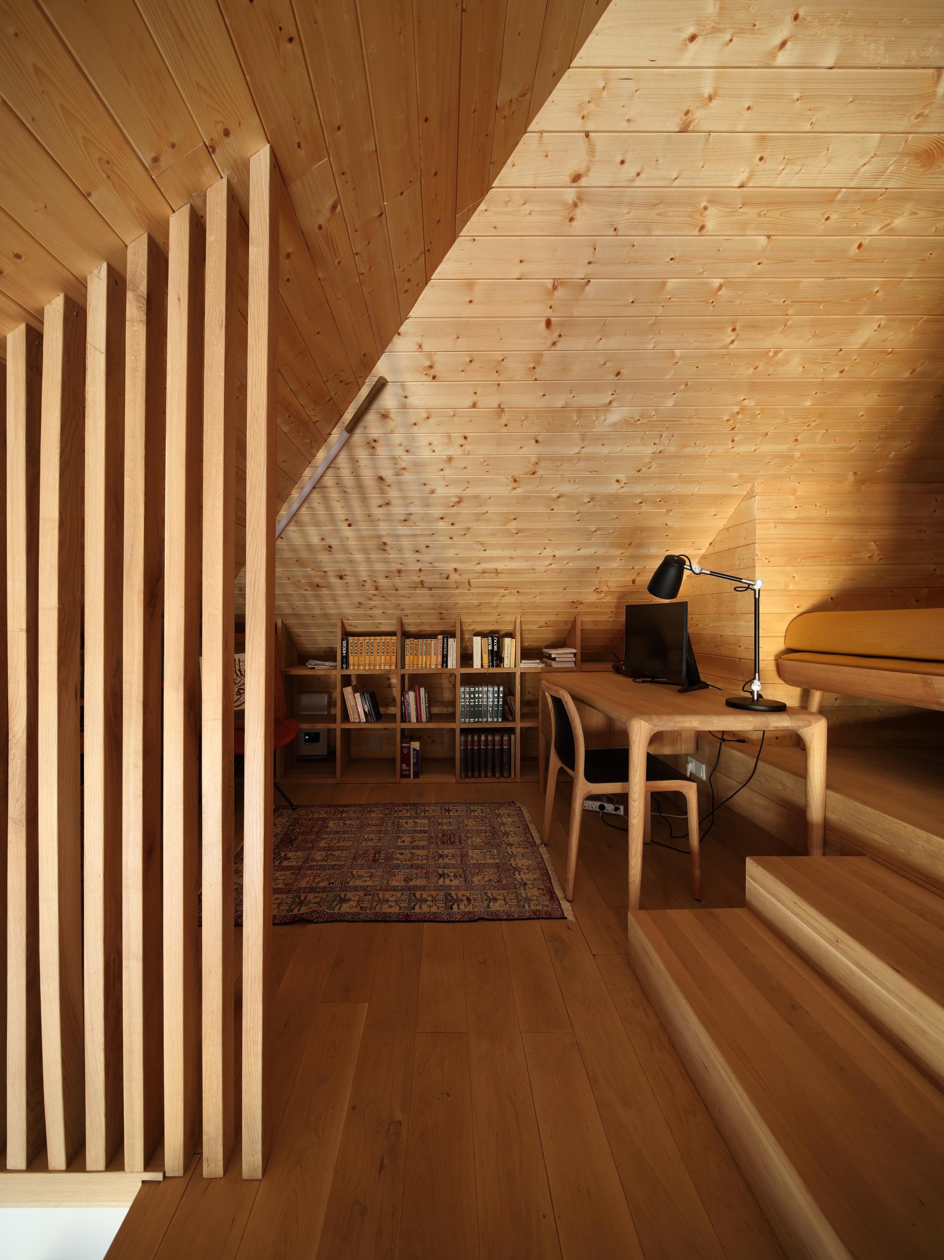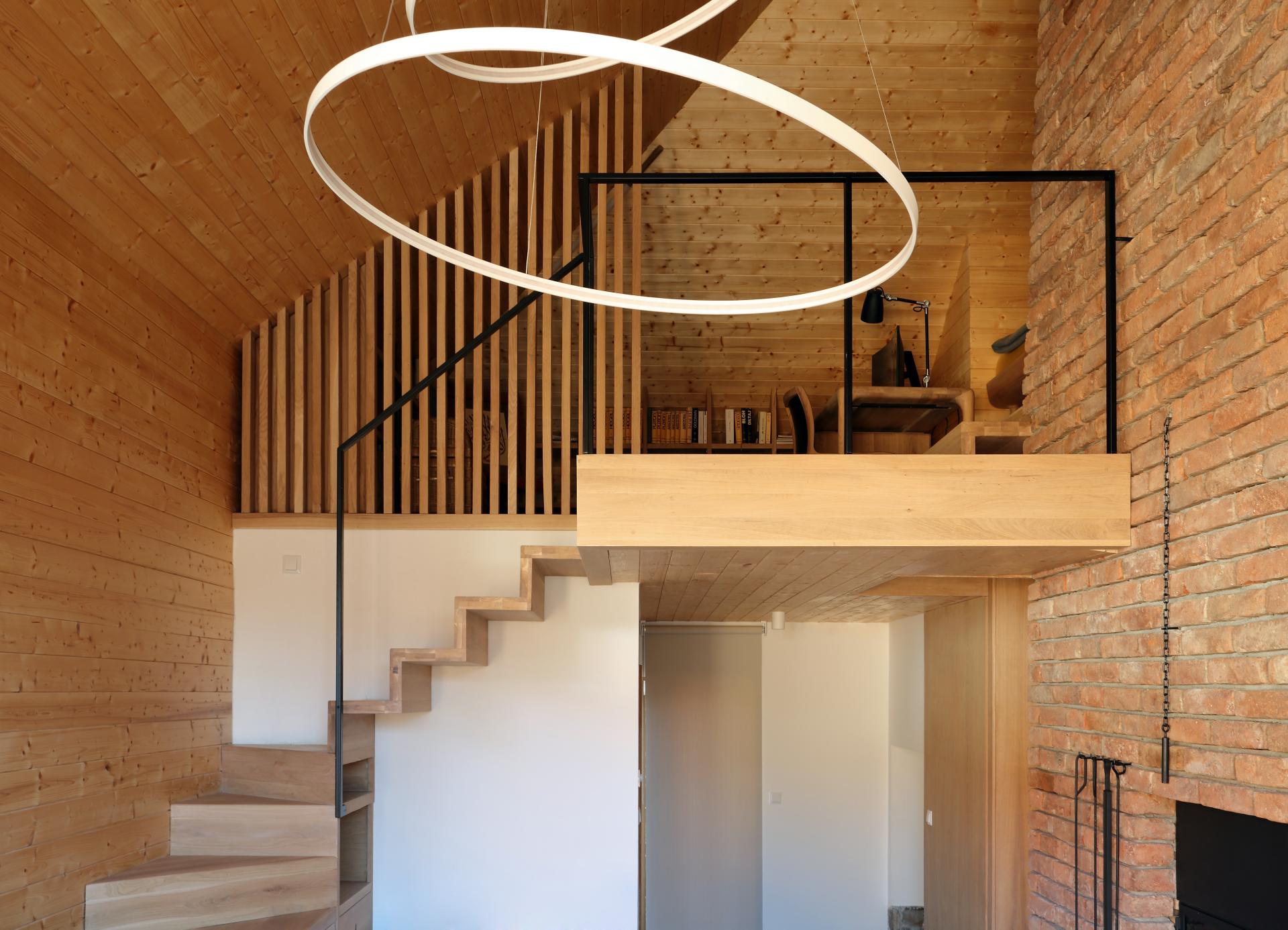 Četverovodno krovište i centralno ognjište korijeni su tradicionalnih kuća na ovim prostorima. Arhitekti su i to rekreirali, ali samo bez streha. Princip centralnog ognjišta se primjenjuje i ovdje s kamenim ognjištem u spremištu i onim od opeke na katu kao reminiscencija na originalne materijale od čega je kuća bila napravljena. I dimaluk odnosno centralni dimnjak izlazi točno na vrhu četverovodnog krova. Krovište se ne zatvara s unutrašnje strane, nego se ostavlja kao galerija - biblioteka.