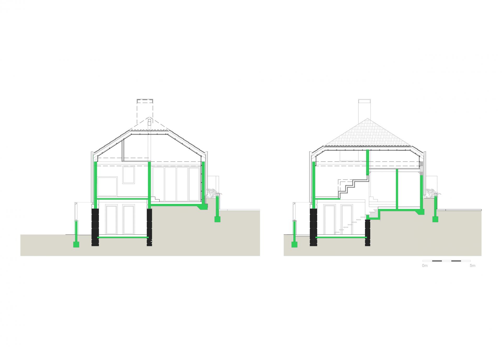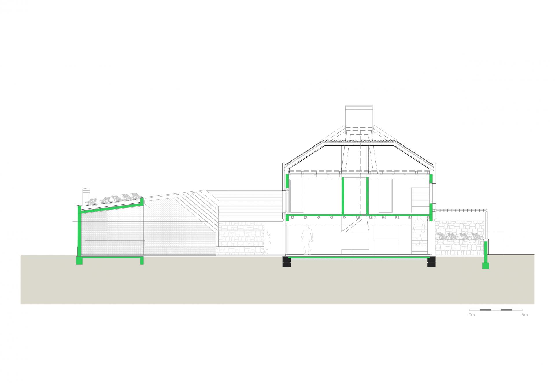 Doznajemo da je spremište bilo nisko, pa se i dubilo u zemlju i išlo malo u visinu. Arhitekti su našli sličan kamen da se dozida visina, s prirodno ugodnom klimom zbog debelih kamenih zidova, spremište postaje kuhinja i prolazni dio kuće prema "ženskoj avliji". Stare grede ponovno dolaze na svoje mjesto, ali sada one nose betonsku ploču. Na gornjoj etaži razvija se dnevni boravak, spavaća soba za vlasnike i gostinjska soba. Kuća sada zauzima 130 četvornih metara, a vanjski dio se rasprostire na 110.