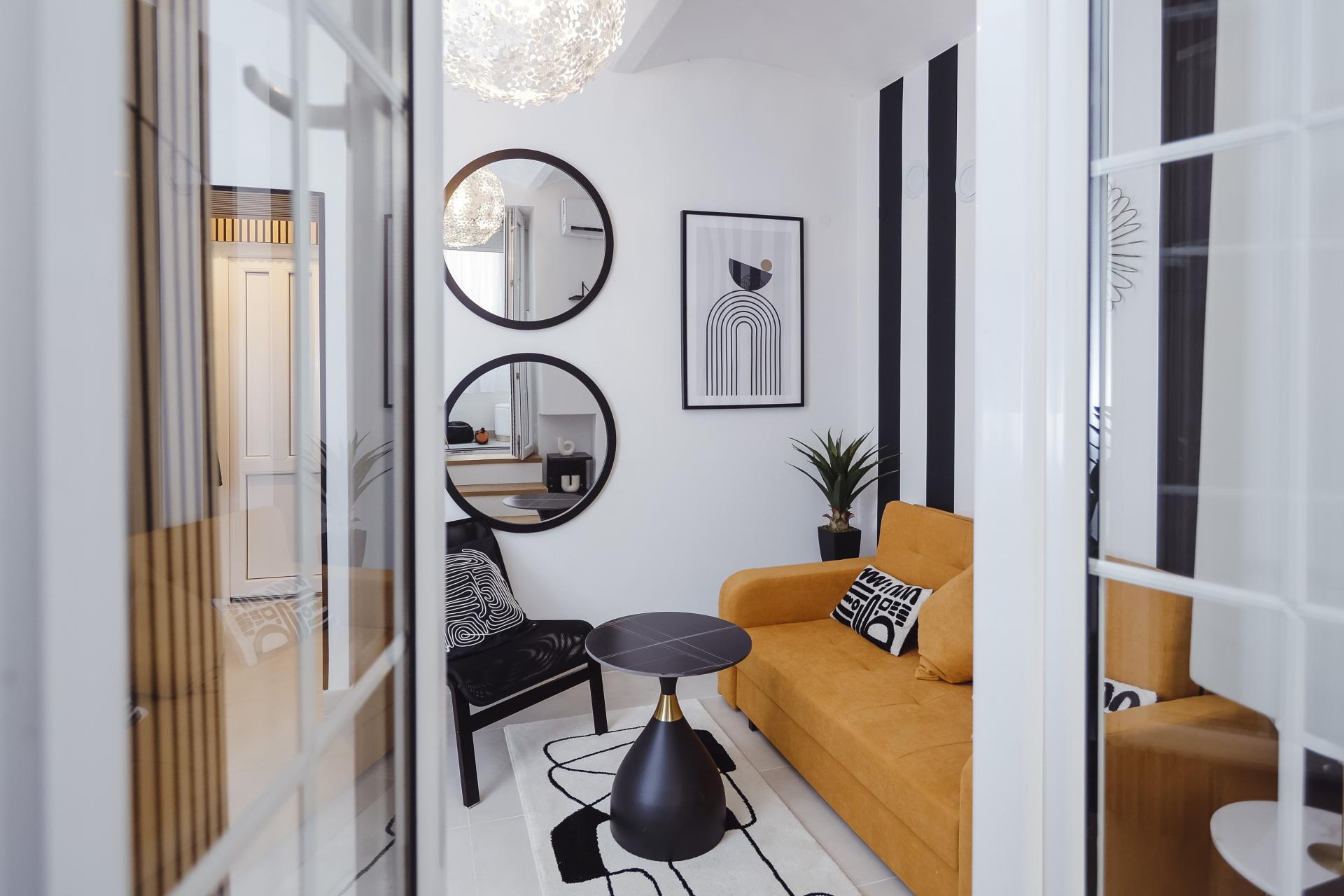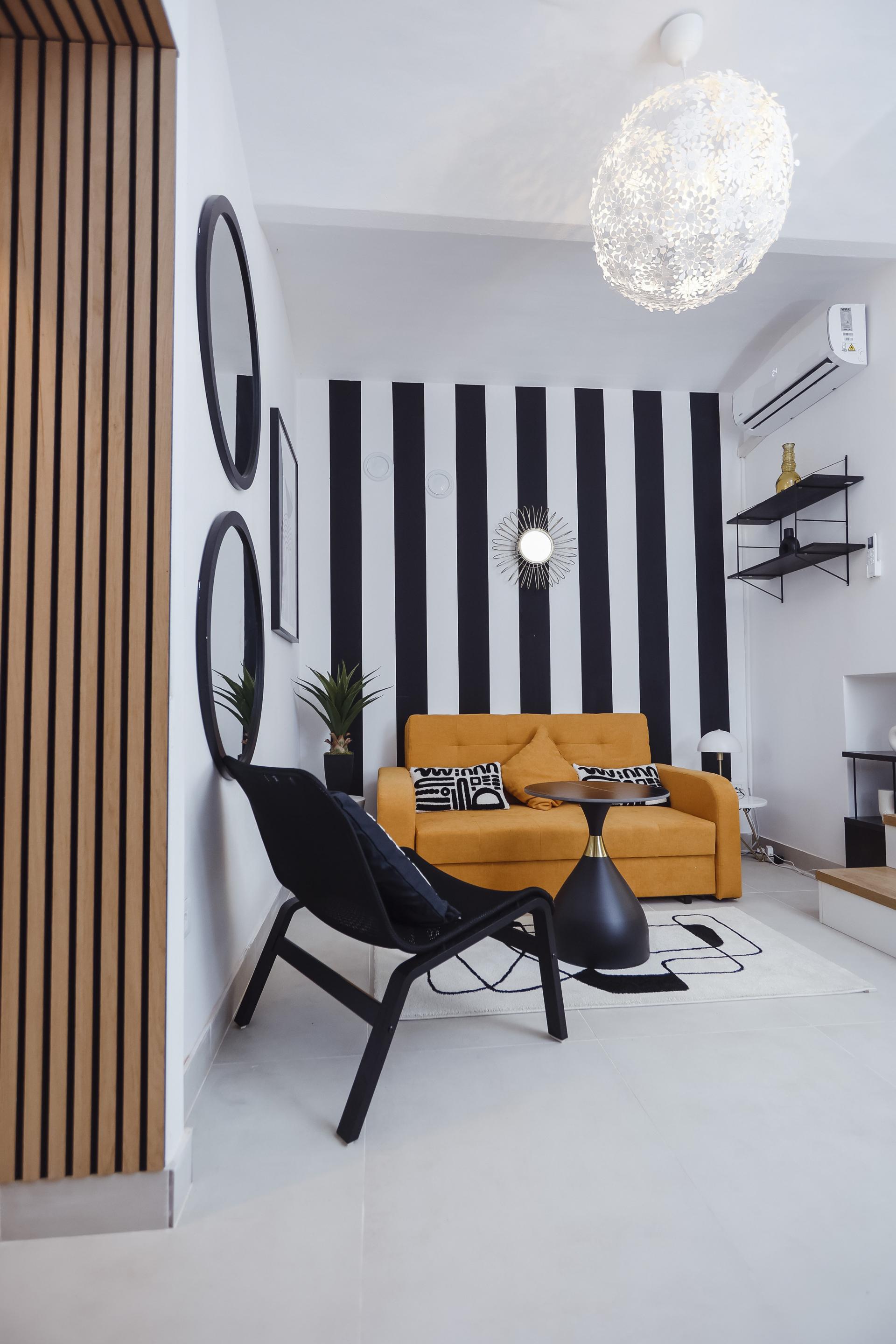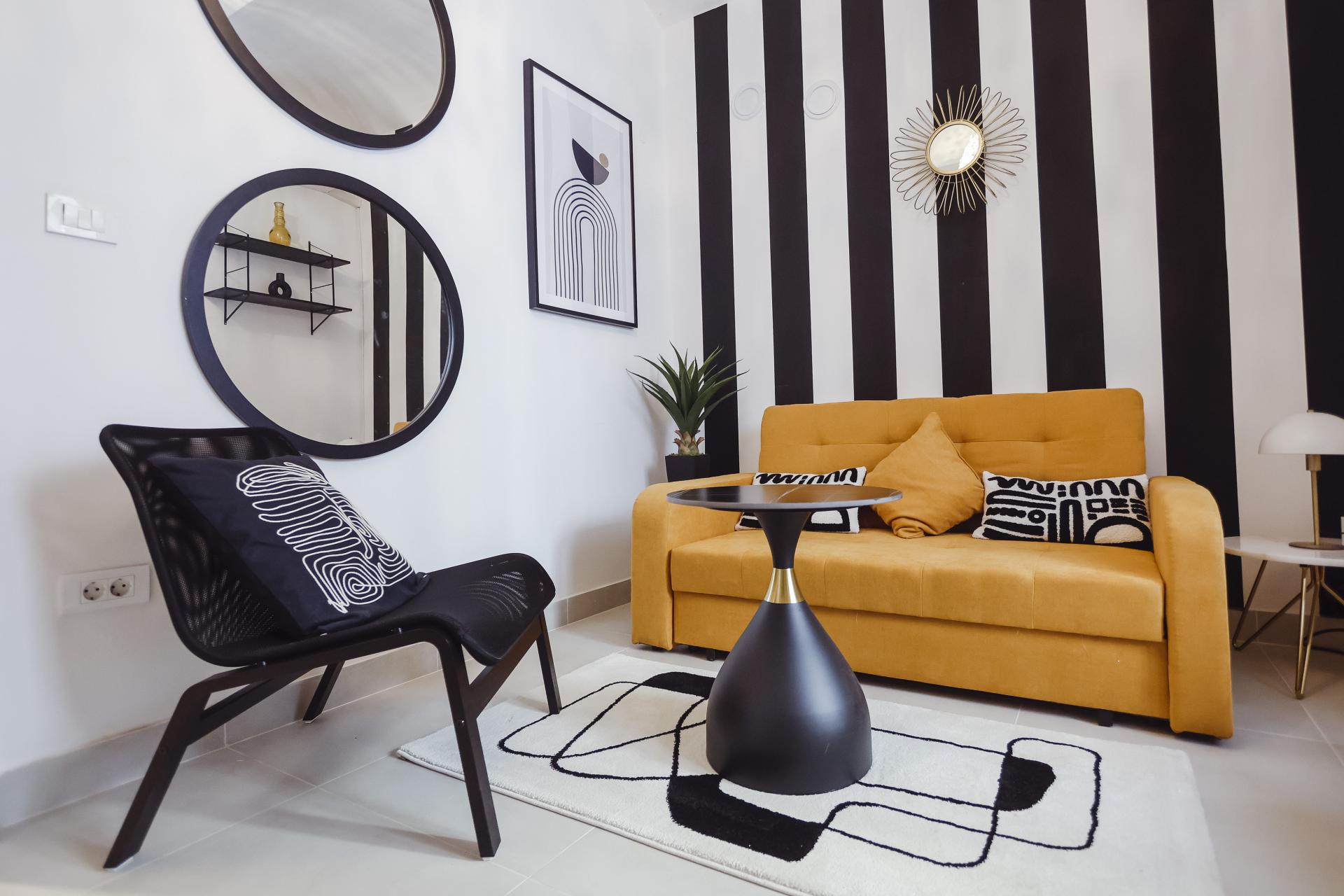 Jedan od upečatljivijih elemenata u stanu svakako su crno-bijele široke pruge na glavnom zidu, ali i dva velika okrugla ogledala jedno ispod drugog.