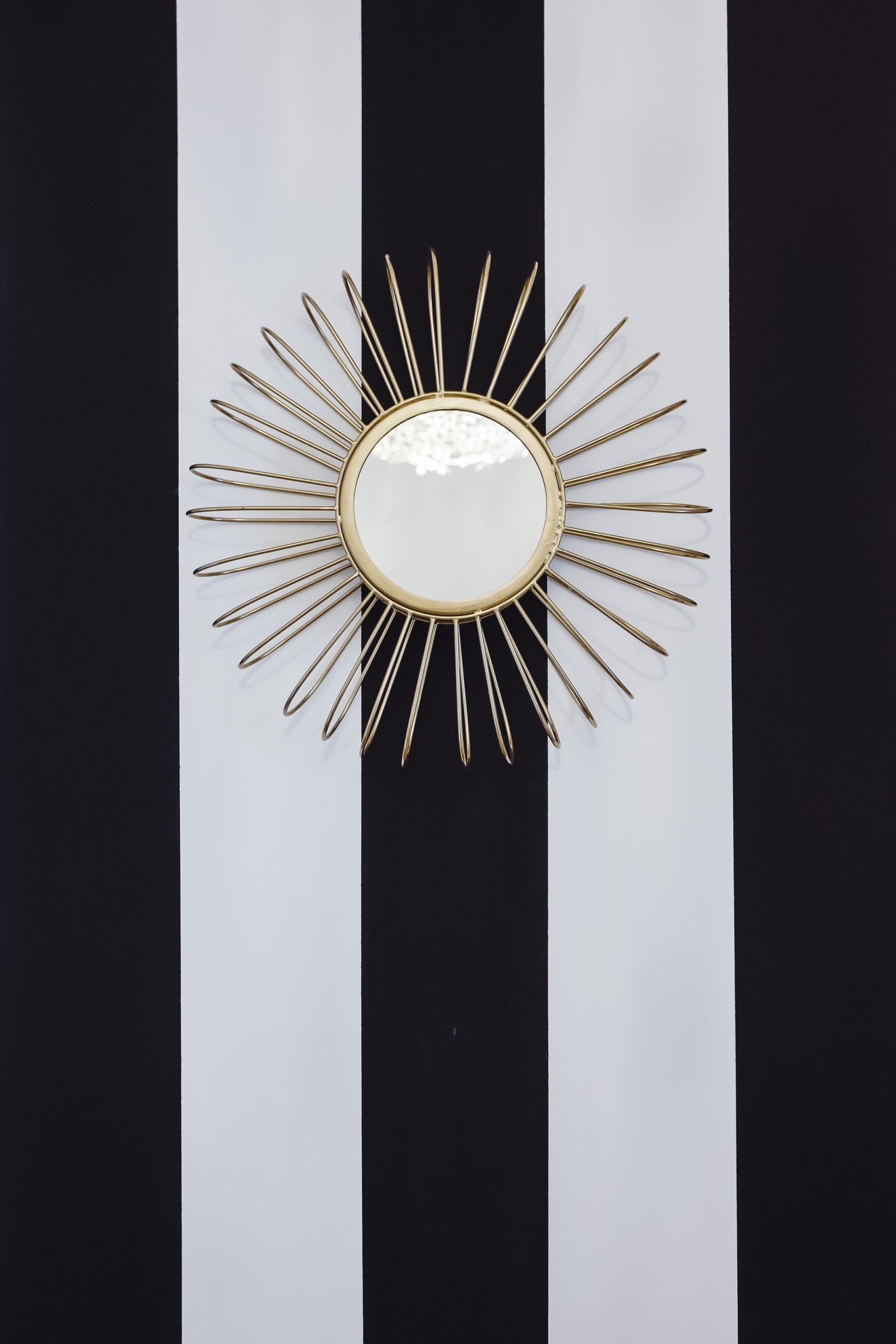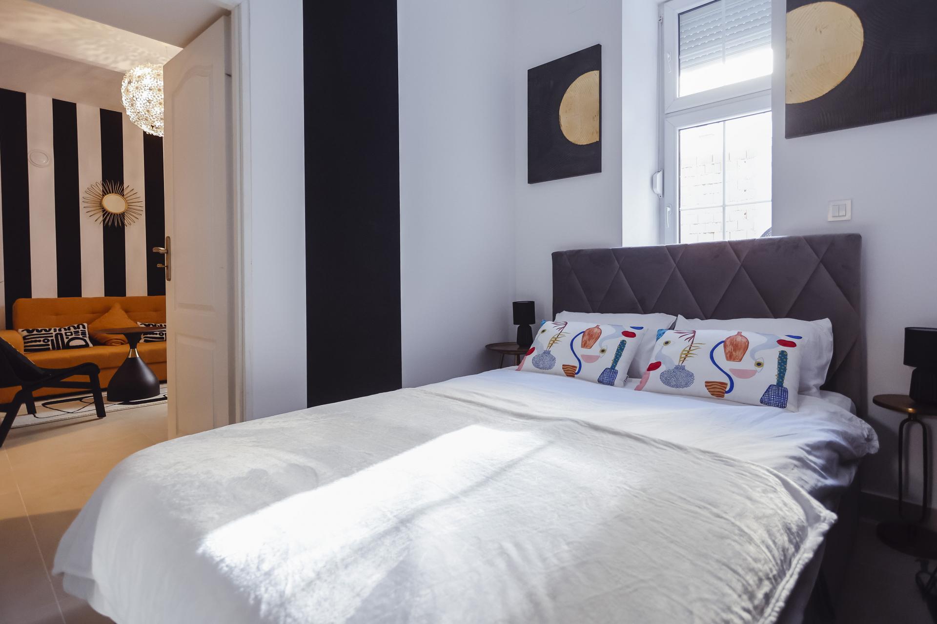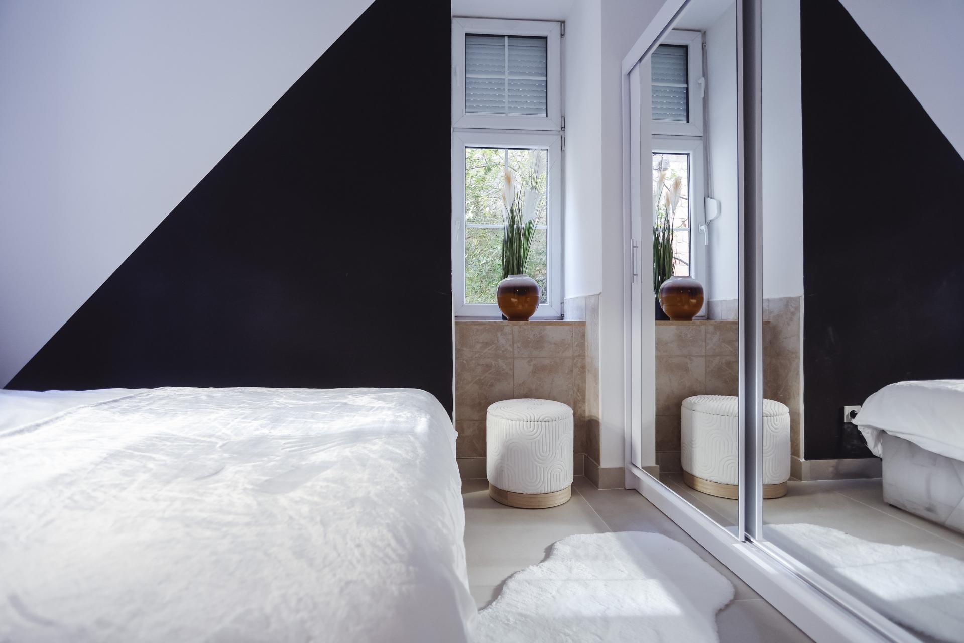 Jedan od upečatljivijih elemenata u stanu svakako su crno-bijele široke pruge na glavnom zidu, ali i dva velika okrugla ogledala jedno ispod drugog.