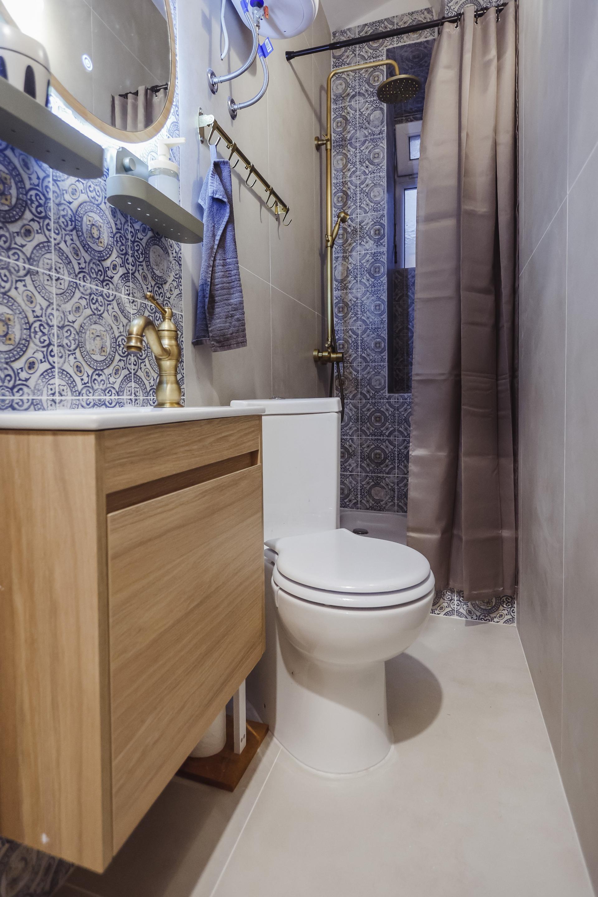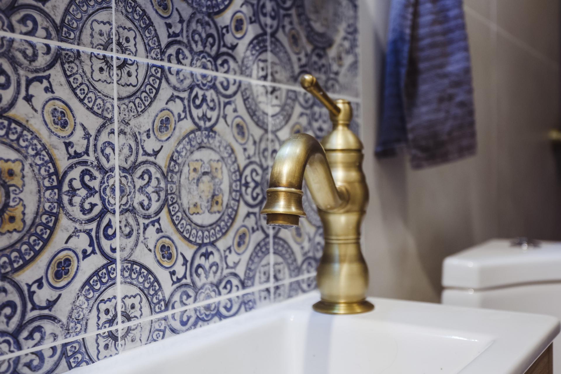 Zanimljiva je i kupaonica površine samo 2 četvorna metra koja je, unatoč tome, toliko ugodna i prostrana zbog prostora koji ide u dužinu te kombinacije zlatnih slavina i marokanskih šarenih pločica.