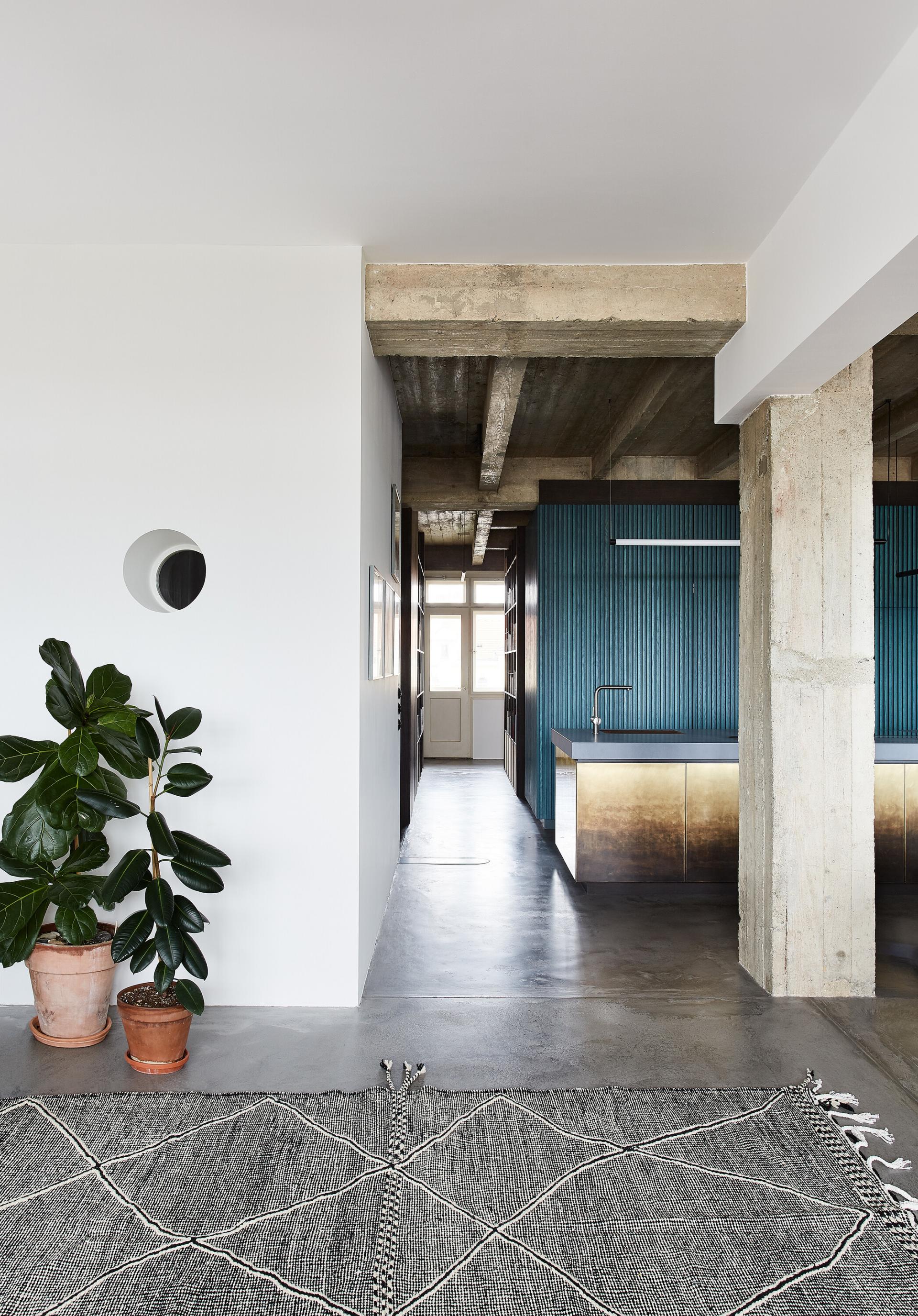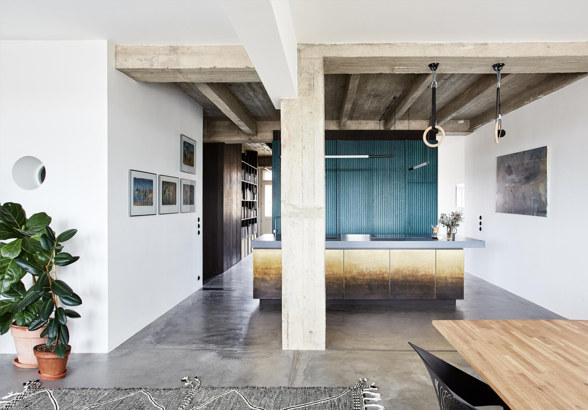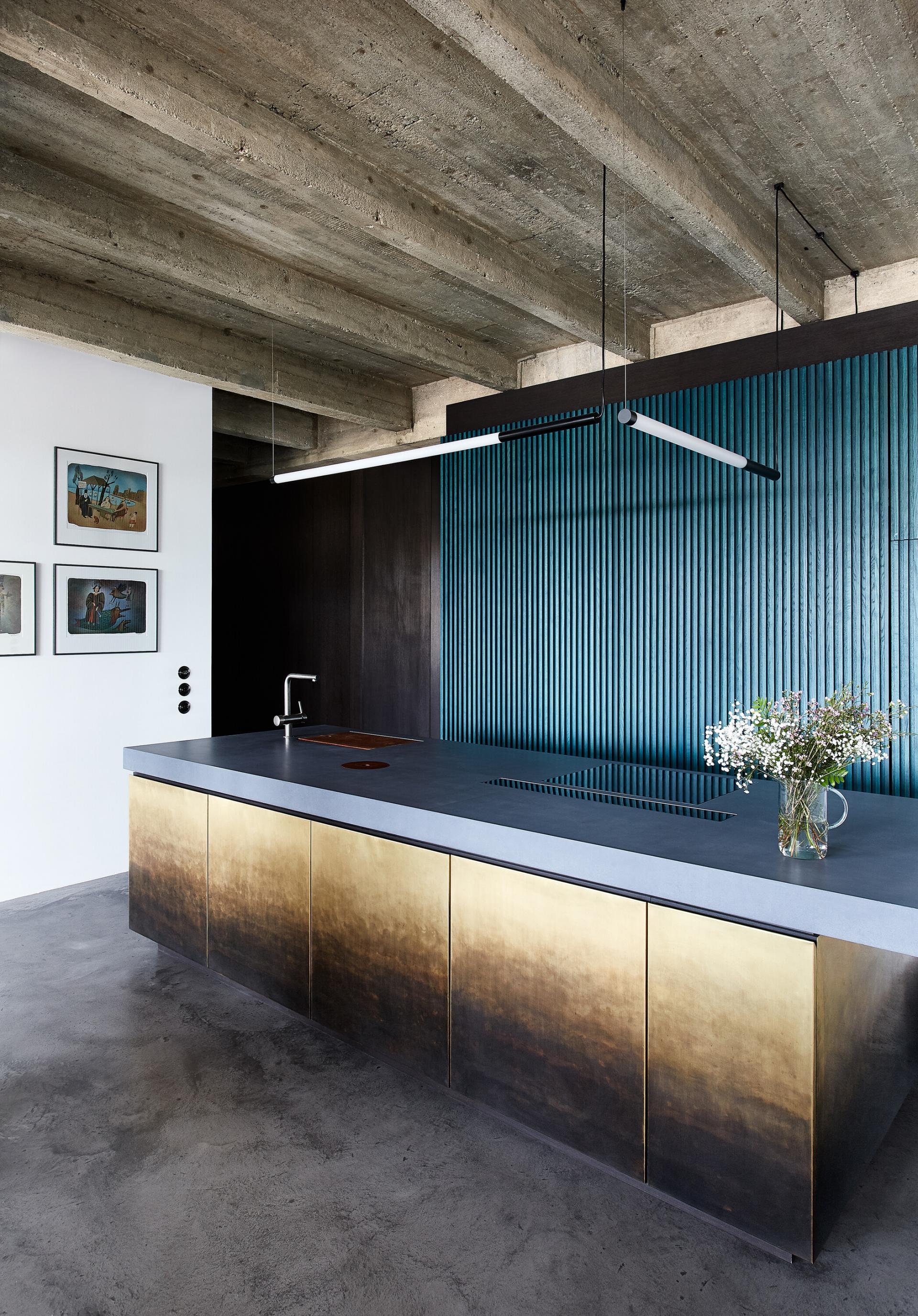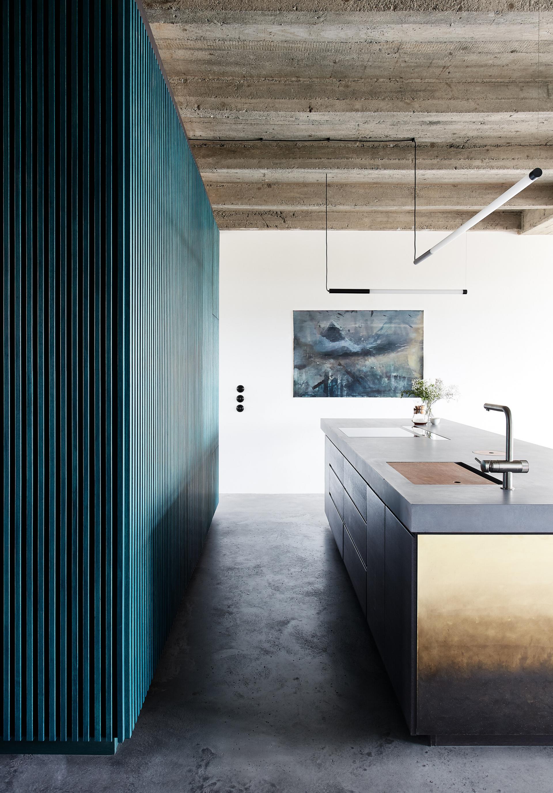 Središnji prostor je kuhinja s otokom obloženim patiniranim mesinganim pločama s čvrstom betonskom radnom površinom. Ta ista radna površina ima vješto skrivene otvore za razvrstavanje biološkog otpada.