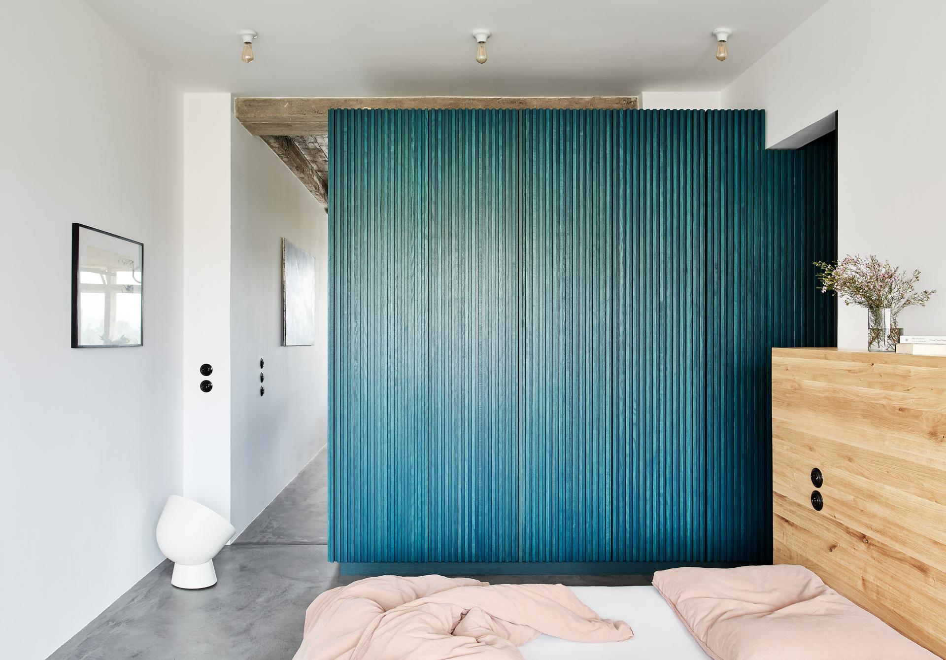 Spavaća soba se nalazi iza zelene kutije. Ima tri ulaza. Uzglavlje kreveta koristi postojeći masivni dimnjak kao pregradu. U stanu se također nalazi i knjižnica između glavne kupaonice i spavaće sobe.