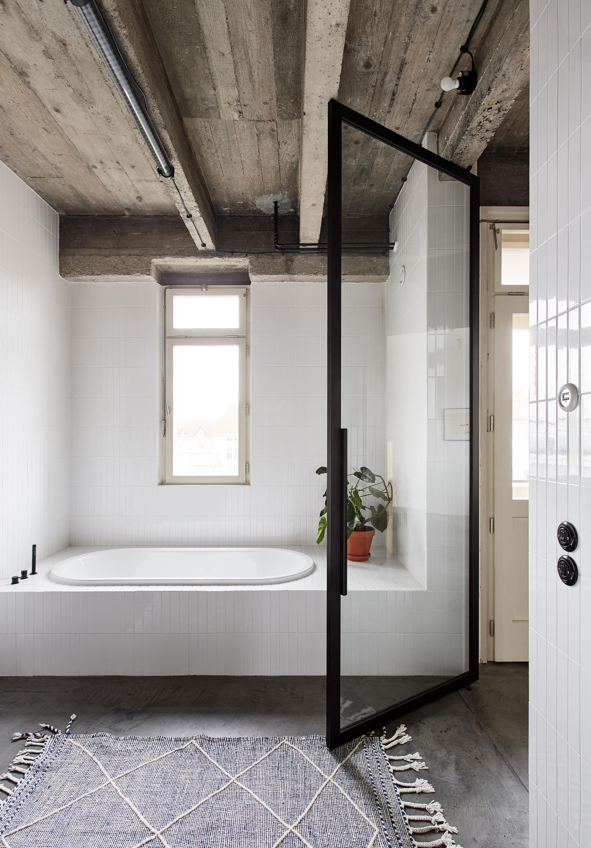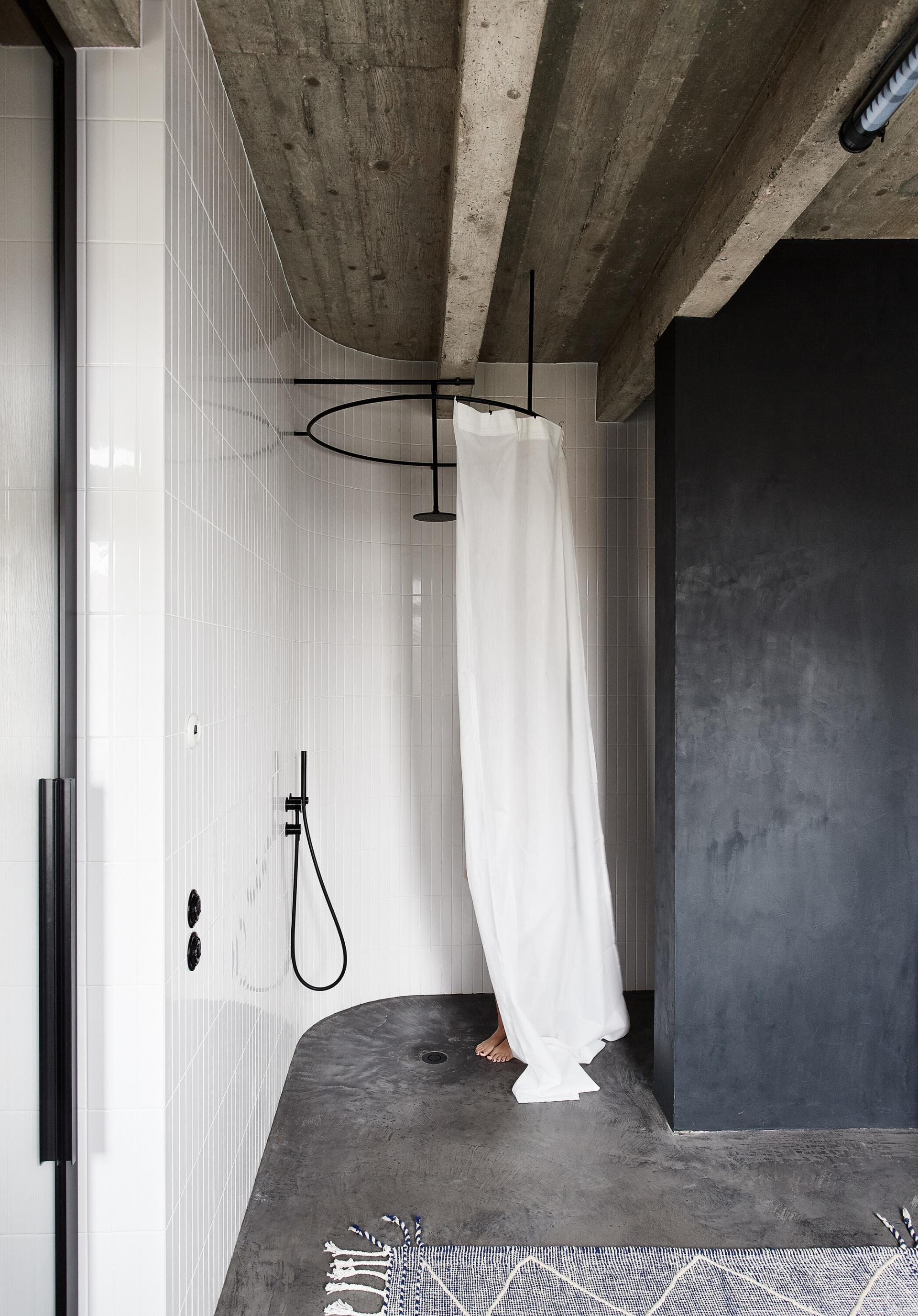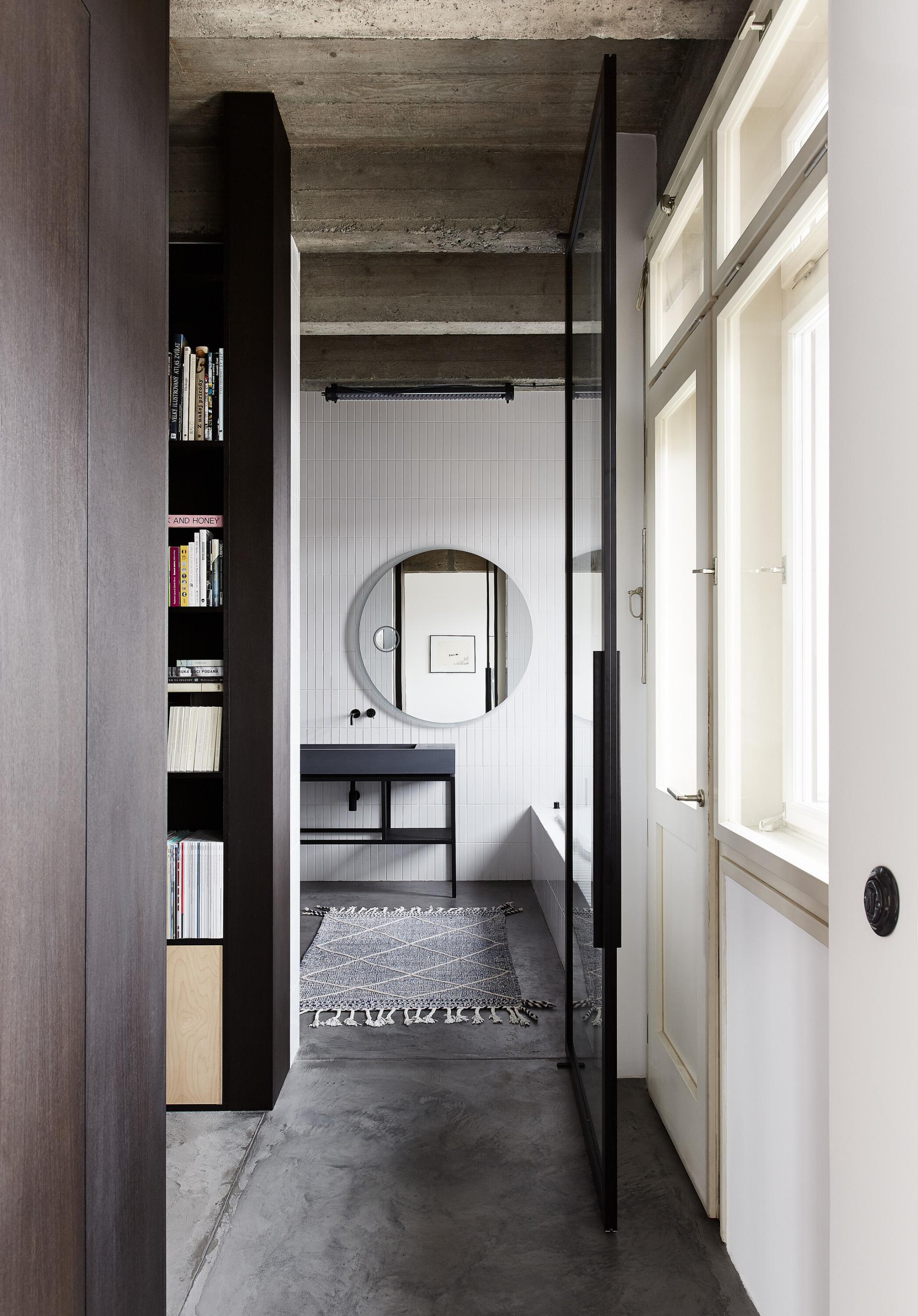 Popratna tema koncepta bio je izbor podnih obloga koje su trebale biti ujednačene u cijelom stanu, uključujući kupaonice i tuš kabine. Jedna od opcija je bio terazzo pod, no nakon statičke analize odluka je pala na za četkani betonski estrih.