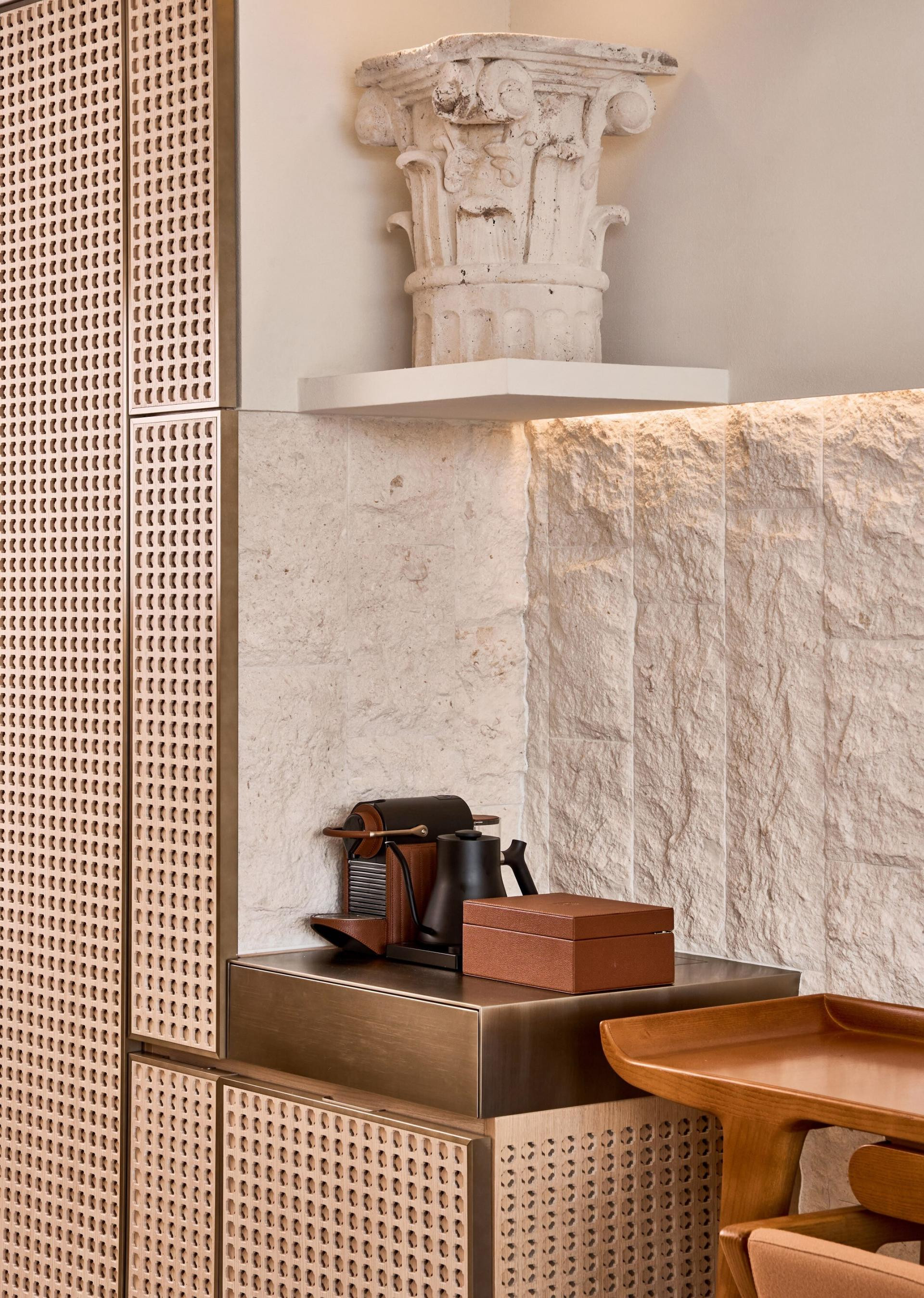 Objedinjujući kozmopolitski utjecaj Mletačke Republike i dubrovačke baštine, u sobama su postavljeni ikonični komadi namještaja Gio Pontija – modernističkog arhitekta čiji je minimalistički, ali profinjeni dizajn stolova i stolica kroz spoj masivnog drva i zlatnih metalnih struktura pravi hommage jednoj od najutjecajnijih figura 20. stoljeća.