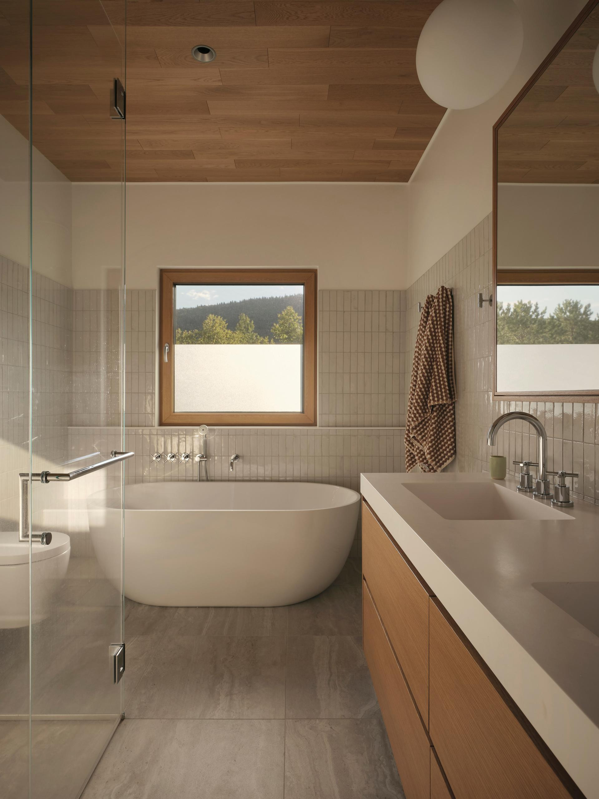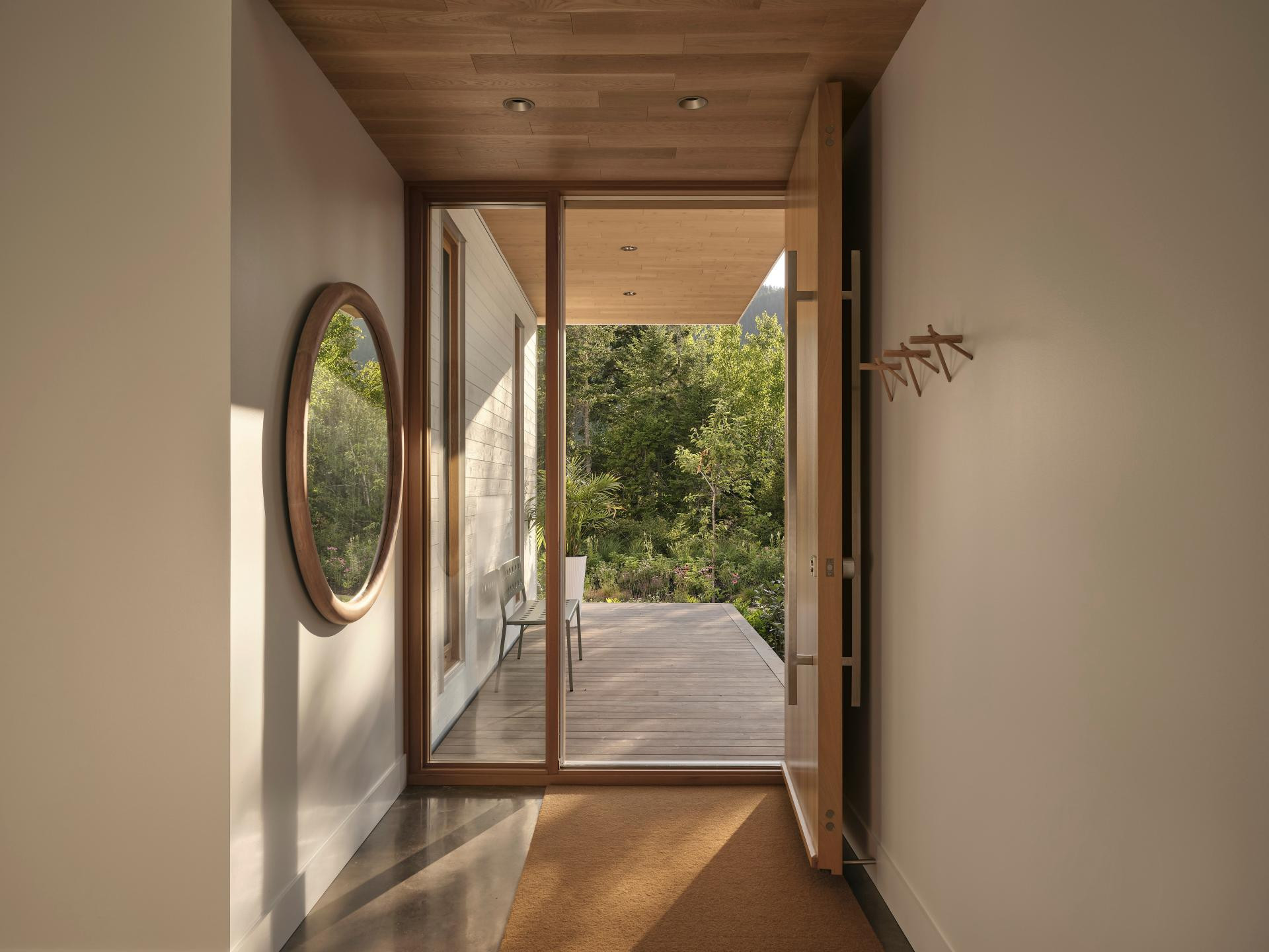 Jedna od ključnih ideja projekta jest neprekinut dijalog između interijera i eksterijera. Velika veranda i pergola s vidljivom drvenom konstrukcijom produžuju glavni volumen kuće i stvaraju snažnu horizontalnu liniju koja naglašava horizont i povezuje kuću s jezerom. U unutrašnjosti prevladavaju svijetlo drvo, bijele površine i beton, stvarajući smirenu atmosferu u kojoj prirodna svjetlost igra glavnu ulogu. Materijali korišteni izvana diskretno se nastavljaju unutra, čime se postiže osjećaj prostorne i vizualne kohezije.