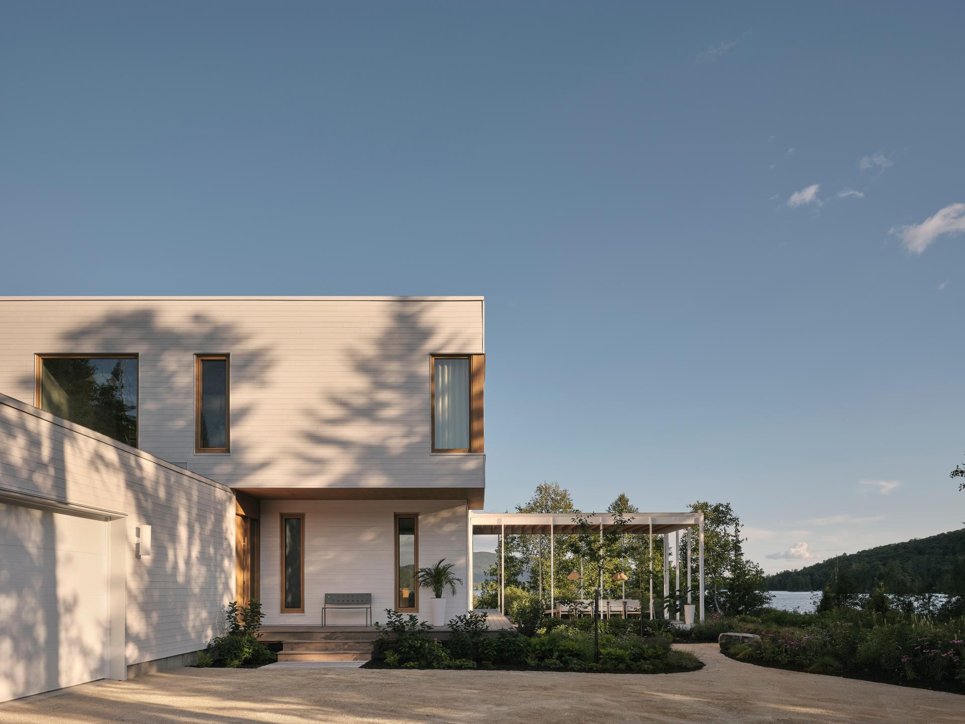 Kuća je osmišljena kao skladan niz kubičnih volumena s ravnim krovovima, pažljivo postavljenih kako bi se minimalizirao njihov vizualni utjecaj na prirodu. Svaka cjelina usmjerena je prema jezeru, hvatajući svjetlost i pogled, dok se naglasak stavlja na jednostavnost forme i čistoću linija. Vanjska obloga izrađena je od lokalno proizvedenog bijelog drva, unaprijed obrađenog kako bi odolijevalo vremenskim uvjetima.