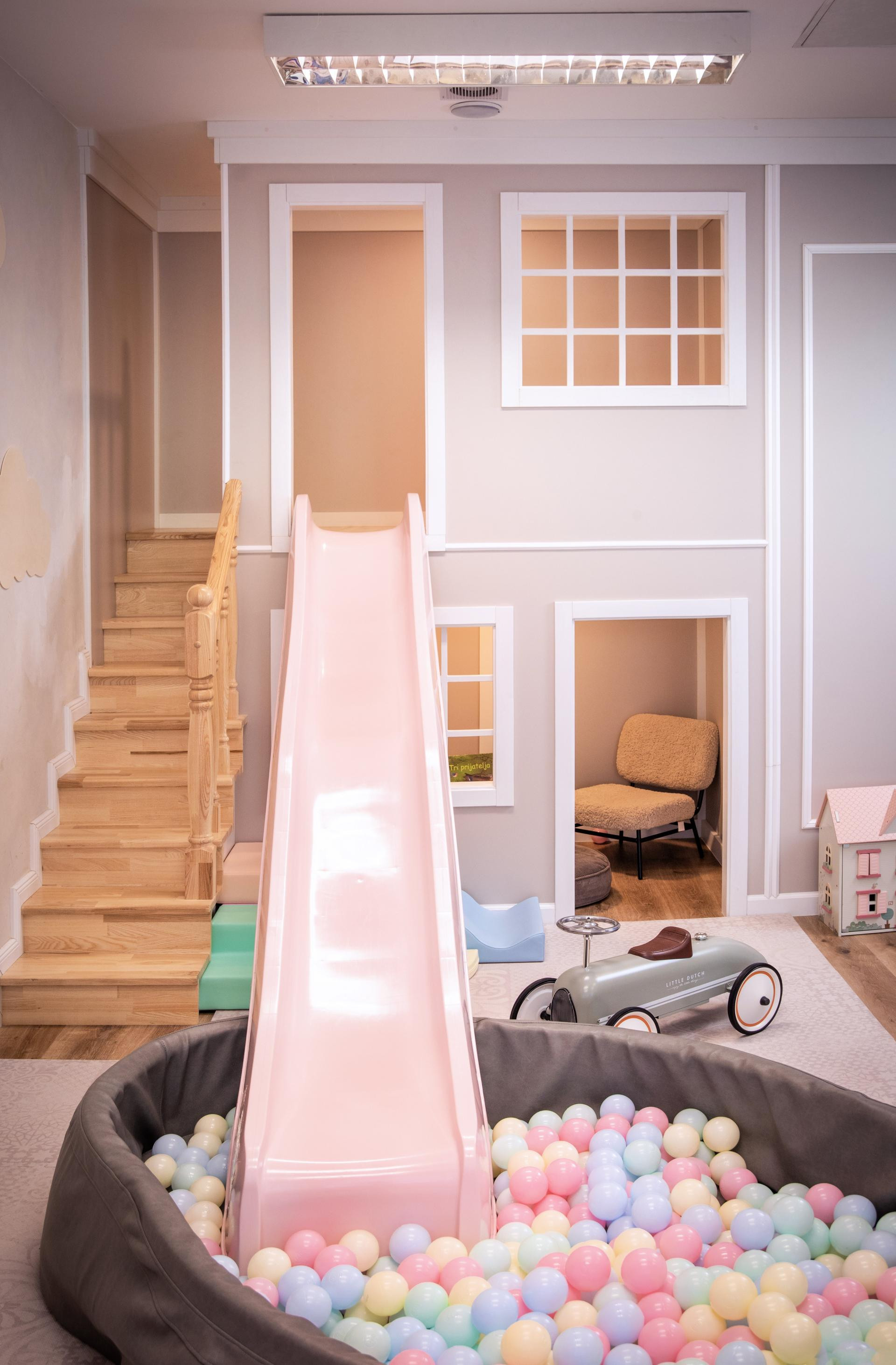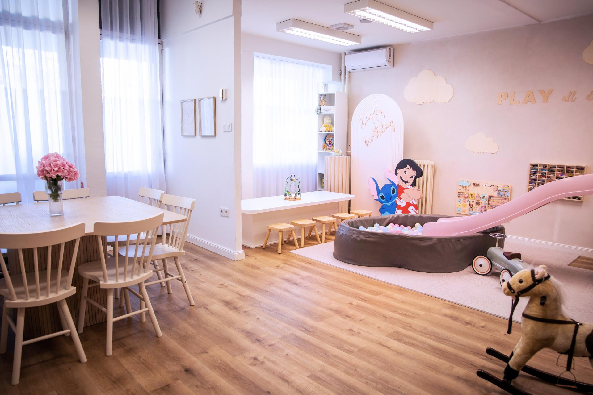 Rođendaonica je pažljivo podijeljena u zone, pa su tu kutak za igru s kućicom i toboganom, kreativna zona, fotokutak te udoban prostor za roditelje s velikim stolom i potpuno opremljenom kuhinjom.
