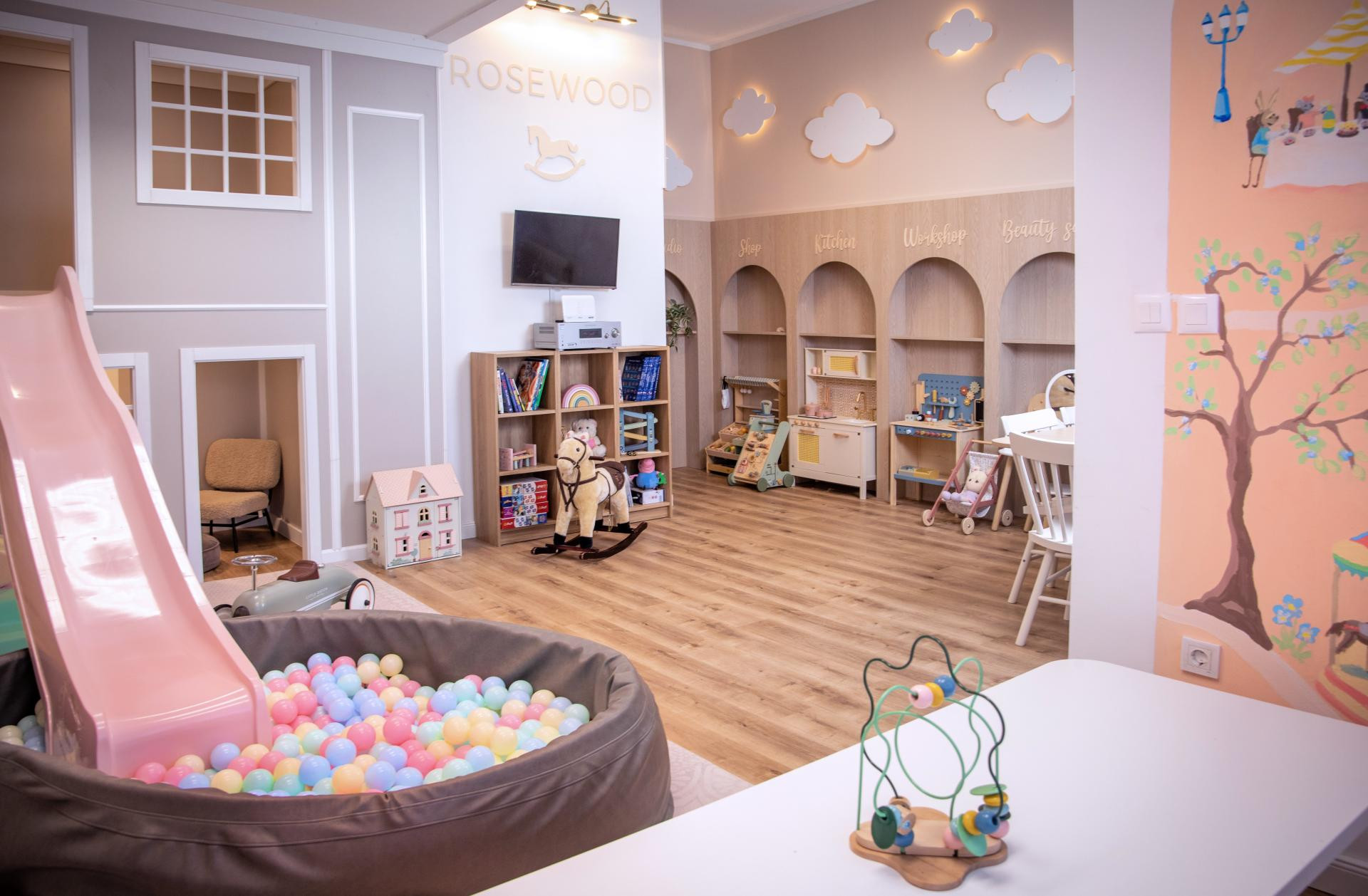 Namještaj je izrađen po mjeri djece, njihovih najvažnijih klijenata, pa su u prostoru niski stolovi, stabilne police, skriveni priključci i mekani podovi. U Rosewoodu se, kažu, djeca mogu slobodno kretati i istraživati bez bojazni, dok roditelji istovremeno uživaju u ugodnom, funkcionalnom ambijentu.