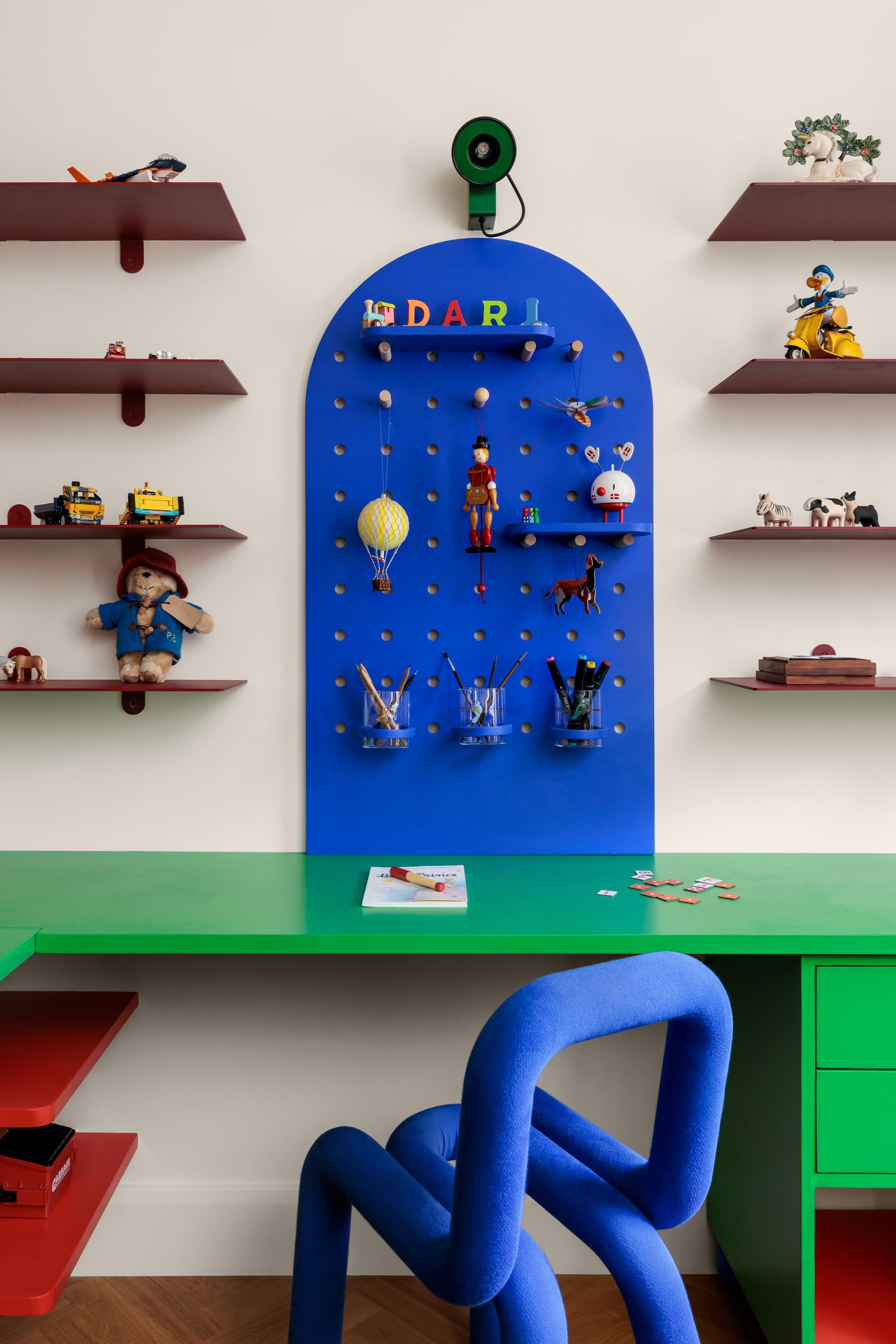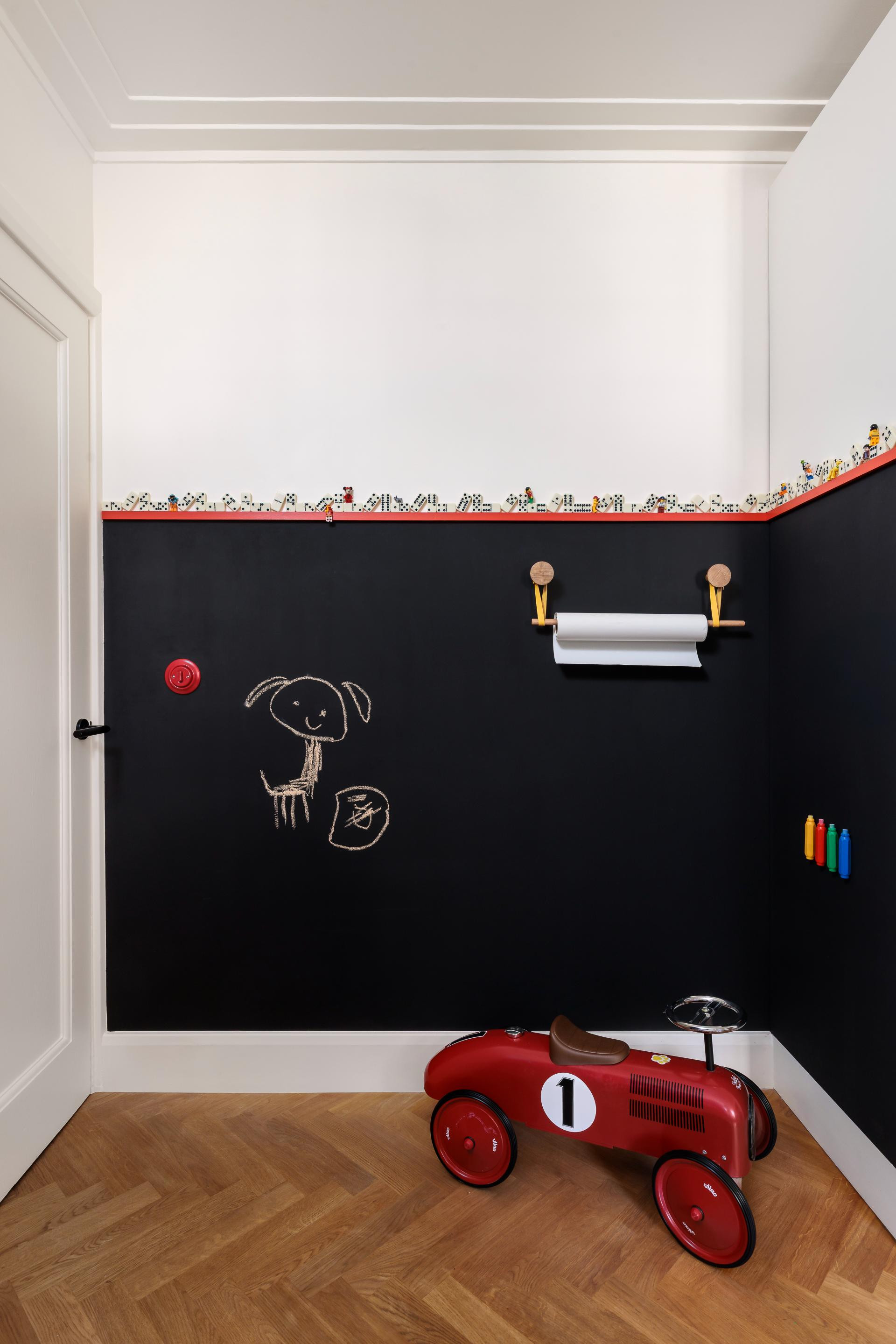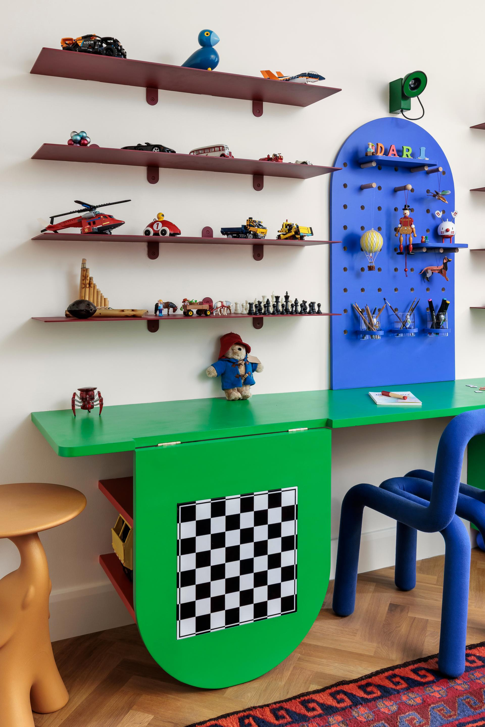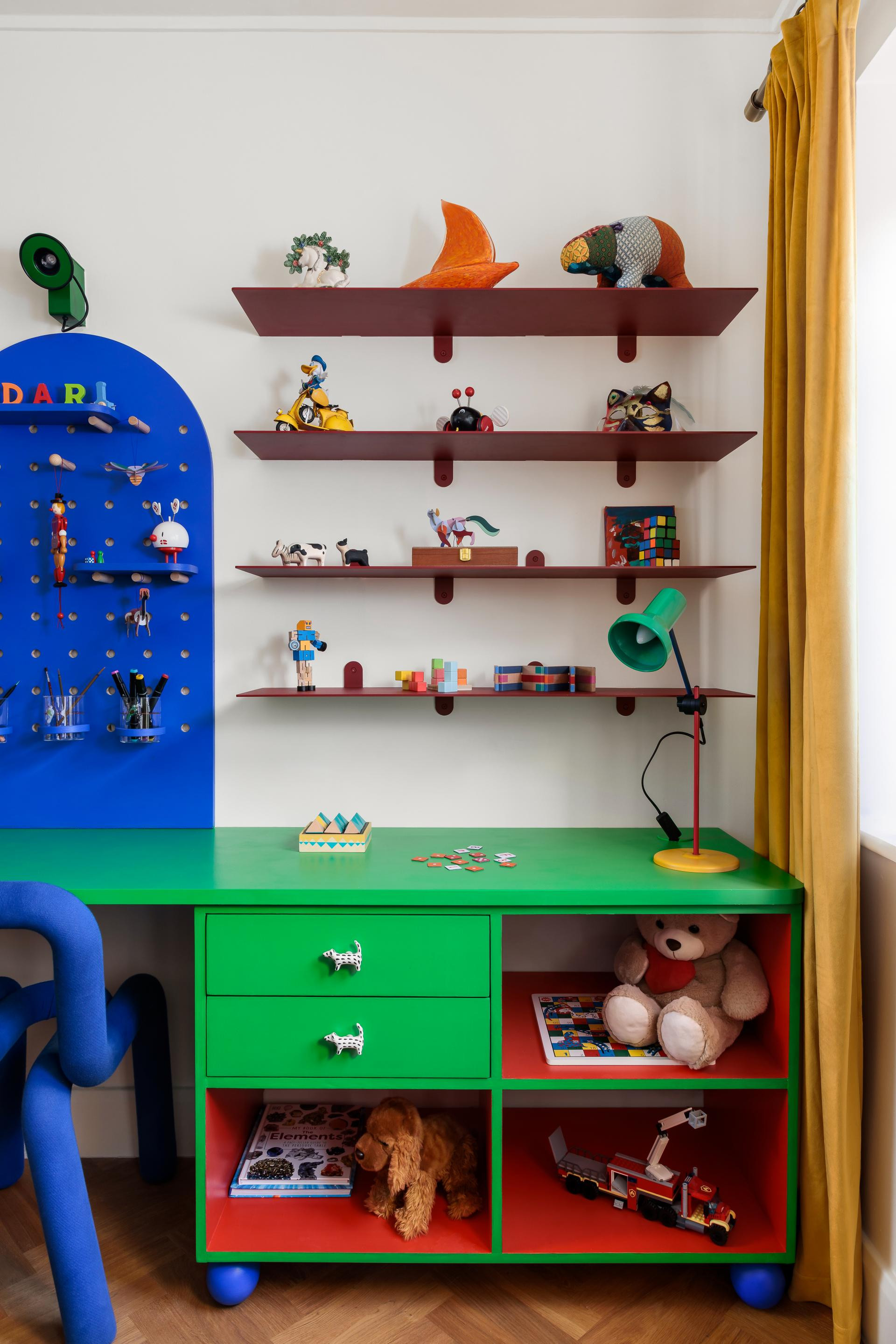 Magnetska ploča za kredu, uokvirena domino i LEGO elementima, potiče kreativno izražavanje, dok dispenser za papir omogućuje jednostavno crtanje, vježbanje riječi ili izlaganje novih remek-djela. Za praktičnost i kontrolu troškova, odabrana je gotova polica za knjige, koju su dizajneri prilagodili dodavanjem nogu i bojom uskladili sa sobom. Perzijski tepih, jarkih boja i s geometrijskim uzorcima, dodatno upotpunjuje sobu, a ručno izrađeni crveni keramički prekidač svjetla daje završni, razigrani detalj.