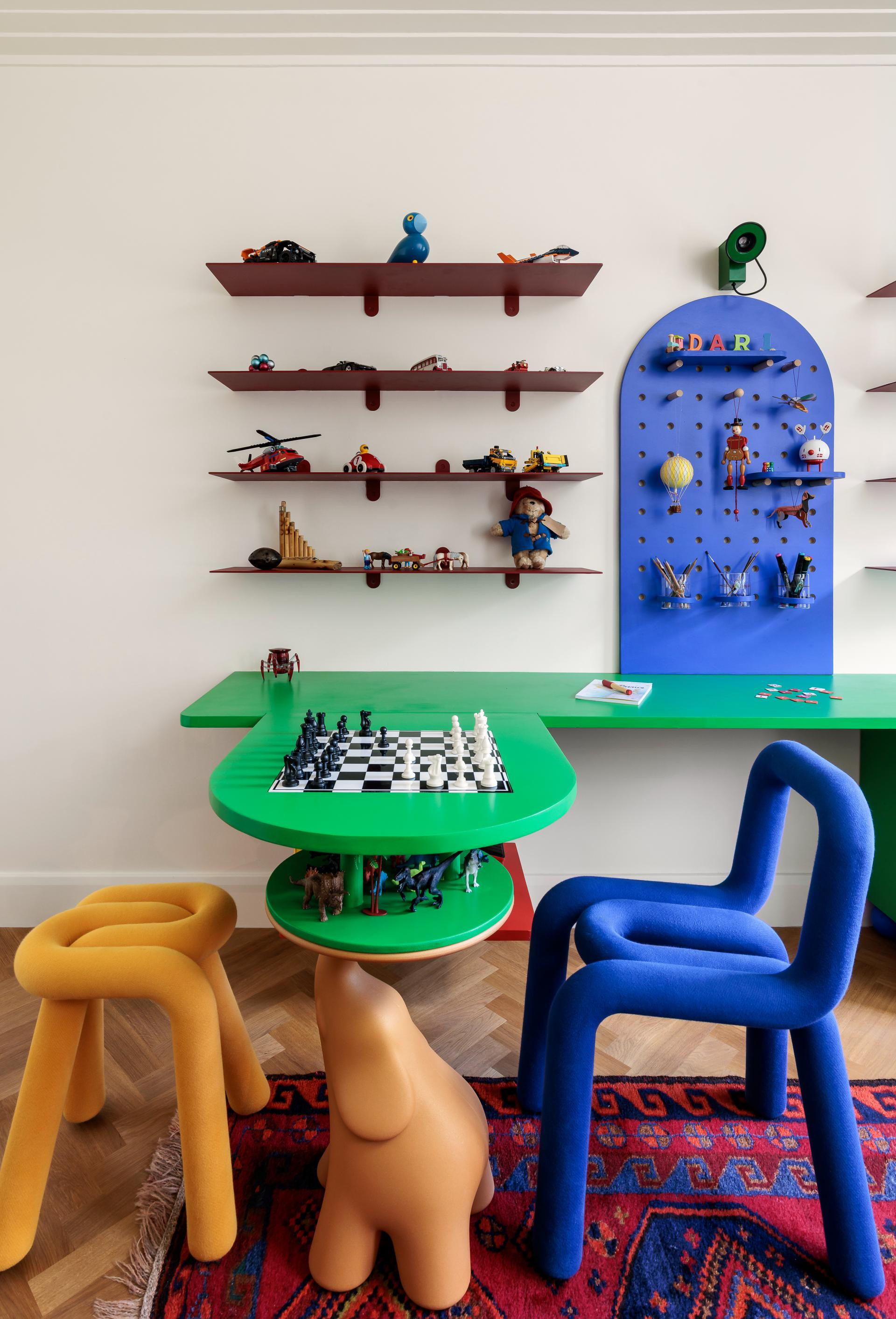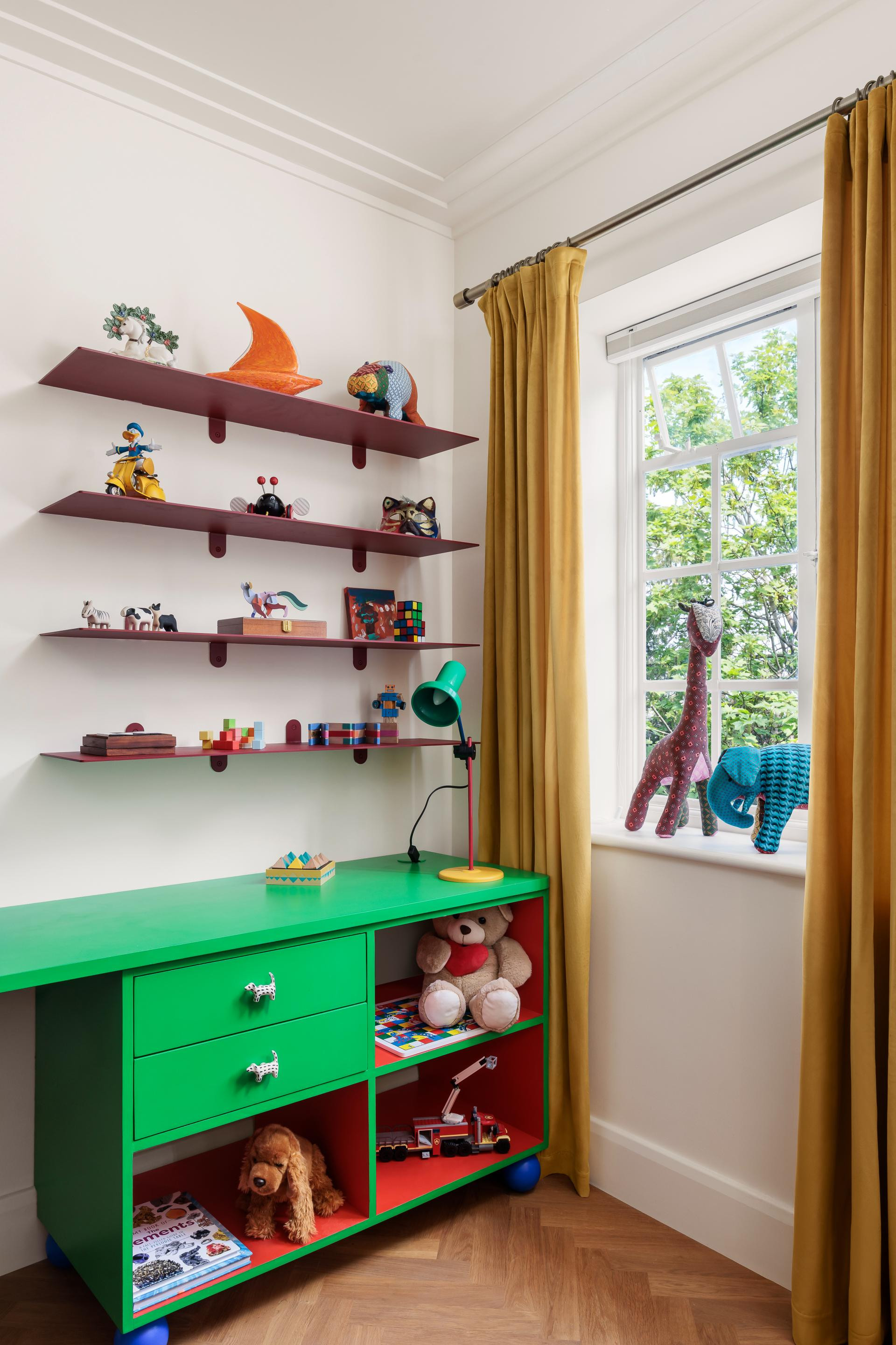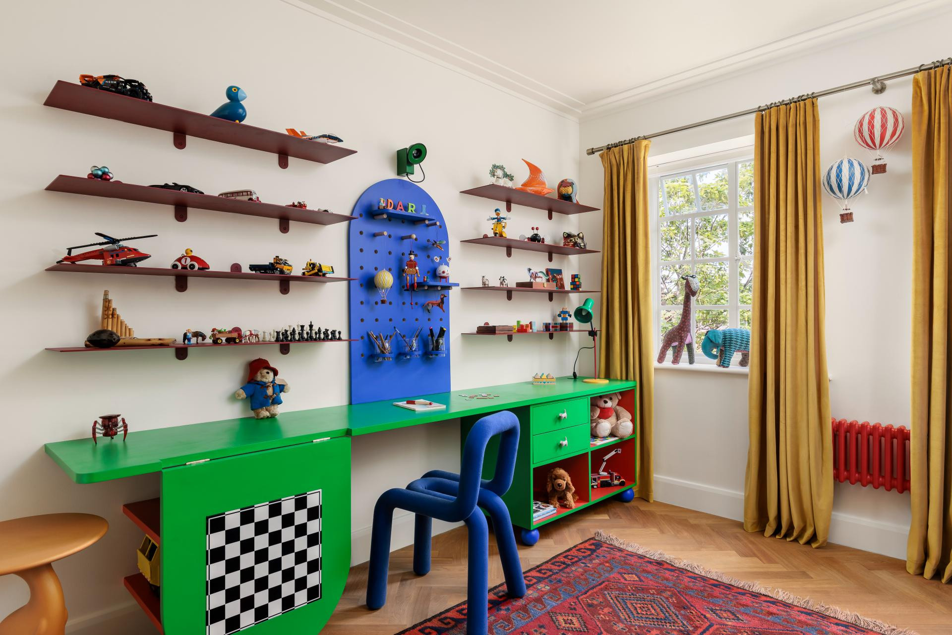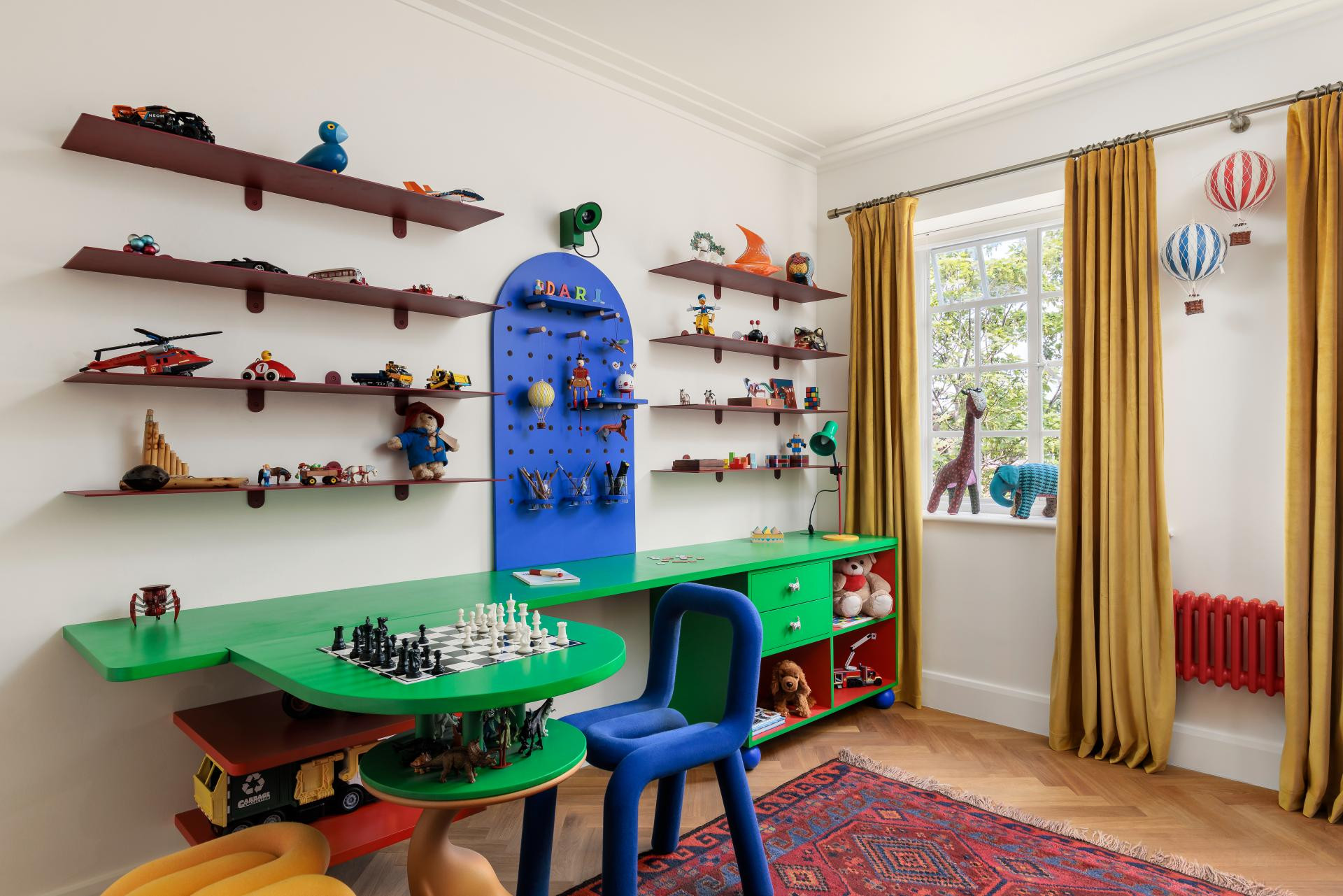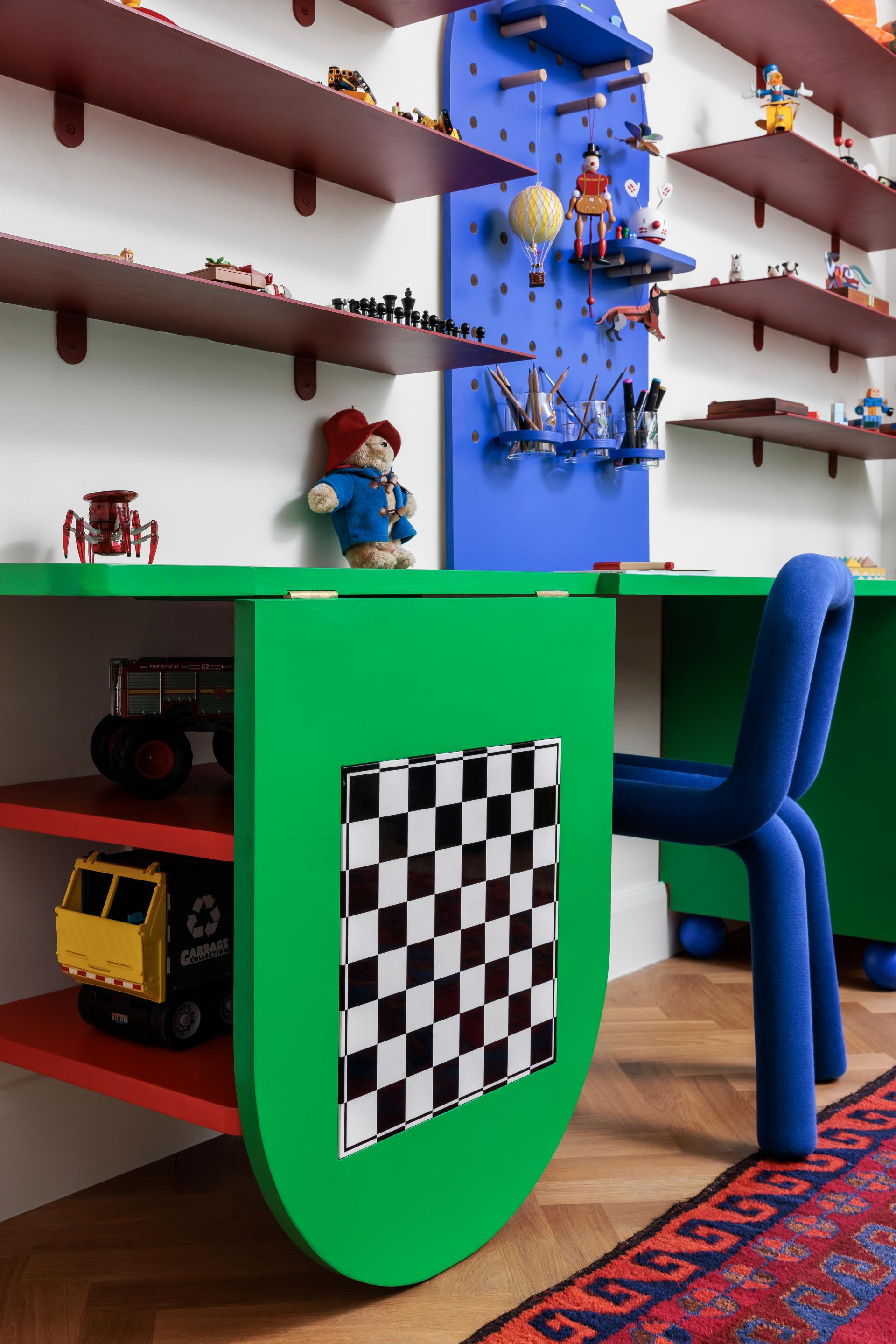 Magnetska ploča za kredu, uokvirena domino i LEGO elementima, potiče kreativno izražavanje, dok dispenser za papir omogućuje jednostavno crtanje, vježbanje riječi ili izlaganje novih remek-djela. Za praktičnost i kontrolu troškova, odabrana je gotova polica za knjige, koju su dizajneri prilagodili dodavanjem nogu i bojom uskladili sa sobom. Perzijski tepih, jarkih boja i s geometrijskim uzorcima, dodatno upotpunjuje sobu, a ručno izrađeni crveni keramički prekidač svjetla daje završni, razigrani detalj.