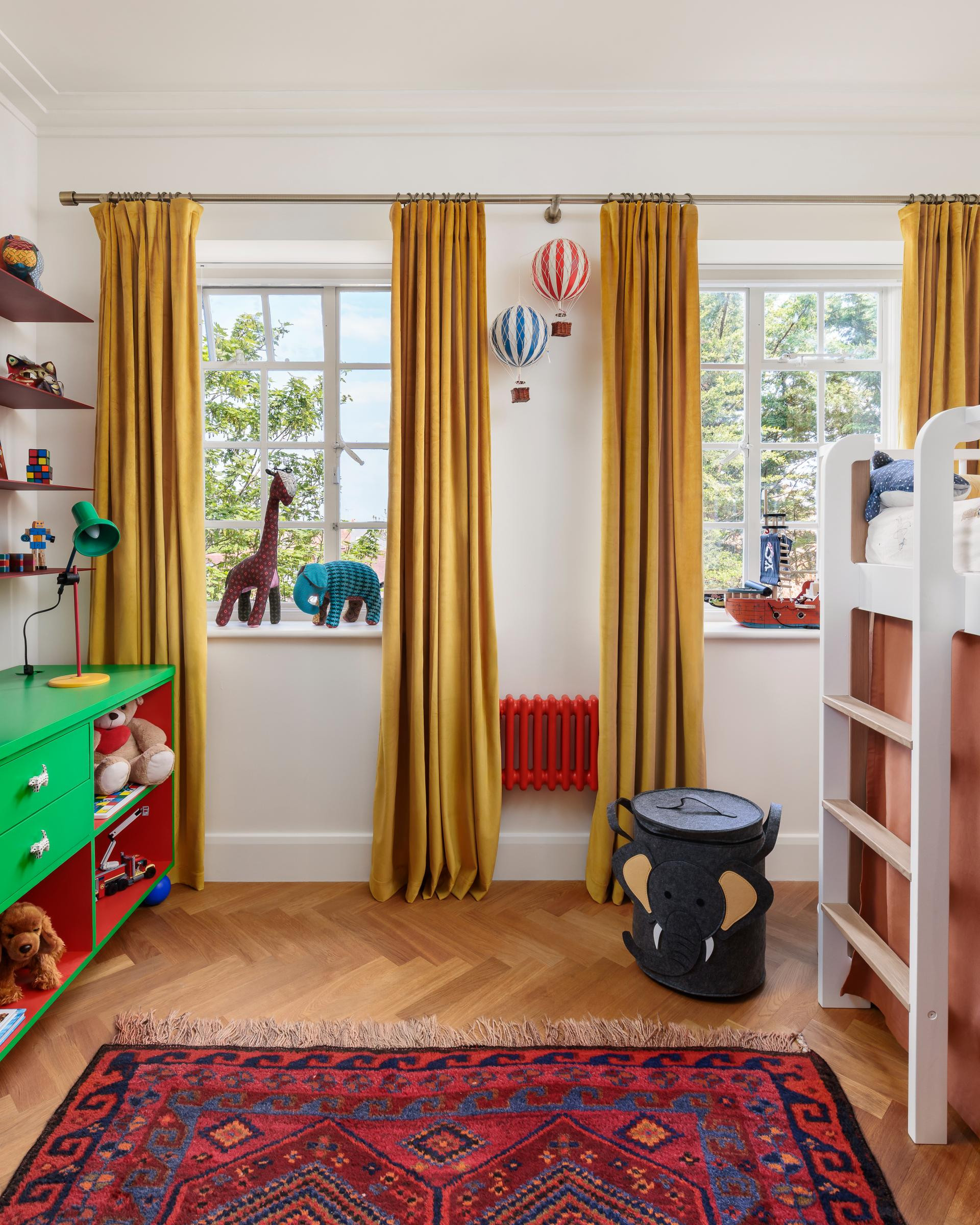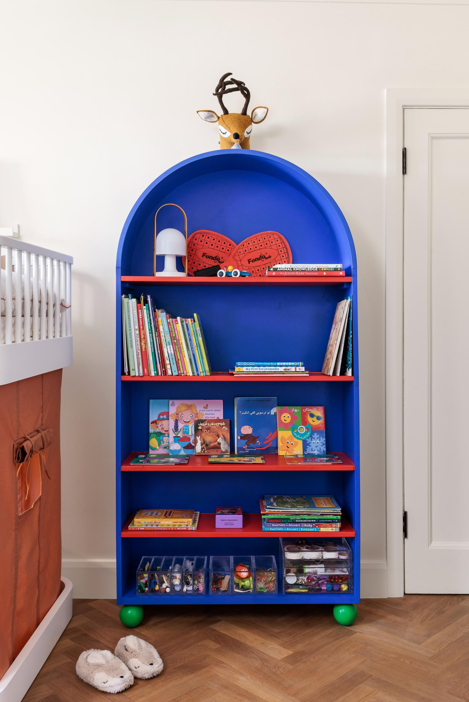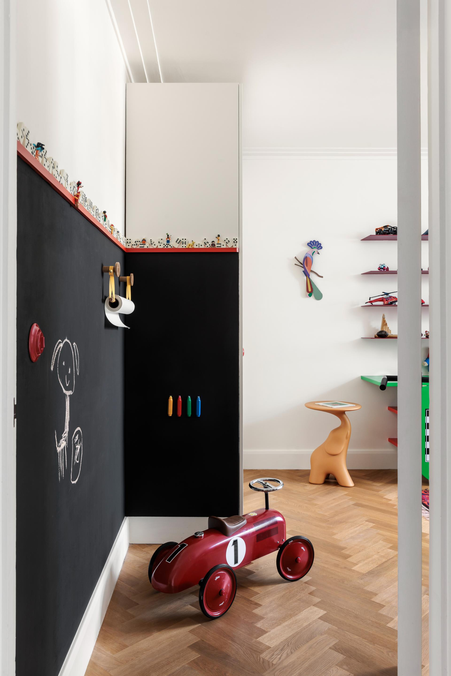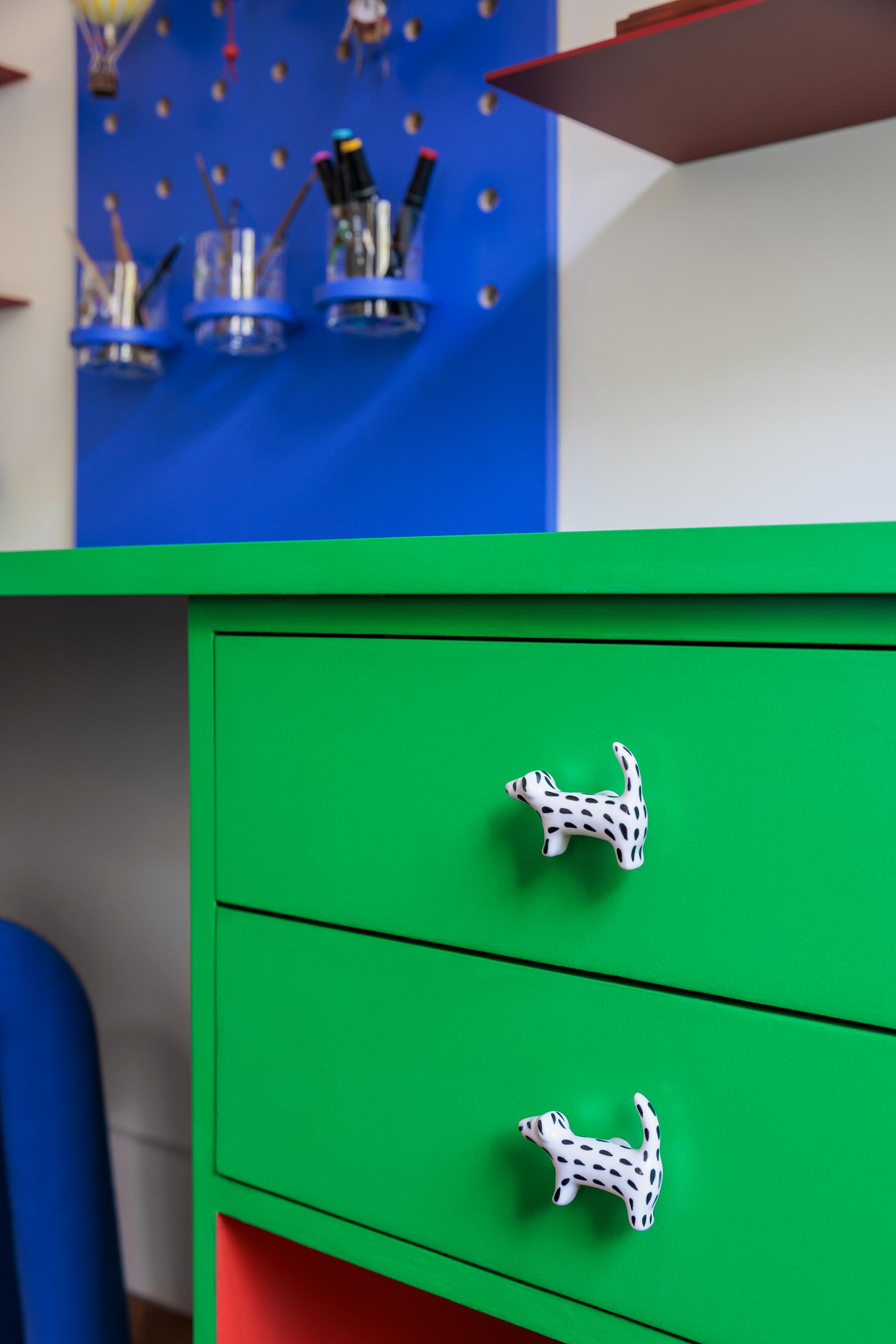 Magnetska ploča za kredu, uokvirena domino i LEGO elementima, potiče kreativno izražavanje, dok dispenser za papir omogućuje jednostavno crtanje, vježbanje riječi ili izlaganje novih remek-djela. Za praktičnost i kontrolu troškova, odabrana je gotova polica za knjige, koju su dizajneri prilagodili dodavanjem nogu i bojom uskladili sa sobom. Perzijski tepih, jarkih boja i s geometrijskim uzorcima, dodatno upotpunjuje sobu, a ručno izrađeni crveni keramički prekidač svjetla daje završni, razigrani detalj.