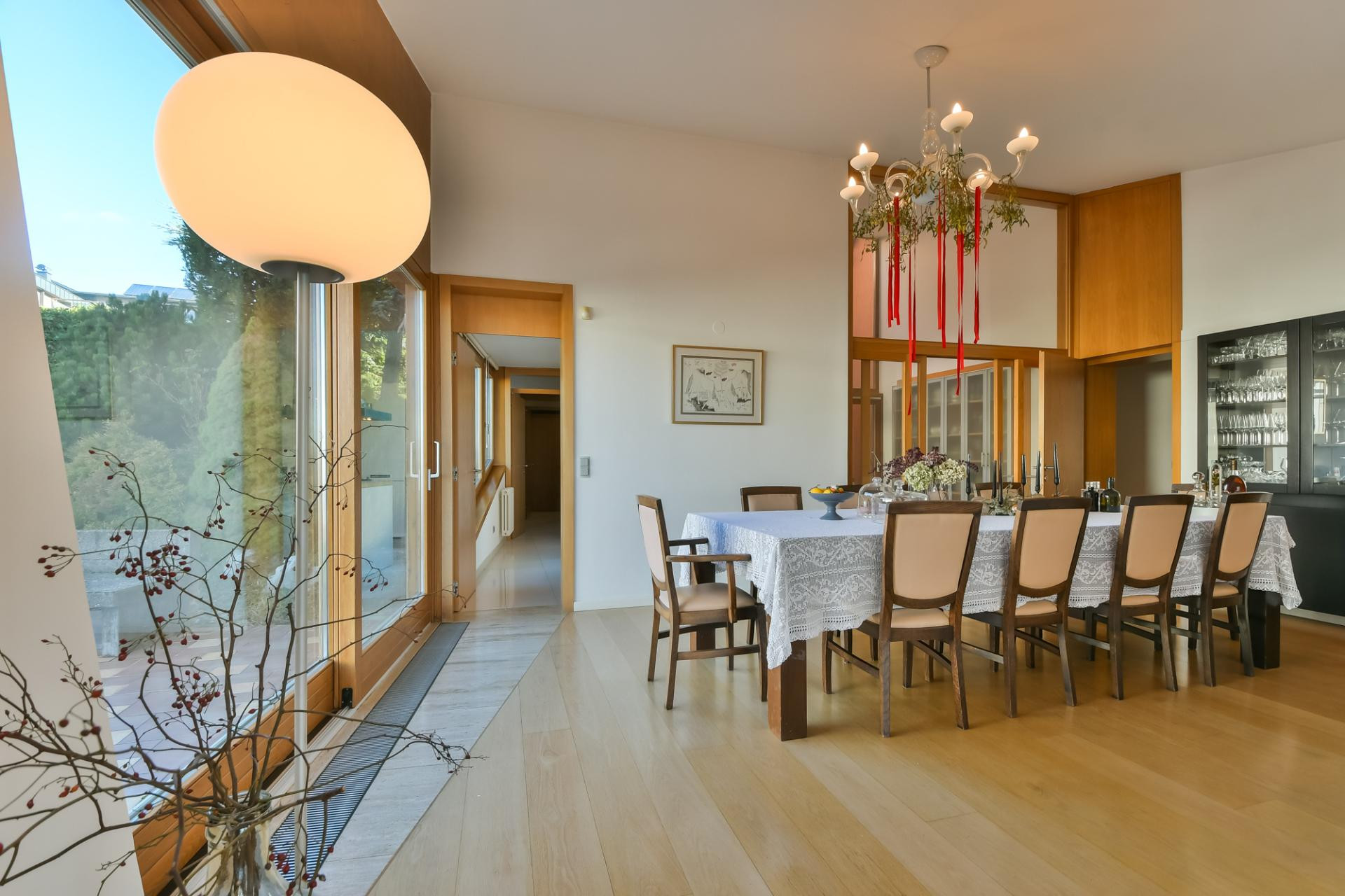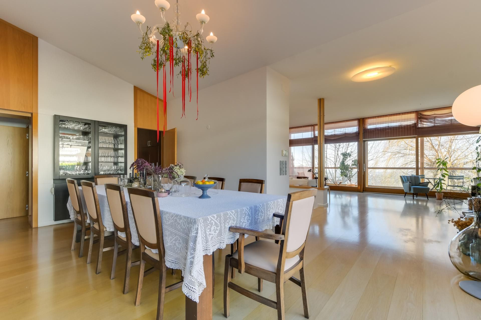 Srce doma čini prostrana blagovaonica s panoramskim pogledom na grad, opremljena dugim drvenim stolom koji bez poteškoća prima deset osoba. Kuhinja je potpuno opremljena, izvedena u svijetlim tonovima s toplim drvenim detaljima. Poznato je da pjevačica voli spajati umjetnost i funkcionalnost, stoga se s razlogom očekuje da će upravo ovaj prostor uskoro dobiti njezin prepoznatljiv osobni pečat.