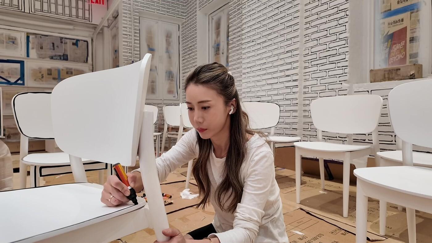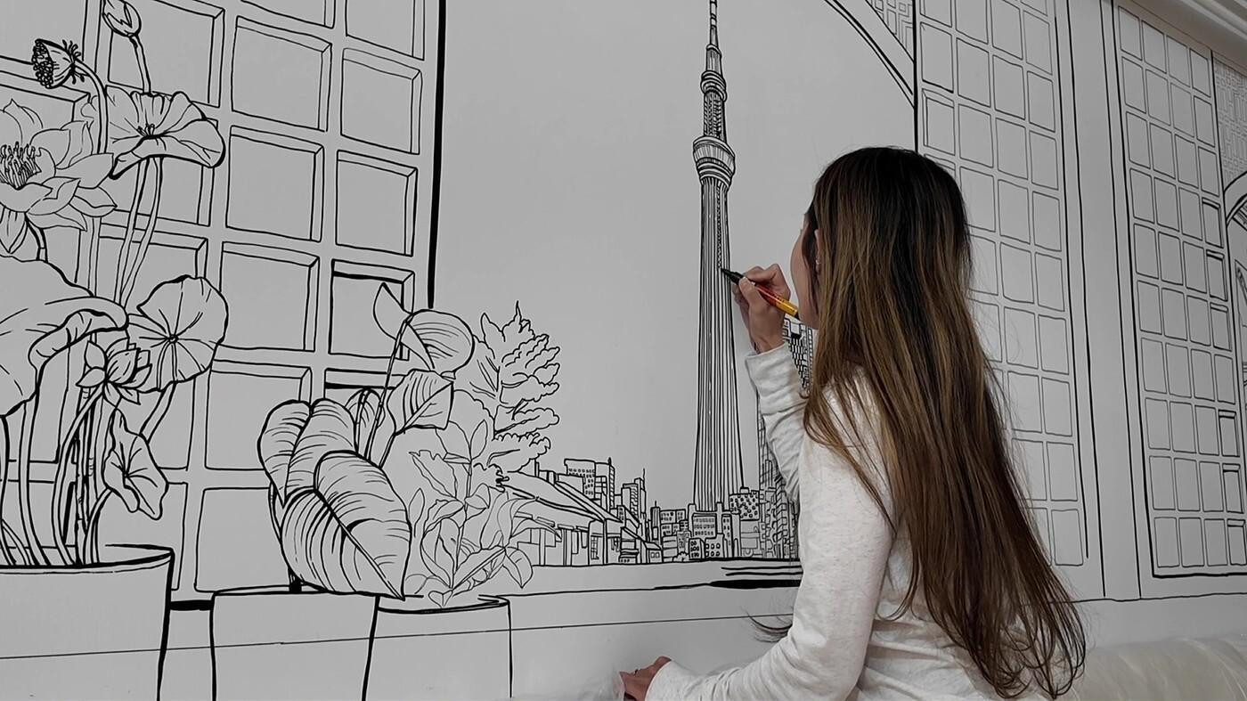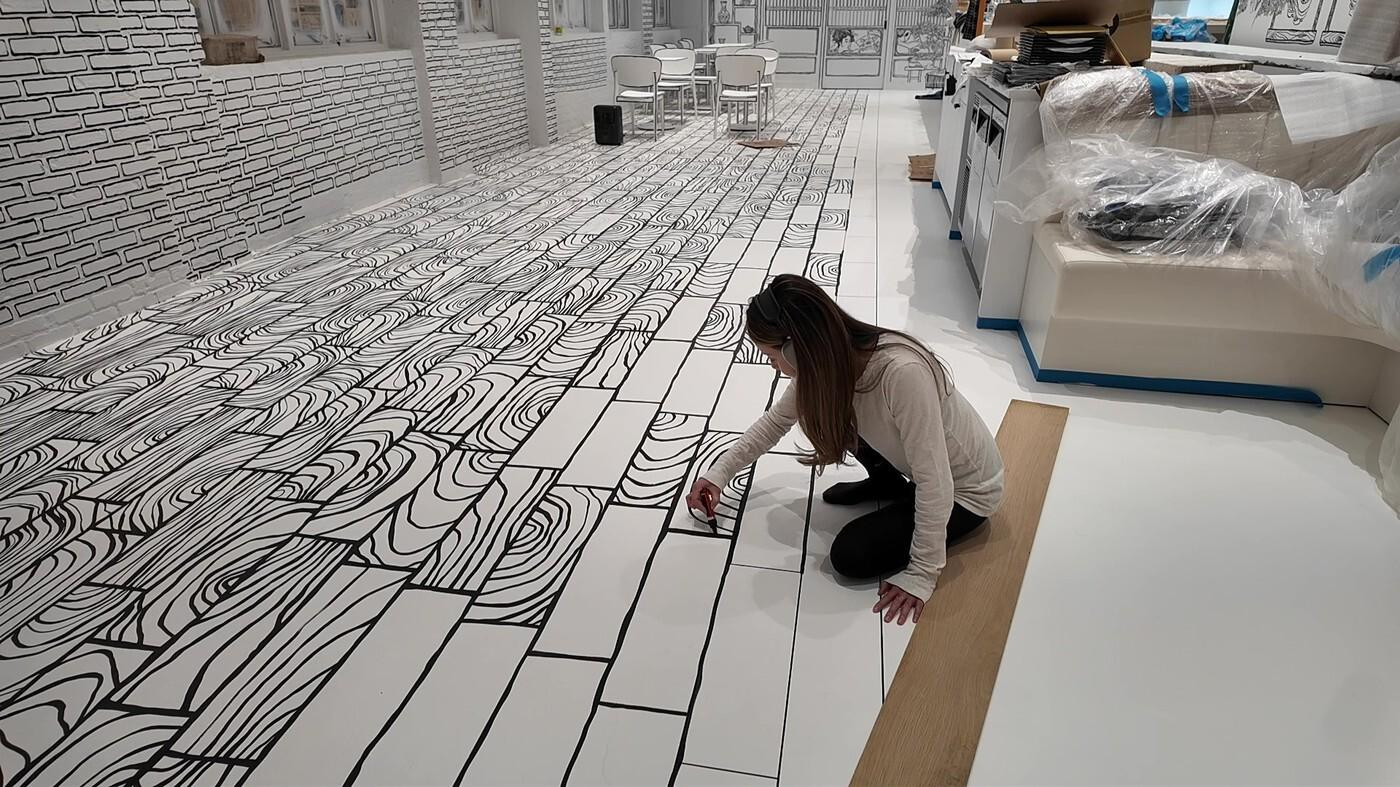 Yoo, obrazovana na njujorškoj School of Visual Arts, koristila je tradicionalne japanske tehnike ink-paintinga, a ono što prostor čini posebno fascinantnim jest činjenica da nijedan jedini detalj nije print - sve je naslikano direktno na zidovima, podu i namještaju. Čak i „drvene“ teksture na podu samo su iluzija, uvjerljivo naslikane tako da posjetitelji u prvi tren teško razlikuju crtež od fizičke površine.