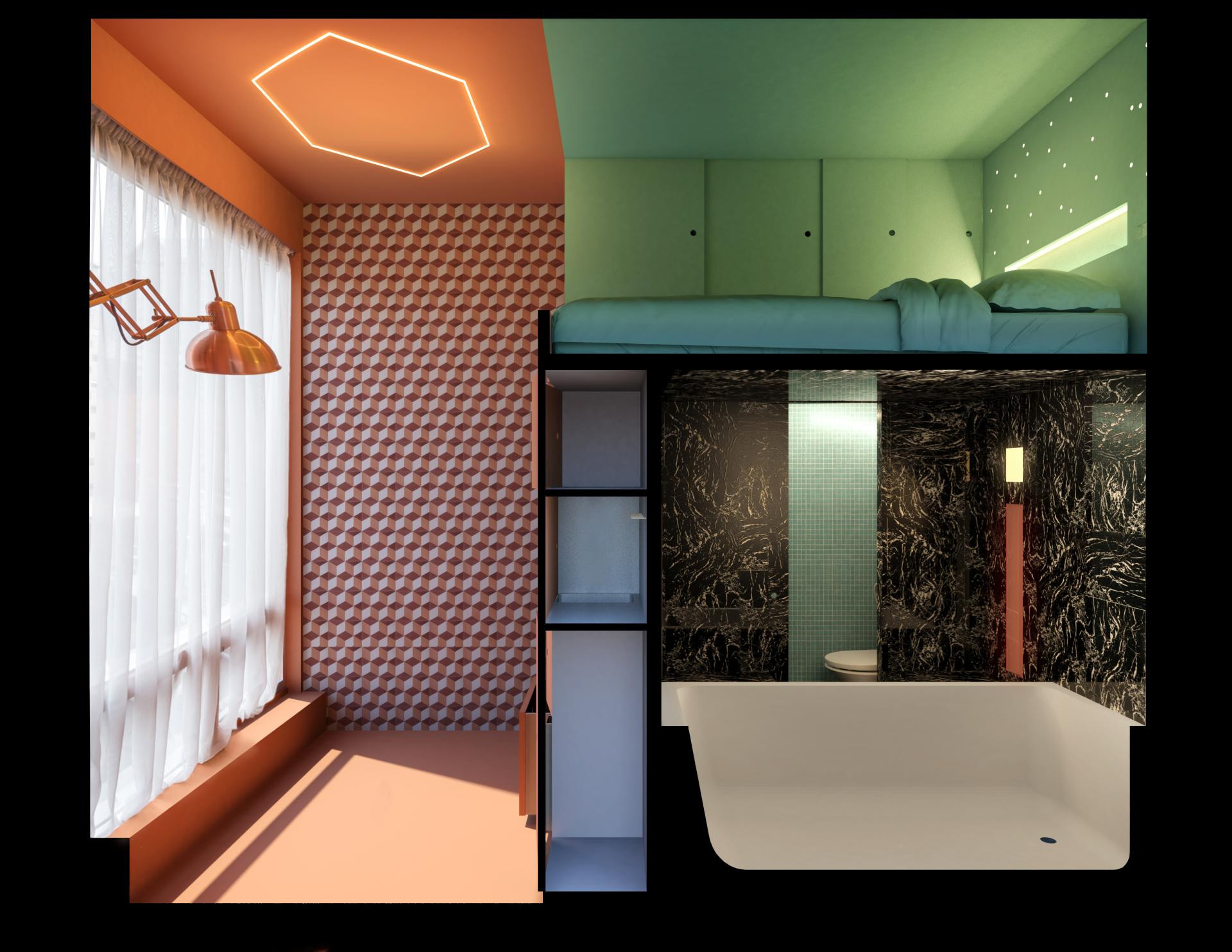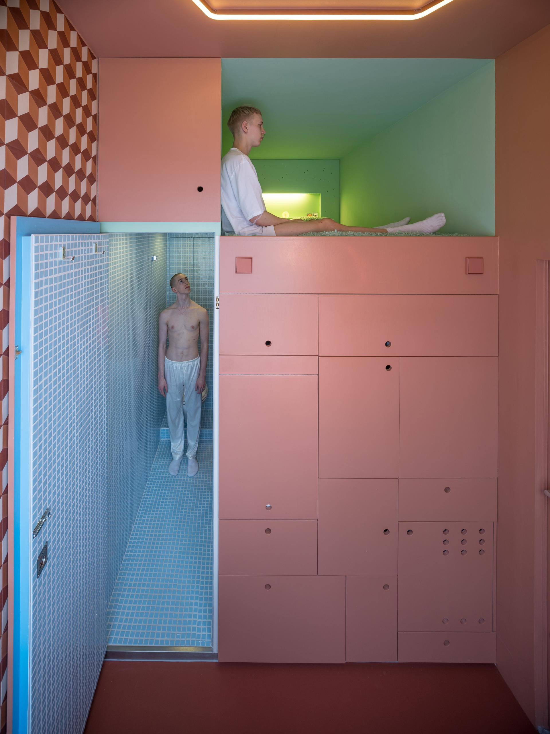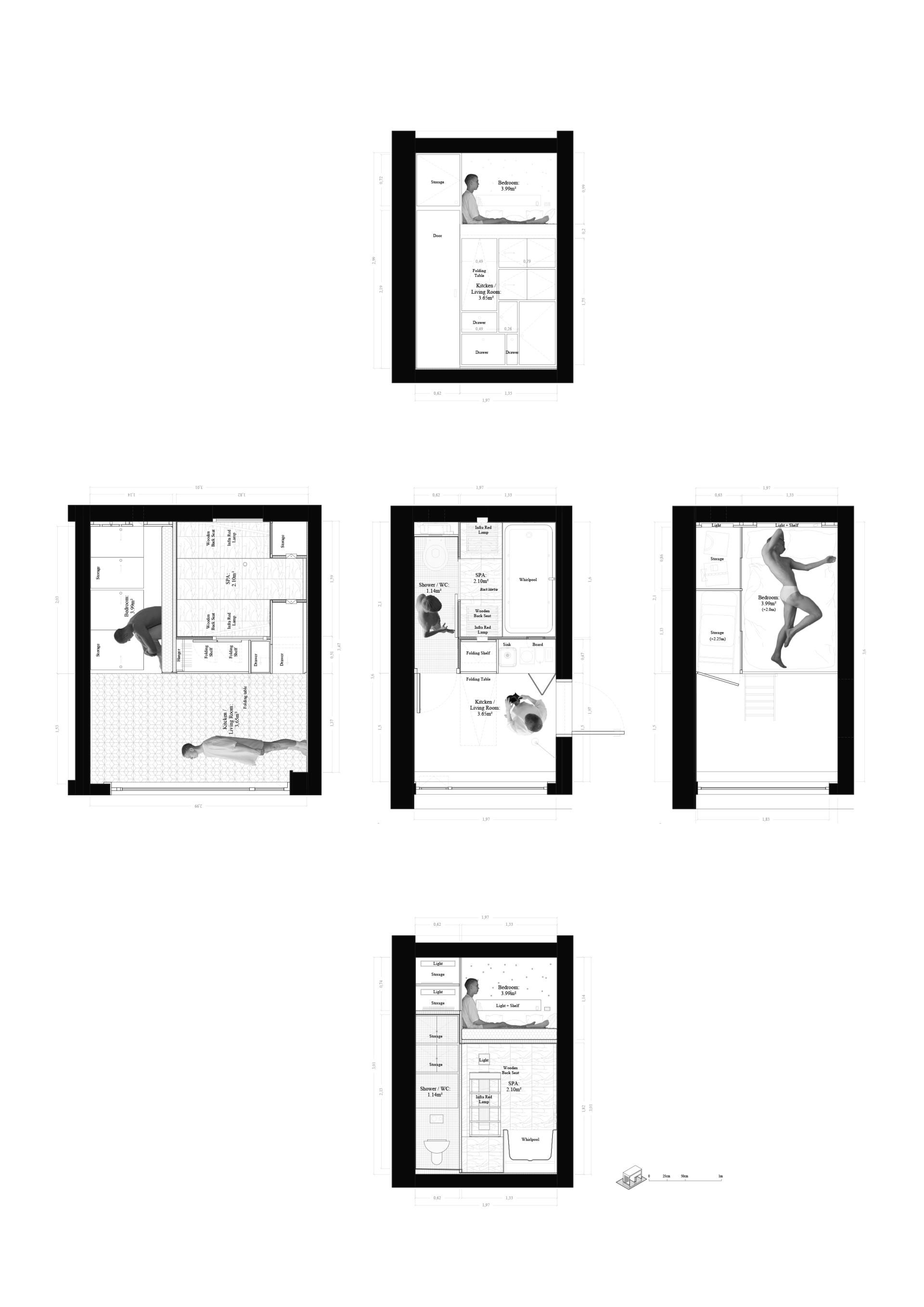 Ovaj mikrostan jasno pokazuje da različite sobe s različitim veličinama i funkcijama možda neće trebati istu visinu. Činilo se, kažu arhitekti, da Cabanon postaje sve veći što mu se više programa dodaje. Prilagodba visina to je omogućila. Četiri prostorije ovdje oblikovane su na temelju standardnih proizvoda: spavaća soba dizajnirana je s posebnim madracem na umu; spa prema dužini kade; kuhinja je temeljena na dubini mini-hladnjaka...