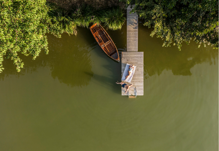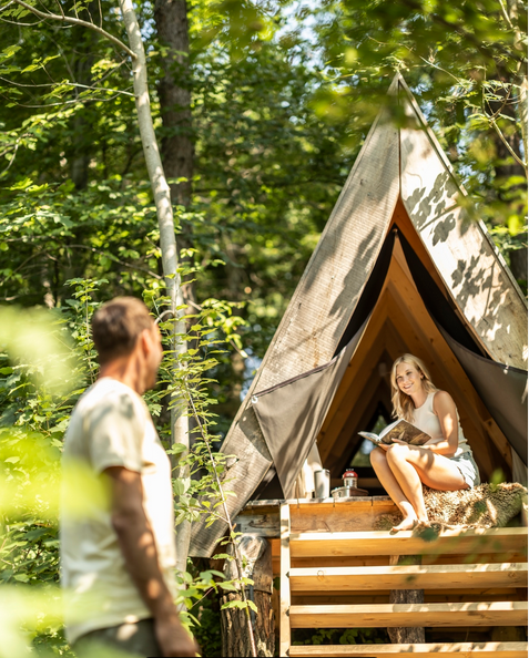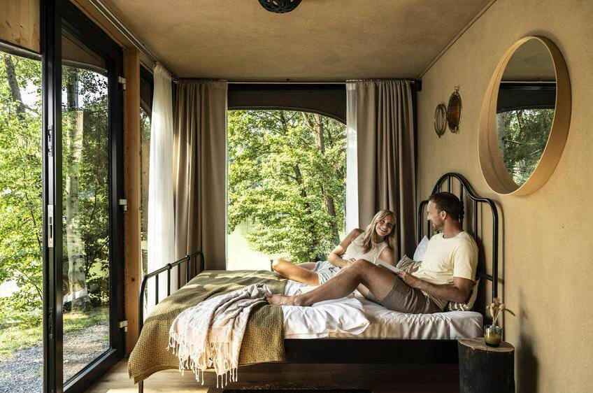 Četiri kućice su velike, obiteljske, koje nude vrhunsku udobnost s privatnim kupaonicama, no posebnost ovog kampa upravo je u 16 ostakljenih kućica na jezeru, skladno smještenih u šumi, gdje gosti doslovno imaju osjećaj kao da spavaju pod vedrim nebom, samo uz sav komfor kao u klasičnoj hotelskoj sobi.