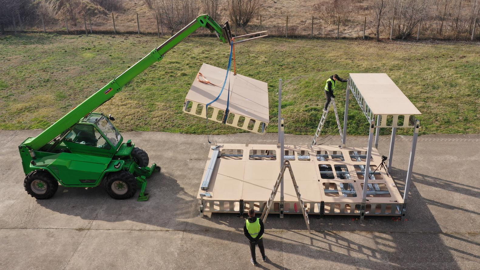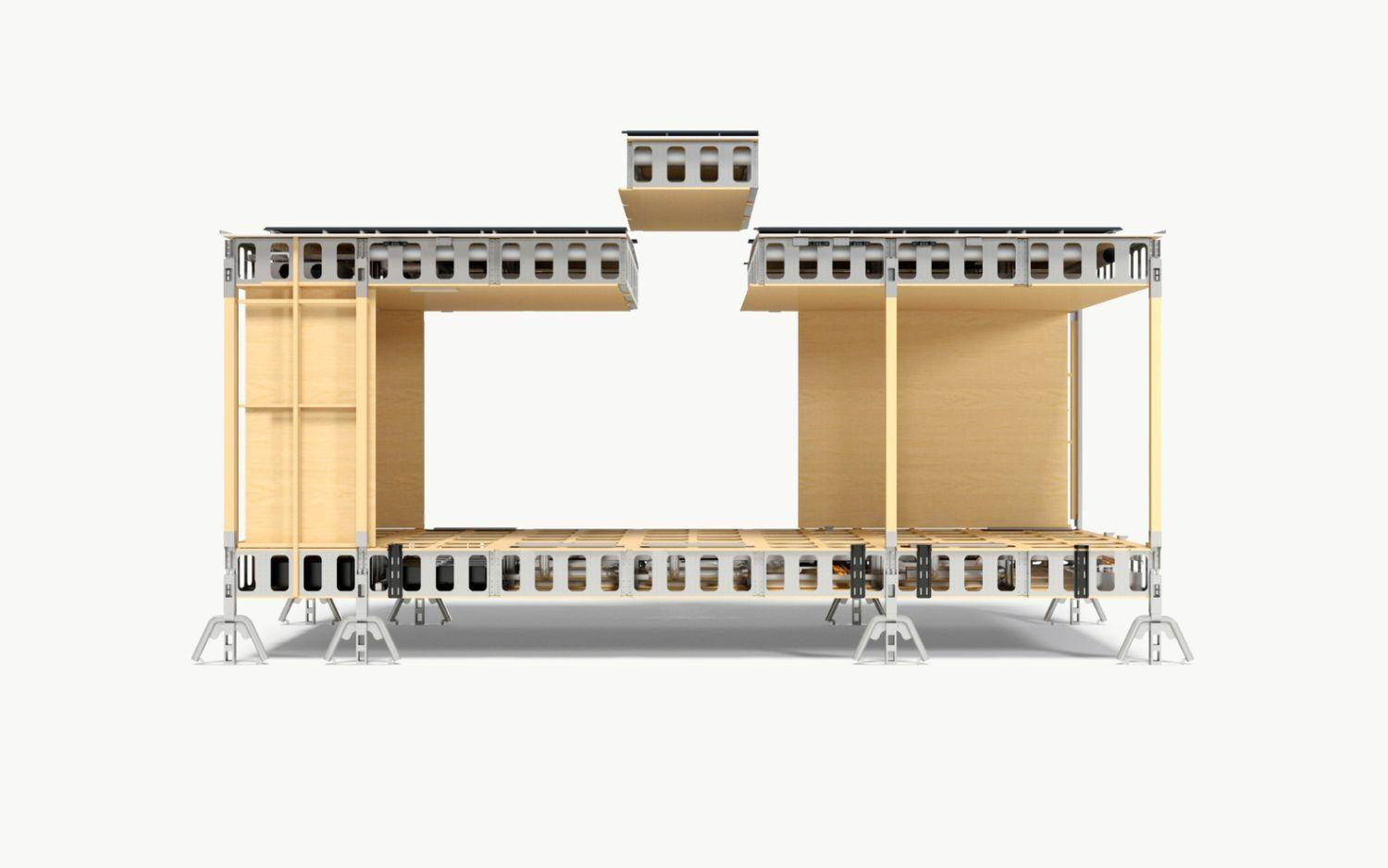 Dok je ploča izrađena od metala i drva, grede, spojevi i podovi izrađeni su od cijevi i lima. Krov je izrađen od stojećih šavova metala, a ostali konstrukcijski elementi sastavljeni su od drva iz održivih izvora. Slično drugim montažnim konstrukcijama, sve se ove komponente u početku grade u tvornici, a zatim se u ravnim kontejnerima prevoze na gradilište. Budući da je maksimalna težina modula 272 kilograma, istovar i montaža zahtijevaju samo mali teleskopski utovarivač, čime se izbjegava upotreba dizalica. Sveukupno, standardizirani dizajn poboljšava predvidljivost, minimizira troškove i ubrzava isporuku projekta za 50 %.