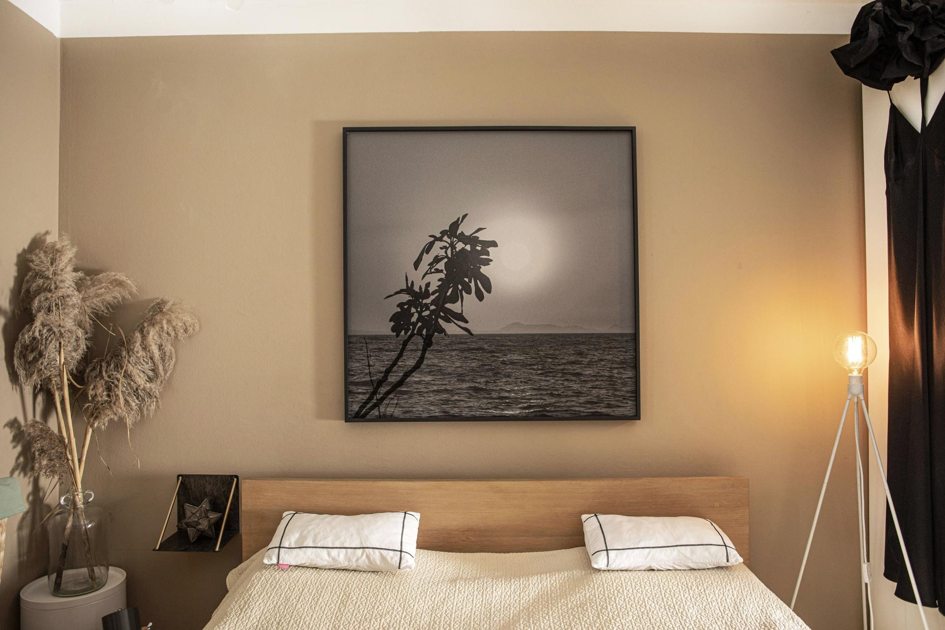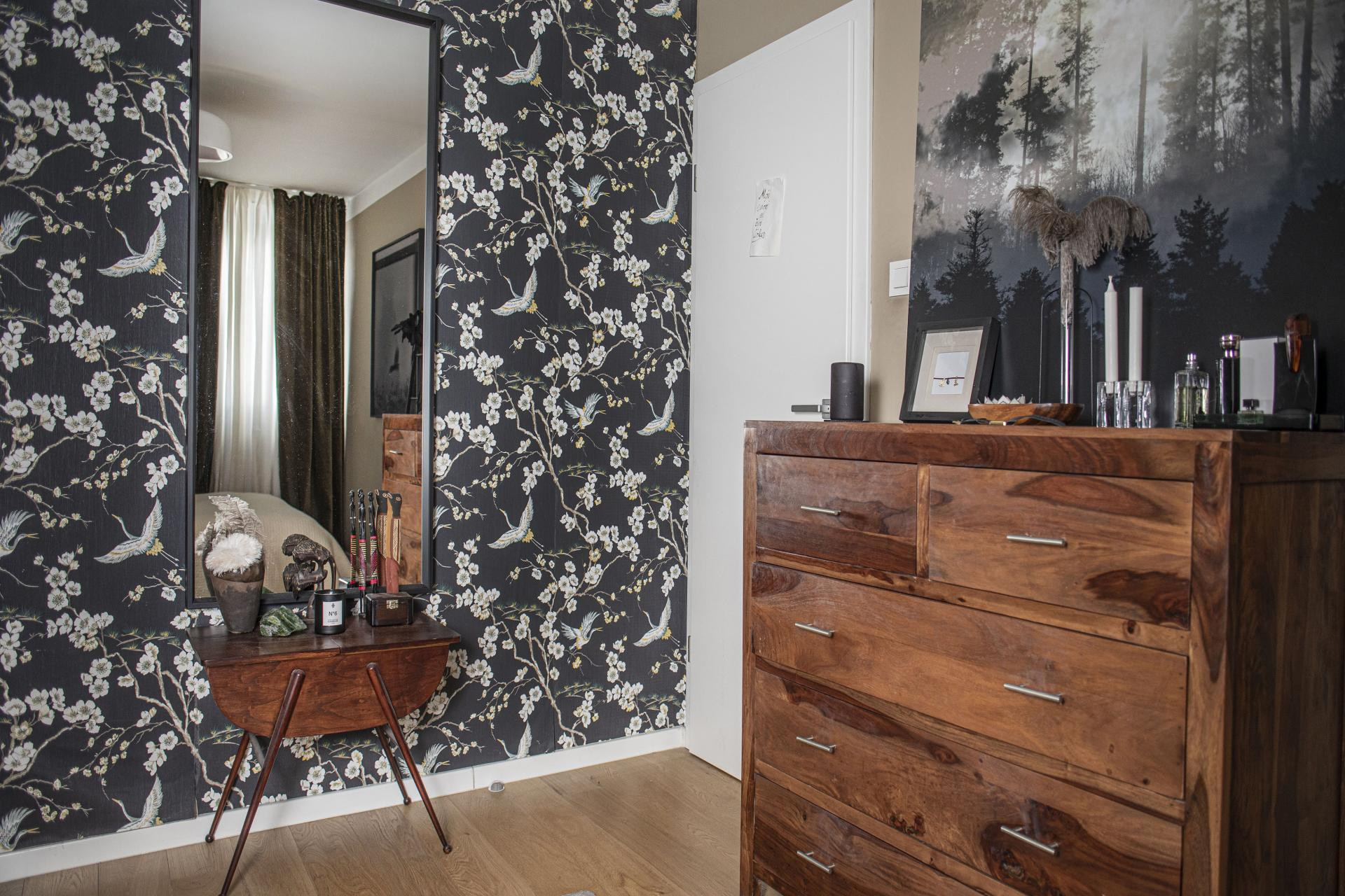Spavaćom sobom dominira krevet iz Ere, od masivnog hrasta, dok su ormar i ogledalo iz Ikee. Htjela je da spavaća soba bude primamljiva i ugodna. Obojena je kombinacijom sivkasto-duhansko-smeđe nijanse. Eklektična je, a boudoirski touché joj daju zidne tapete s motivima ždralova i cvijeća.