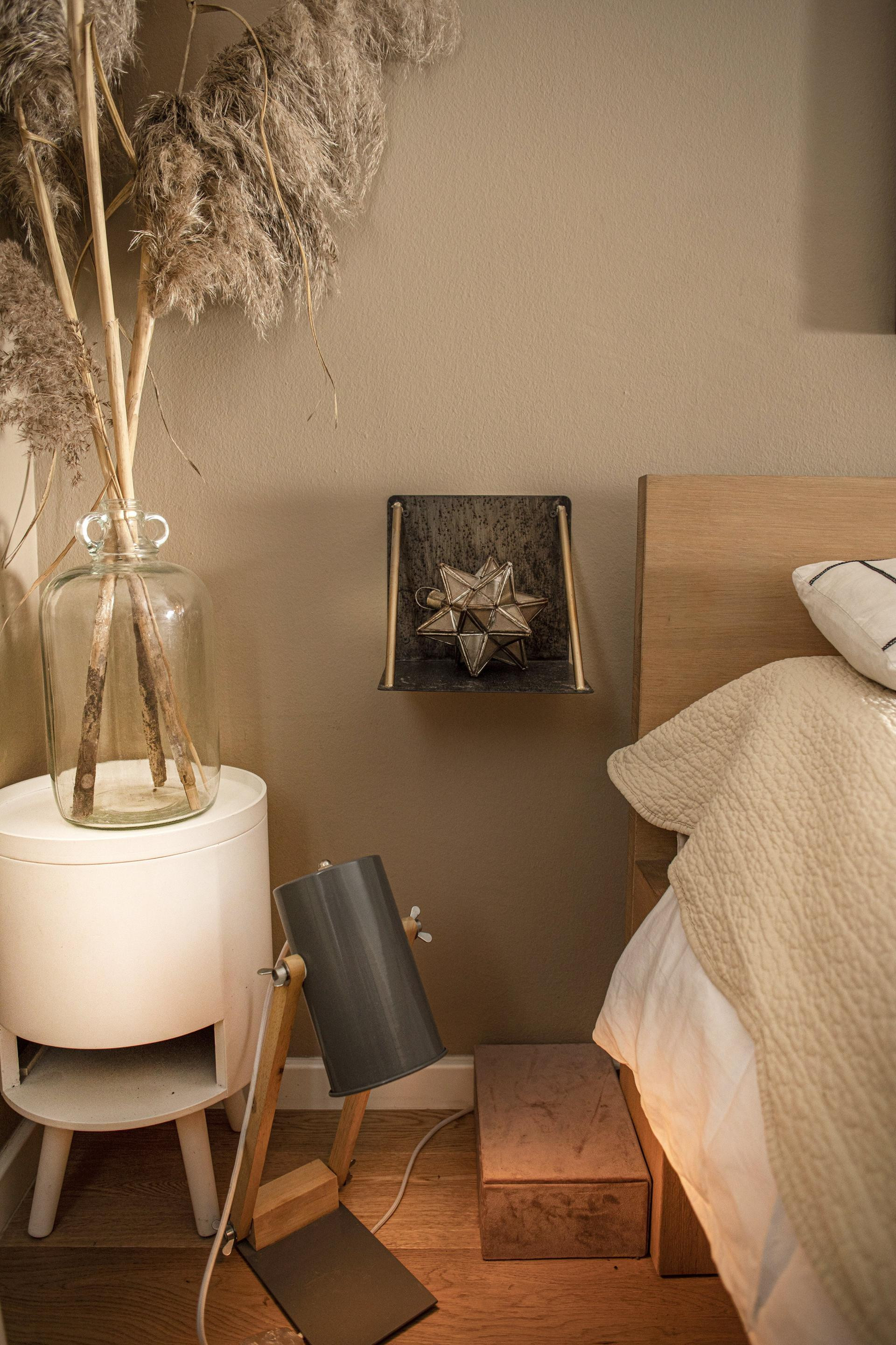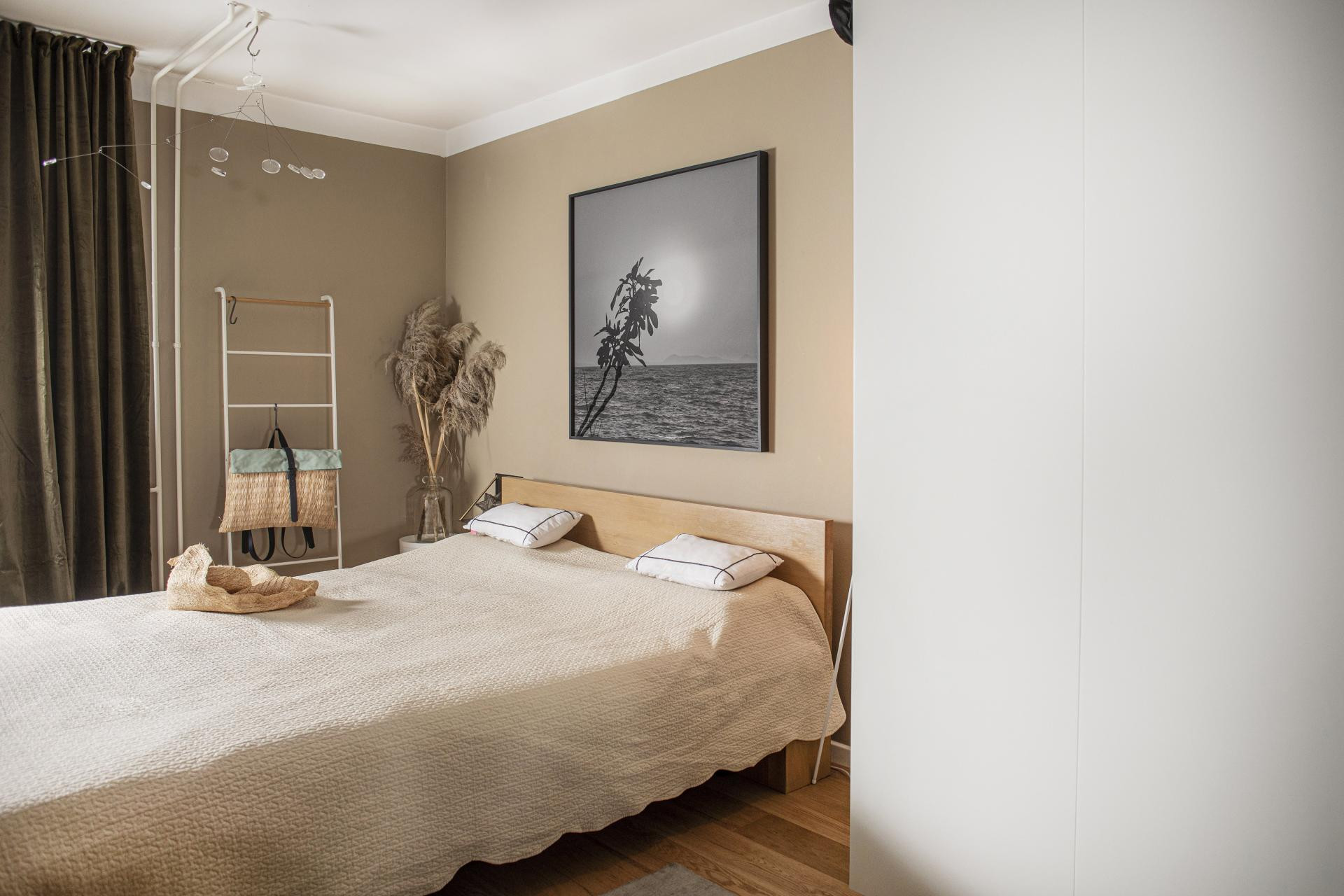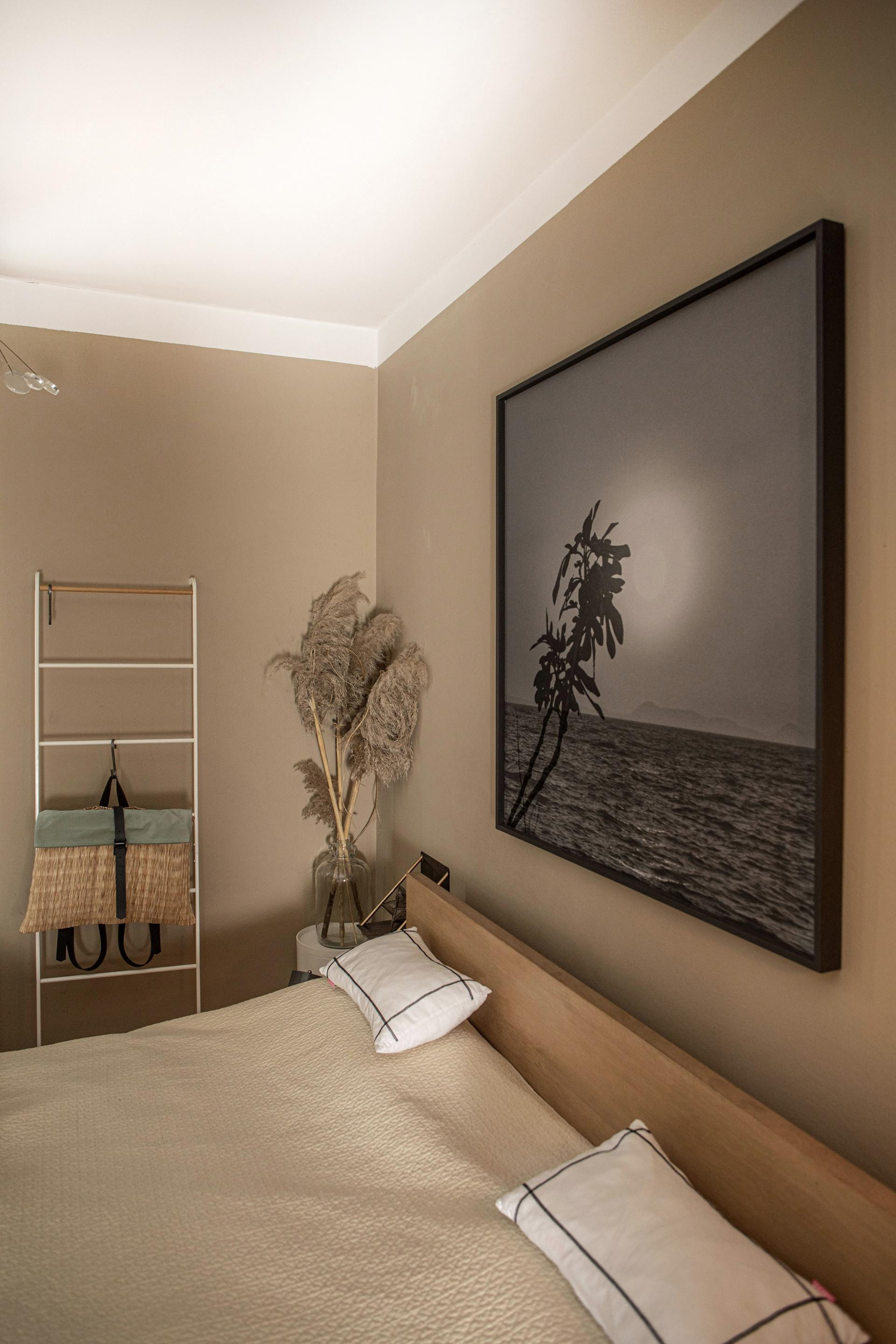 Spavaća soba je obojana kombinacijom sivkasto-duhansko-smeđih nijansi