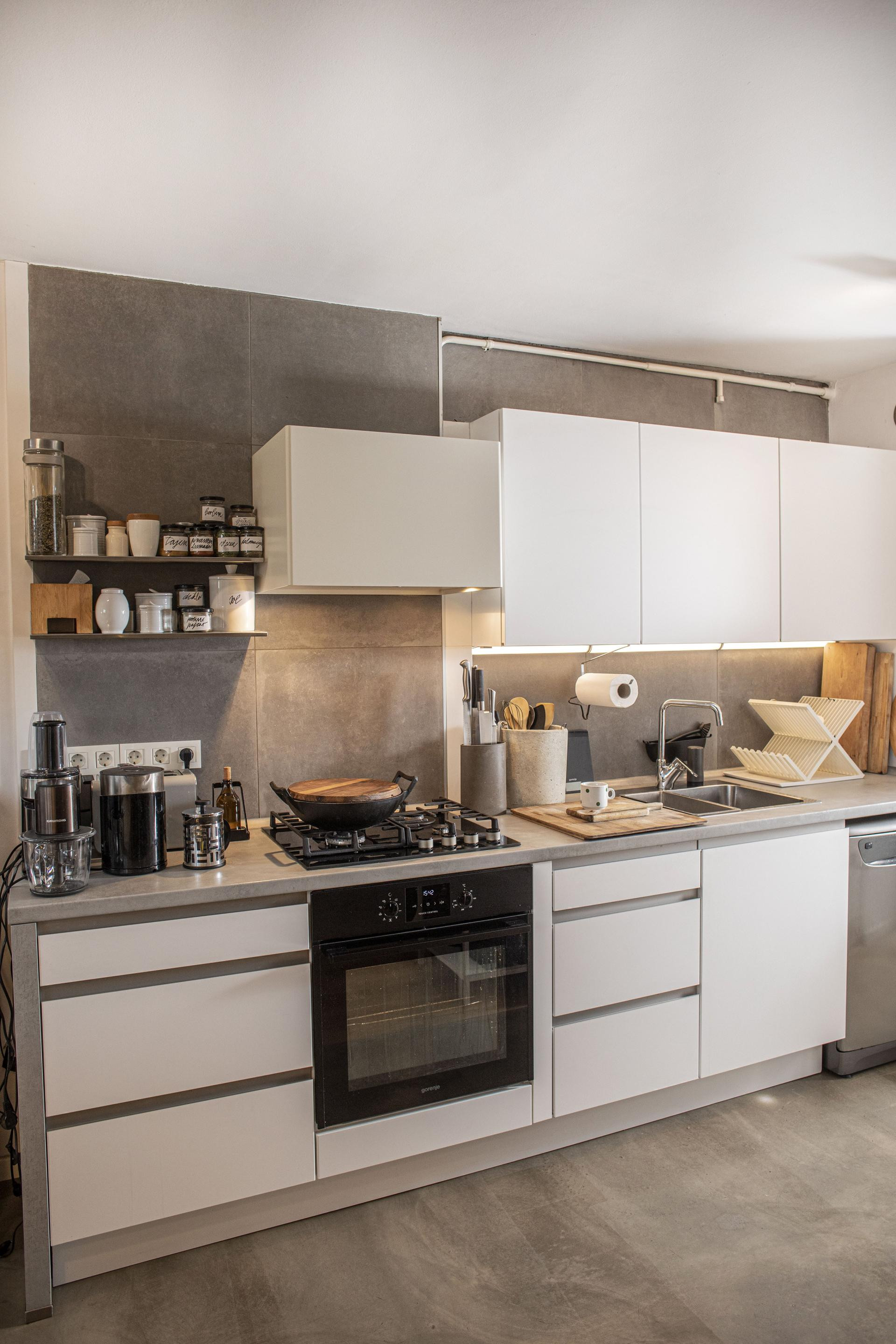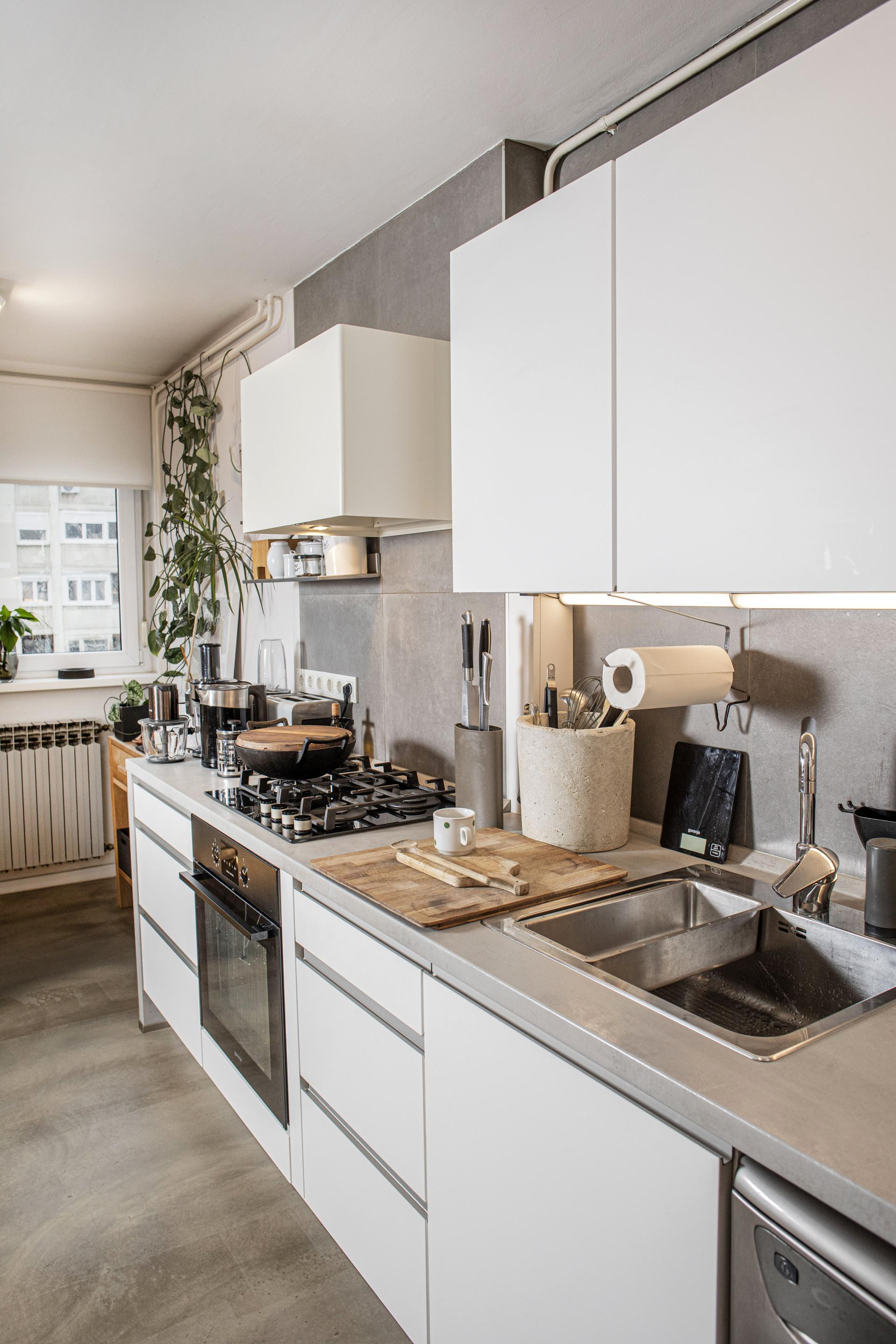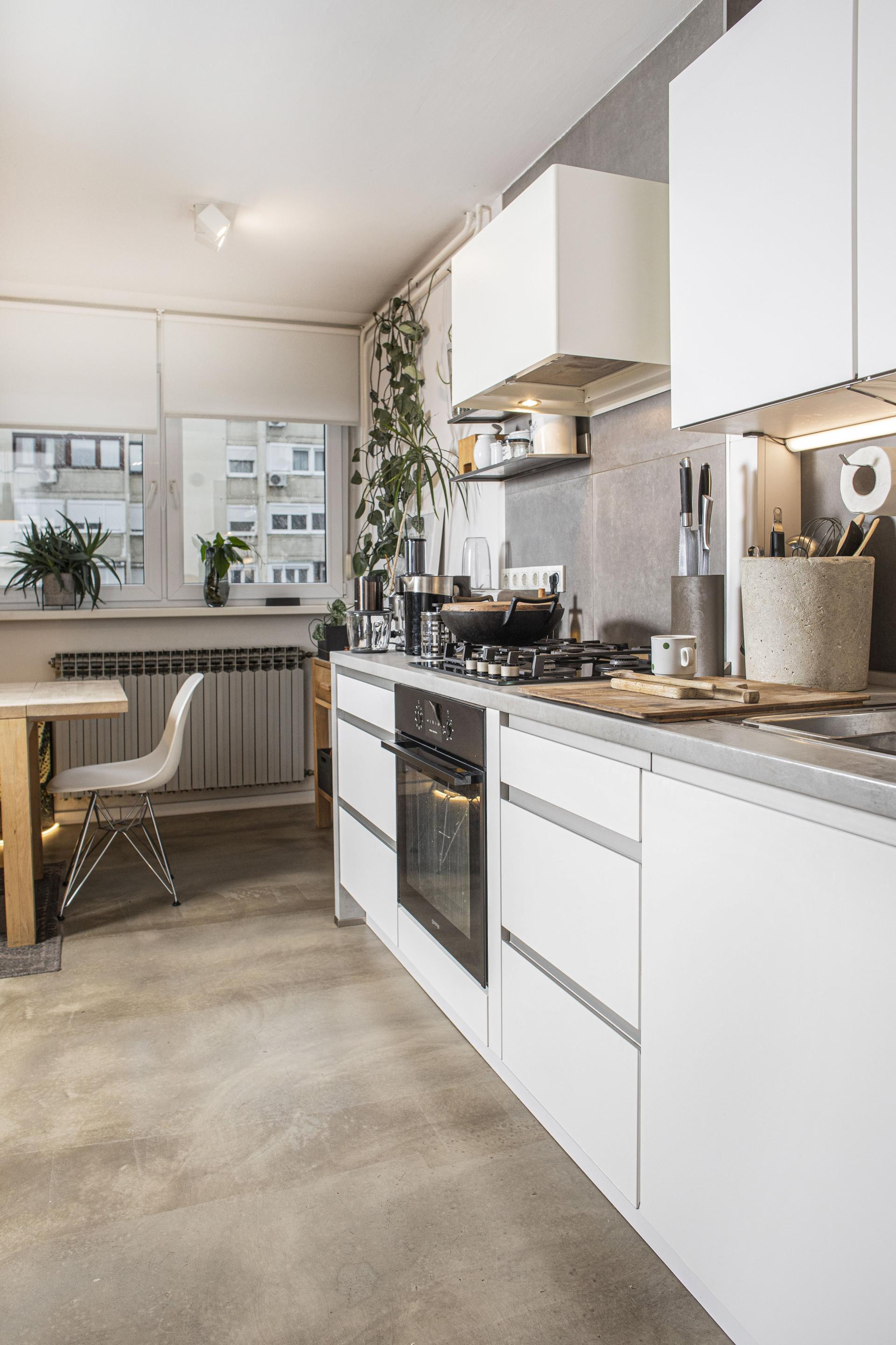 Moderna kuhinja u bijeloj mat boji odiše visokokvalitetnim dizajnom s njemačkim potpisom. Dodatni kontrast na zidovima daju čvrste porculanske ploče u tamnosivoj boji.