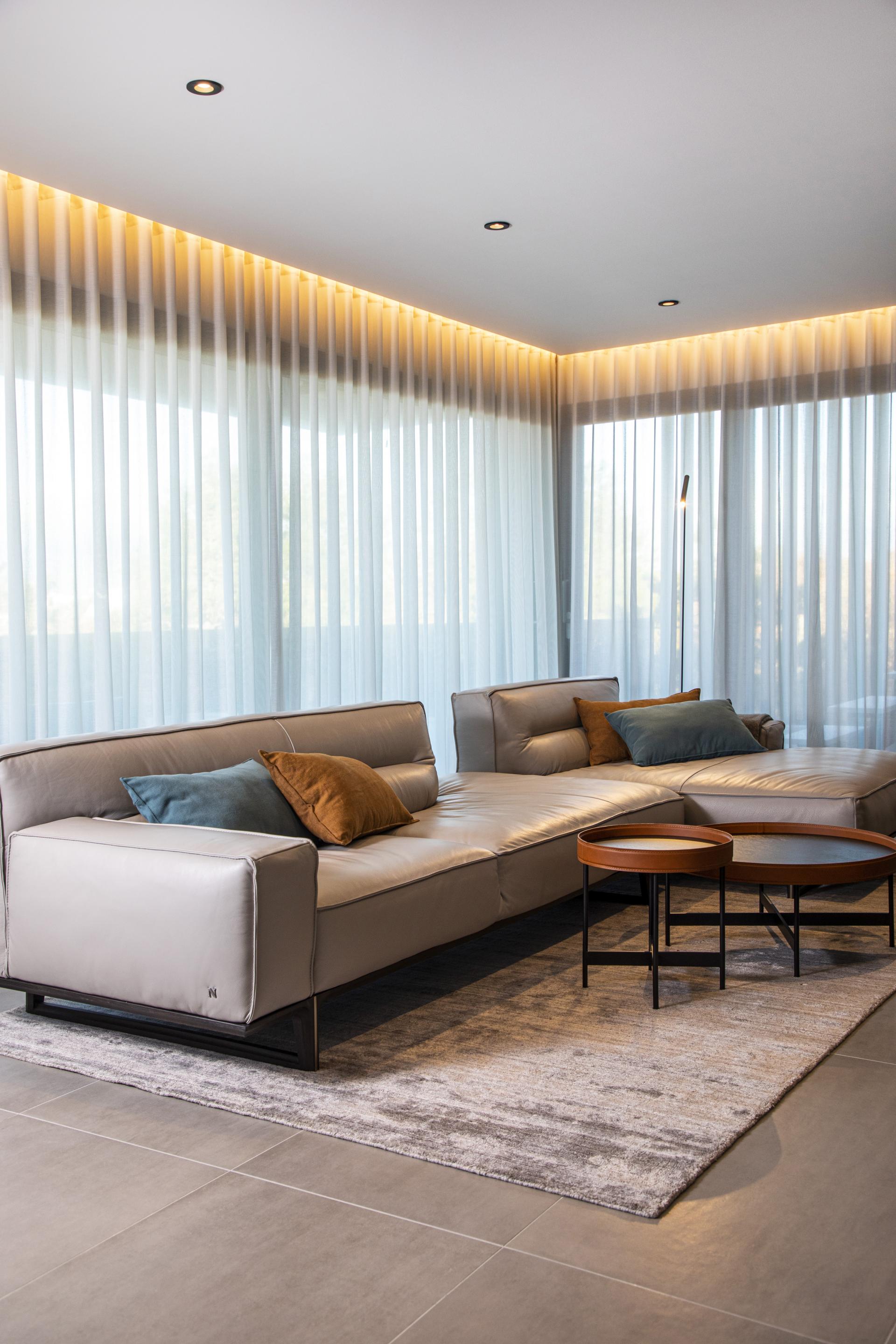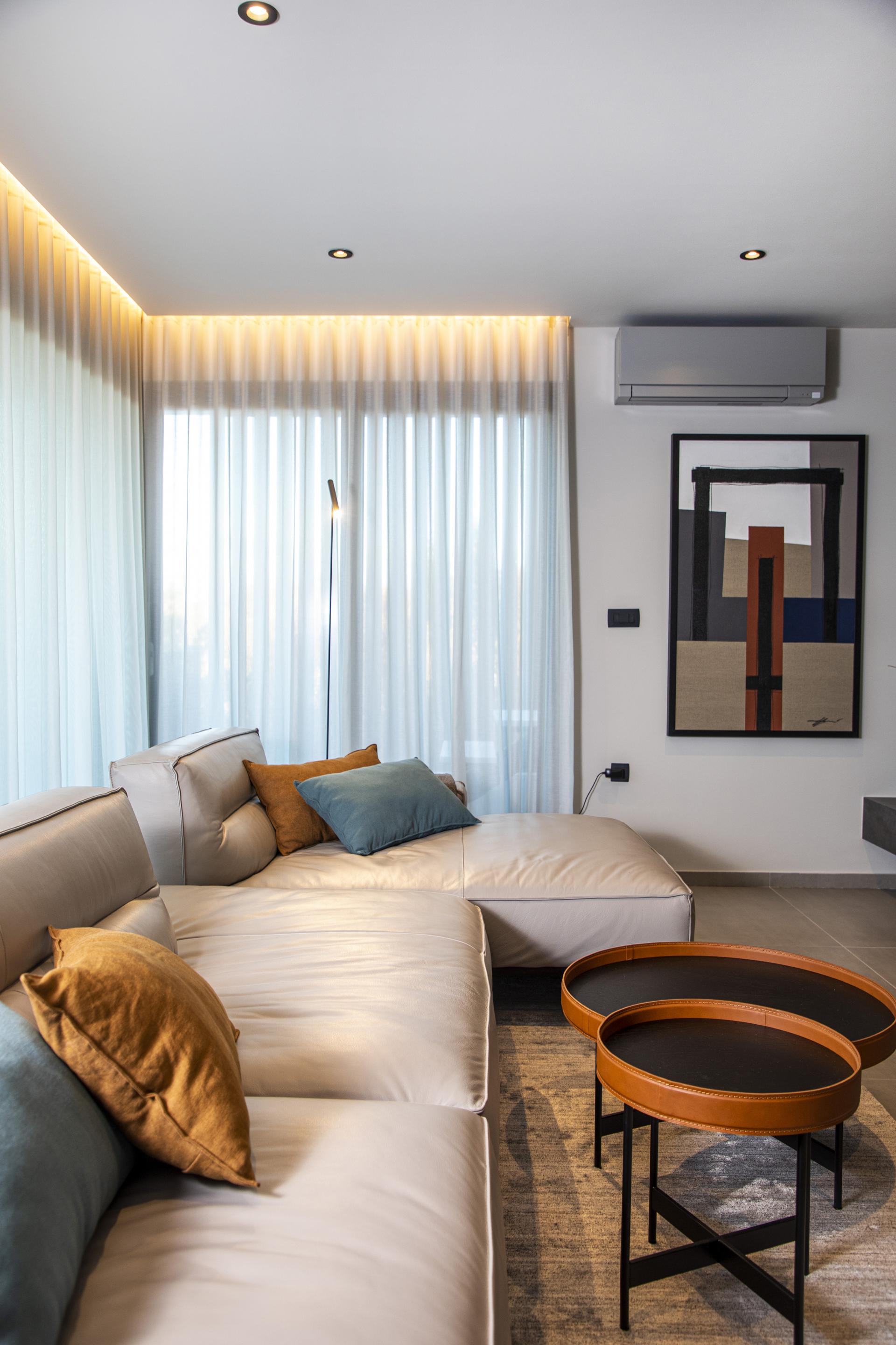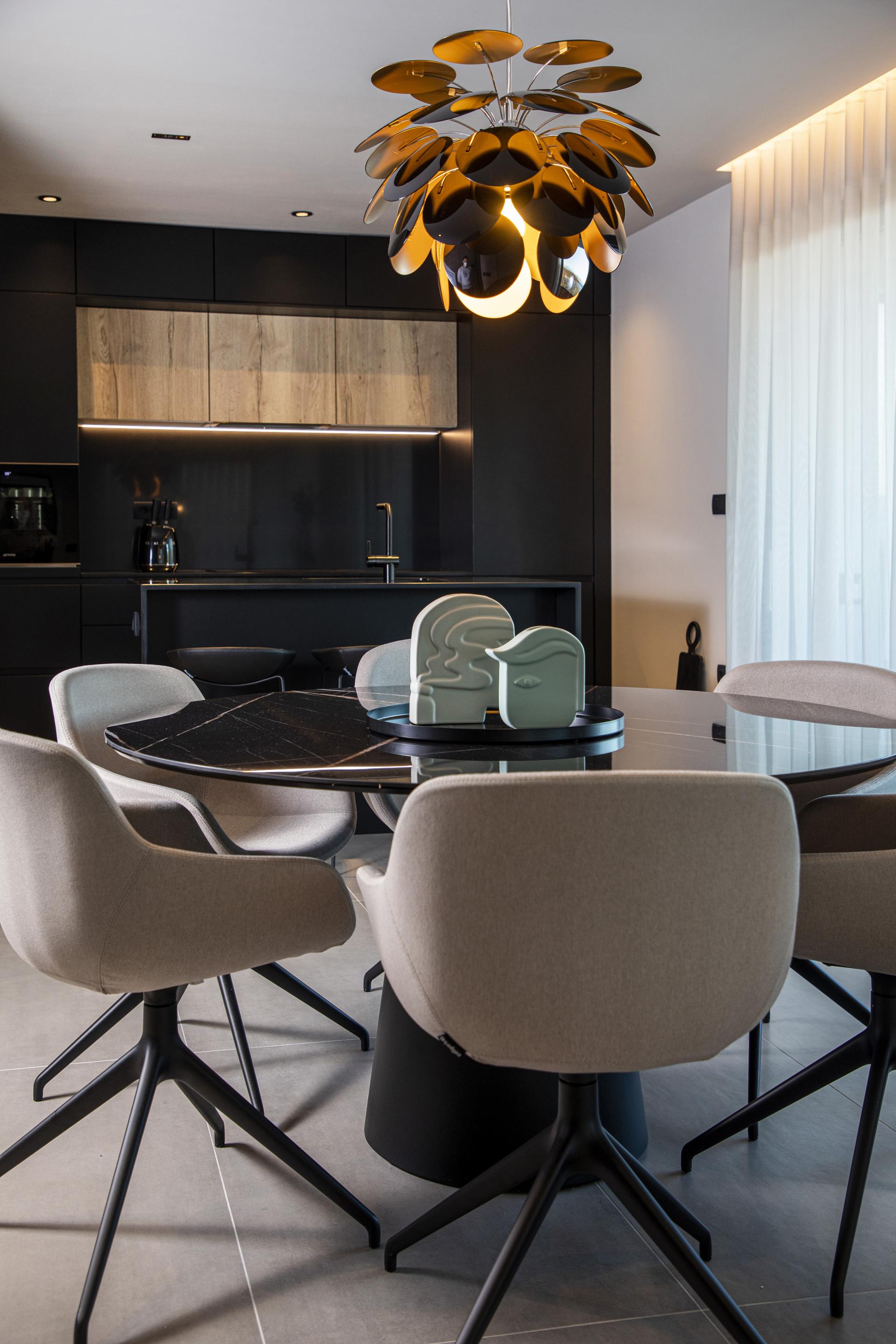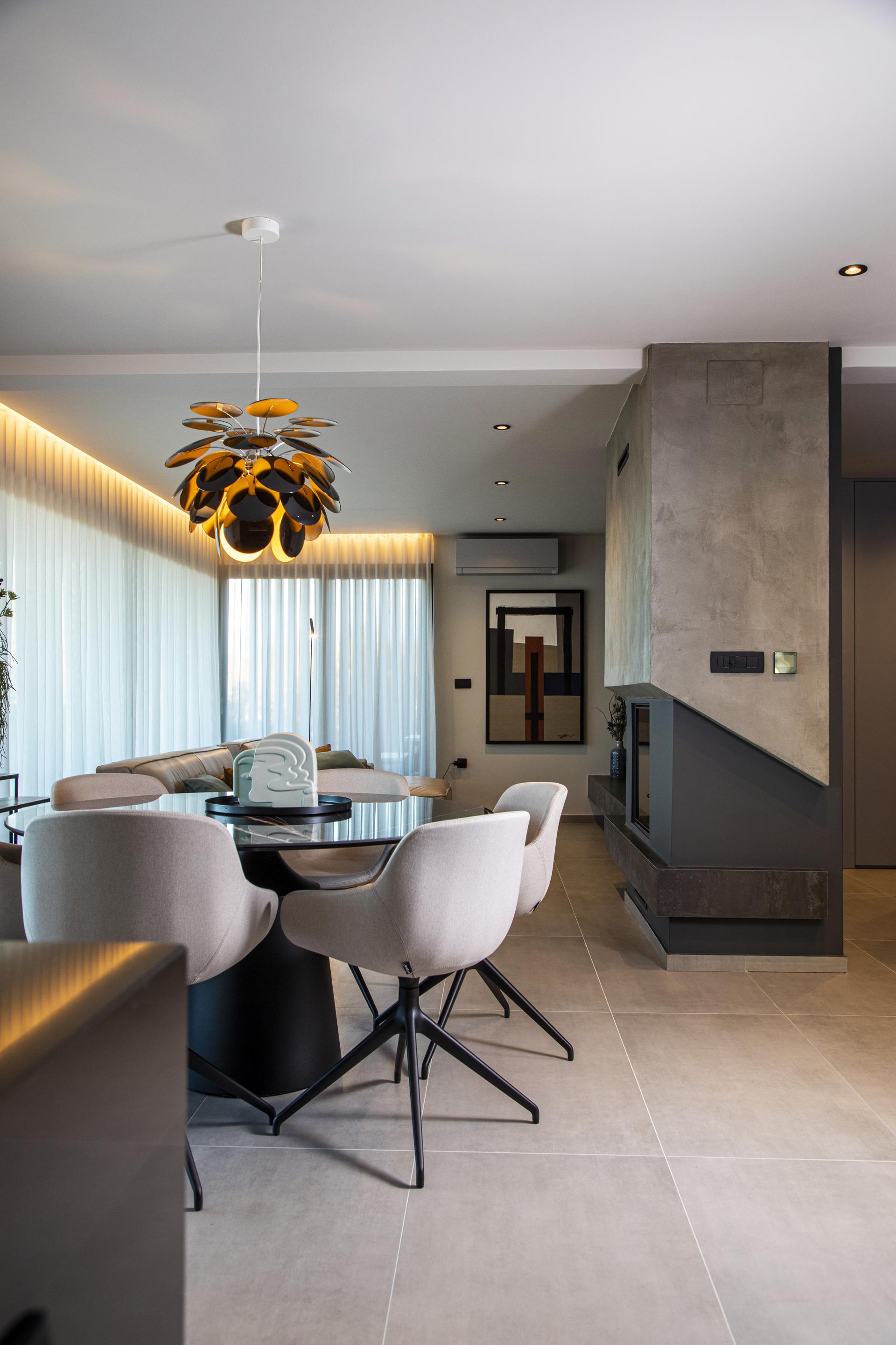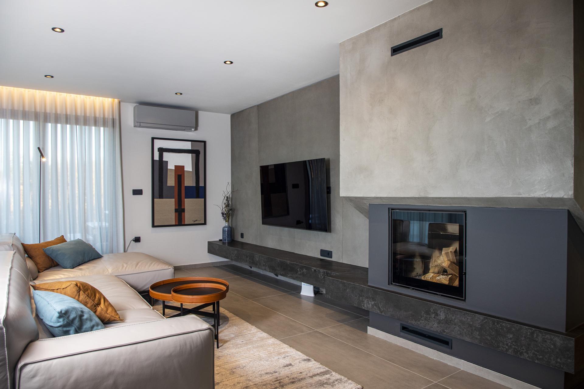 Iako u interijeru prevladavaju tamne nijanse, toplina u prostoru postignuta je prirodnim, zemljanim bojama. Dnevnim boravkom dominira kamin tvrtke Kamini-De Carina koji je položen na policu obloženu velikoformatnom keramikom.