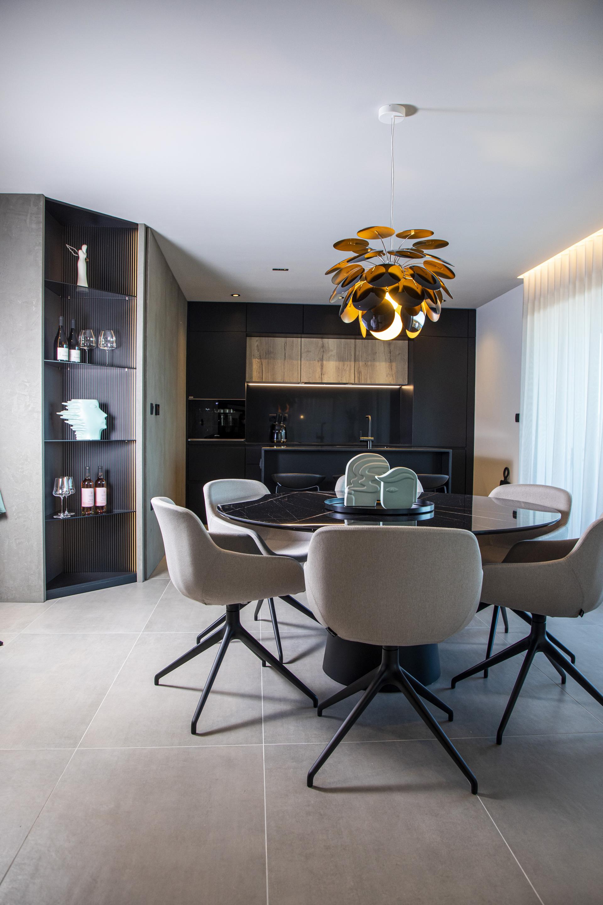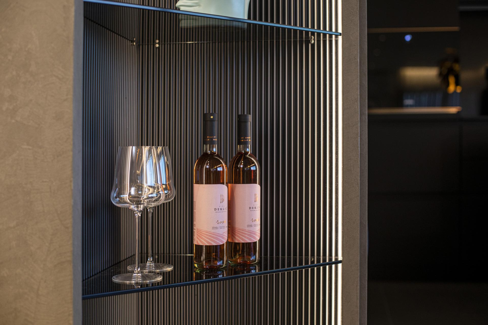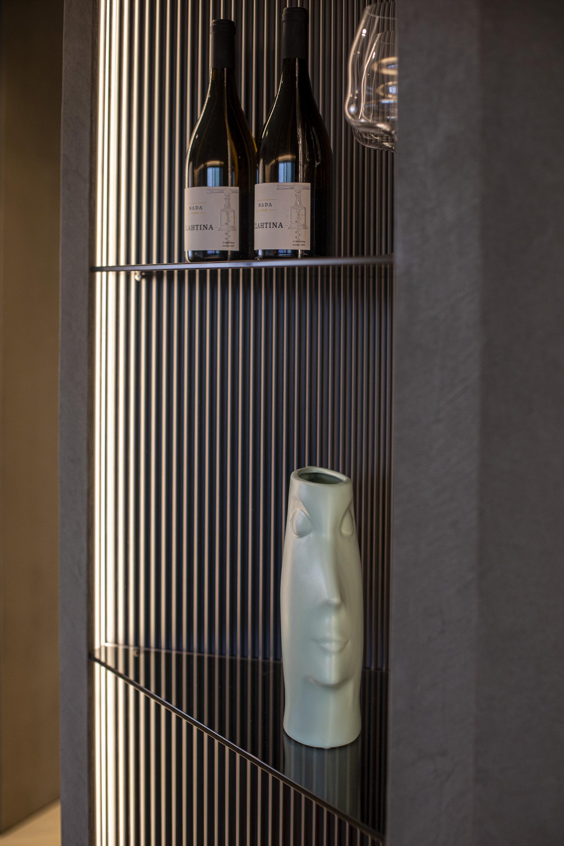 - U početku smo se dvoumili oko palete boja. Napravili smo dvije varijante, svijetlu i tamnu, na kraju smo se odlučili za tamnu i sigurna sam da smo dobro odlučili. Tamnije boje interijera osvježava svjetlost koja prodire kroz velike staklene stijene - ističe arhitektica i dodaje je većinom sve rađeno po mjeri u tvrtki Sven iz Ludbrega, od određenih elemenata namještaja do pojedinih uporabno-dekorativnih detalja. Tako nam pokazuje kutnu policu koja povezuje kuhinju i blagovaonicu, a ističe se obradom leđa. Ona su rađena posebnom tehnikom glodanja, čija tekstura na zanimljiv način lomi svjetlost i ističe eksponate na polici. Također, odlično su se uklopile i slike koje potpisuje dizajner Teo Perić.
