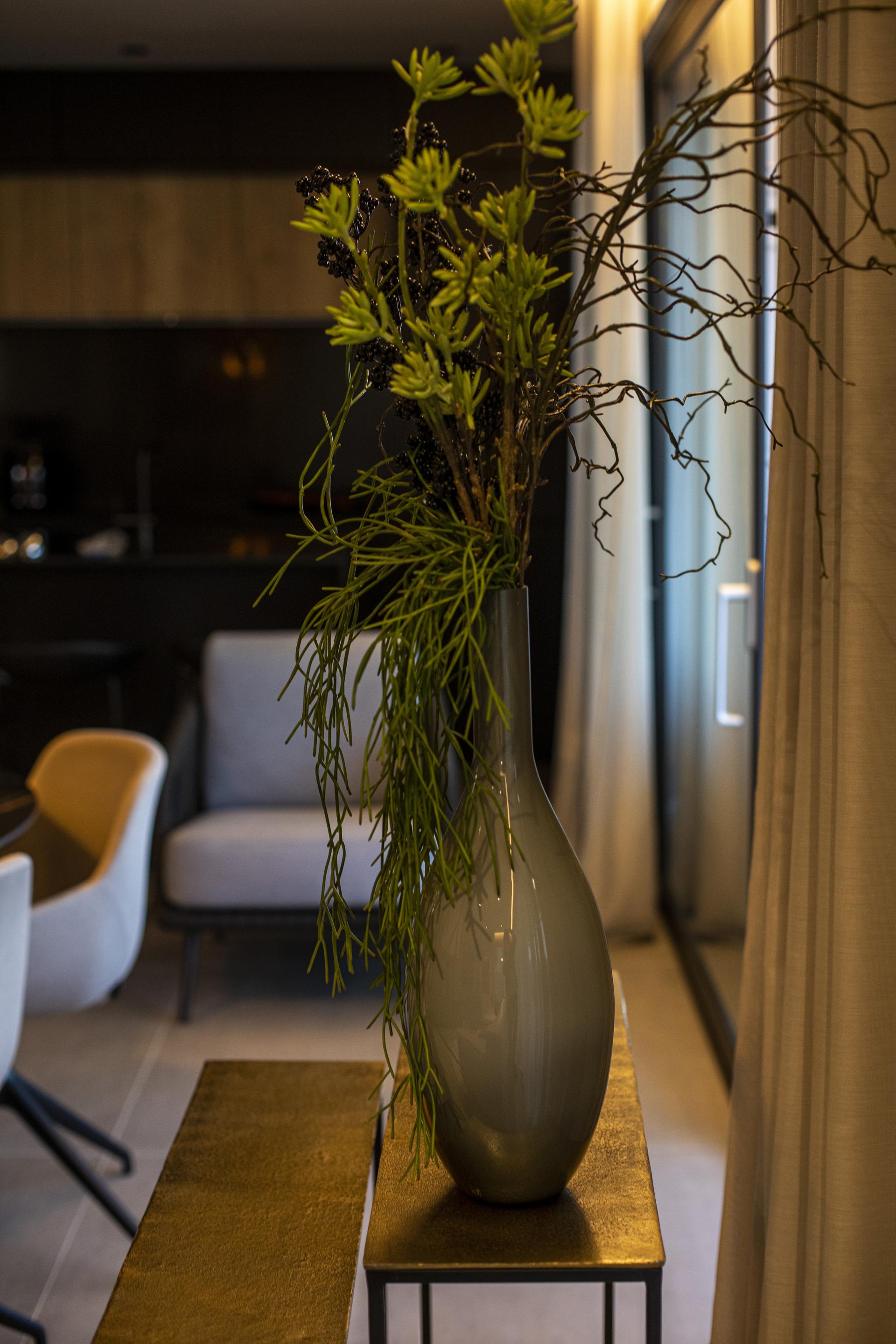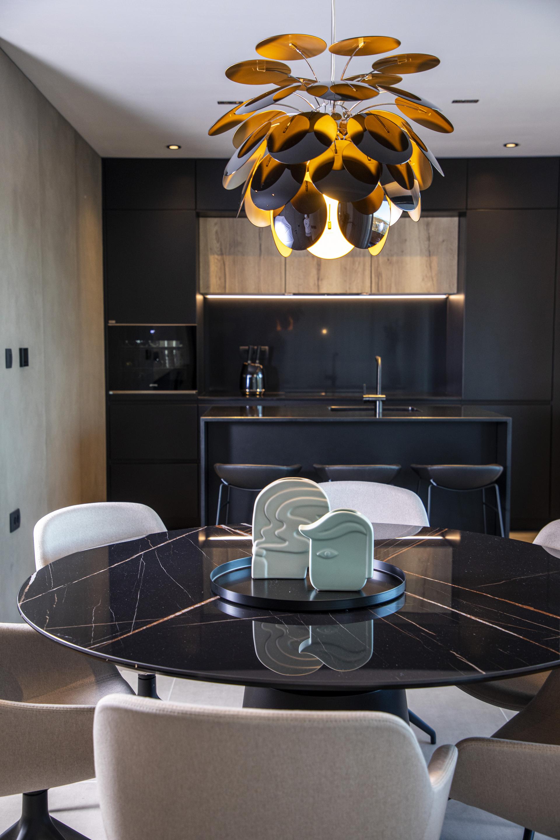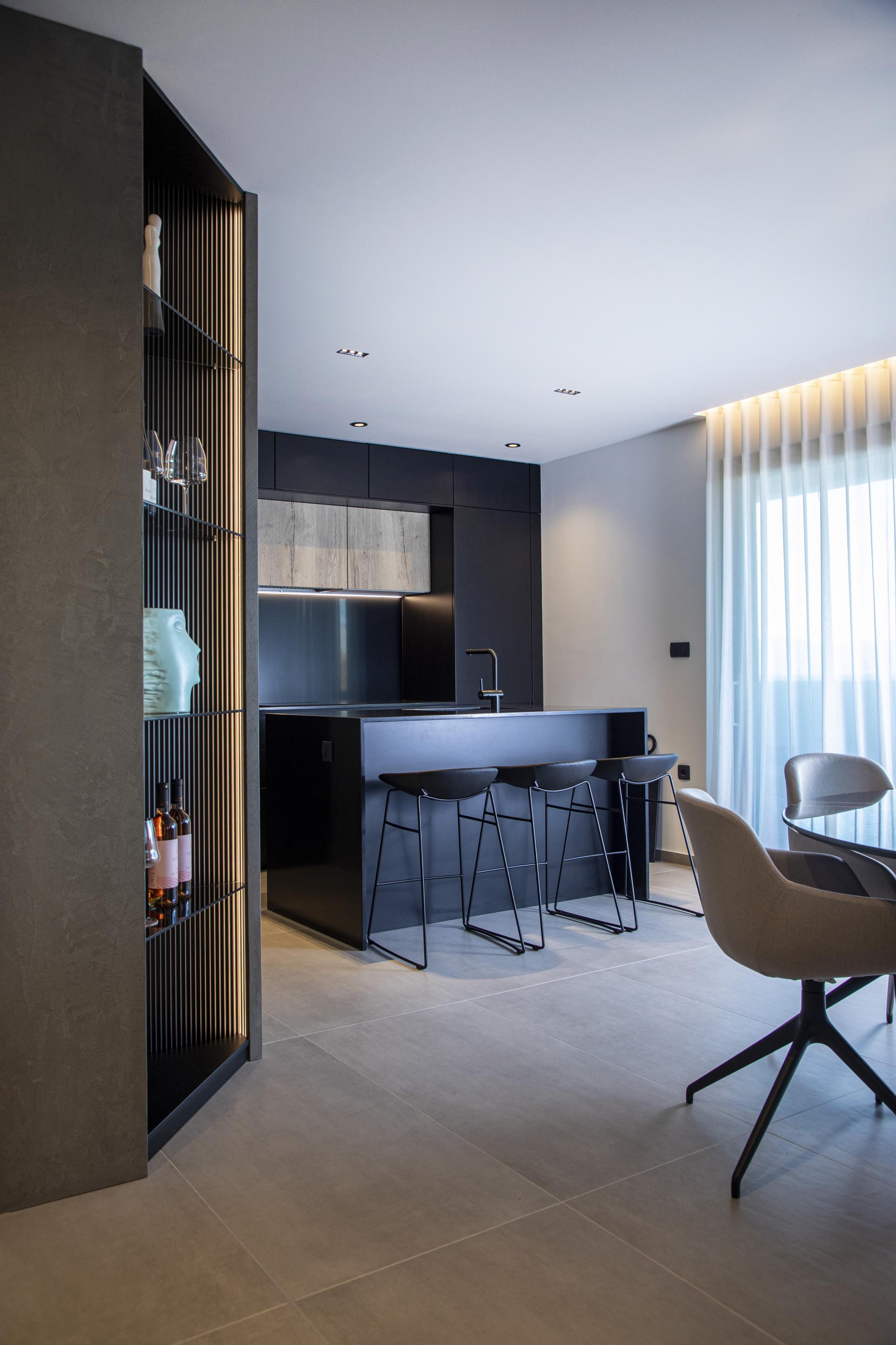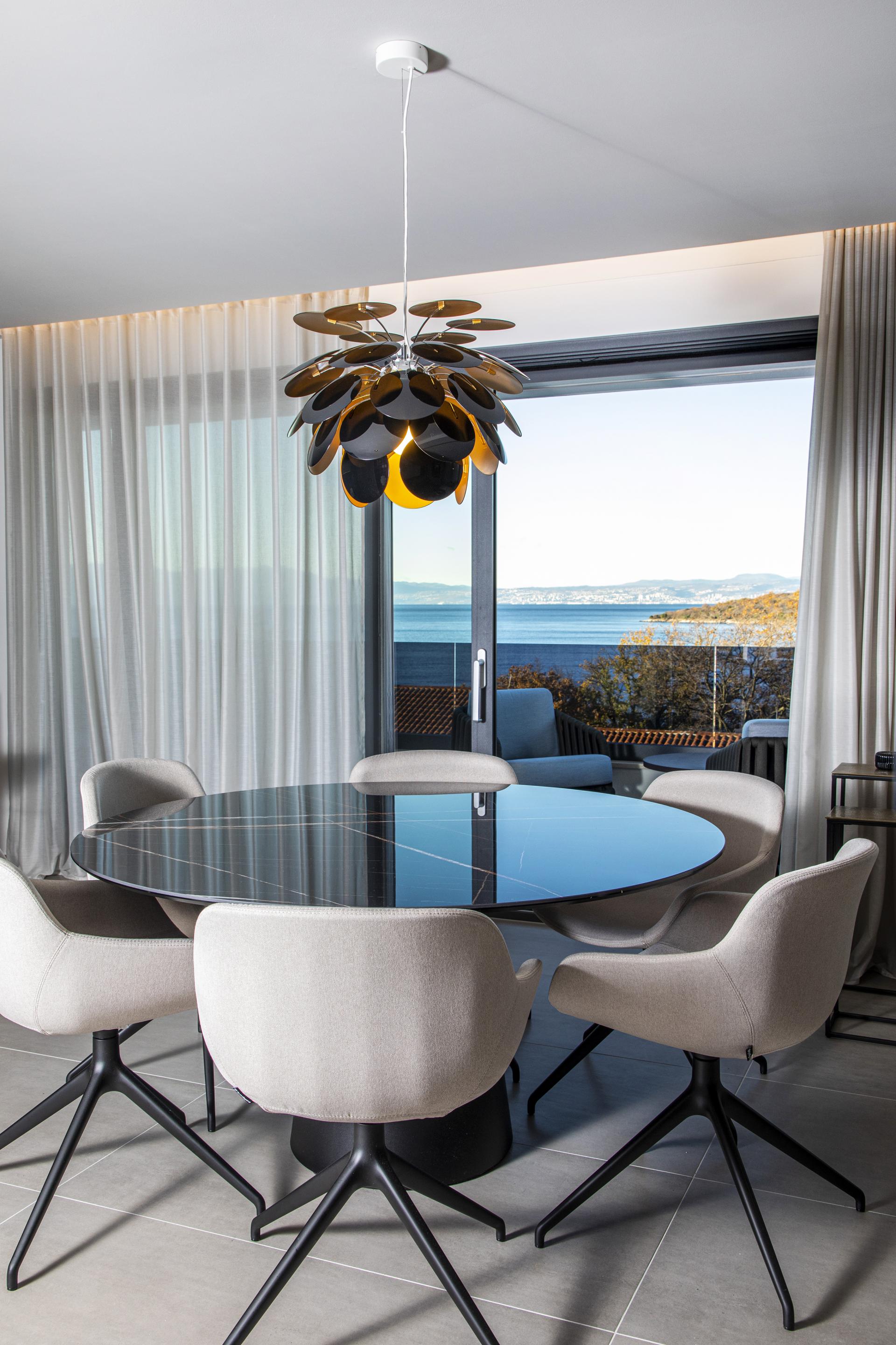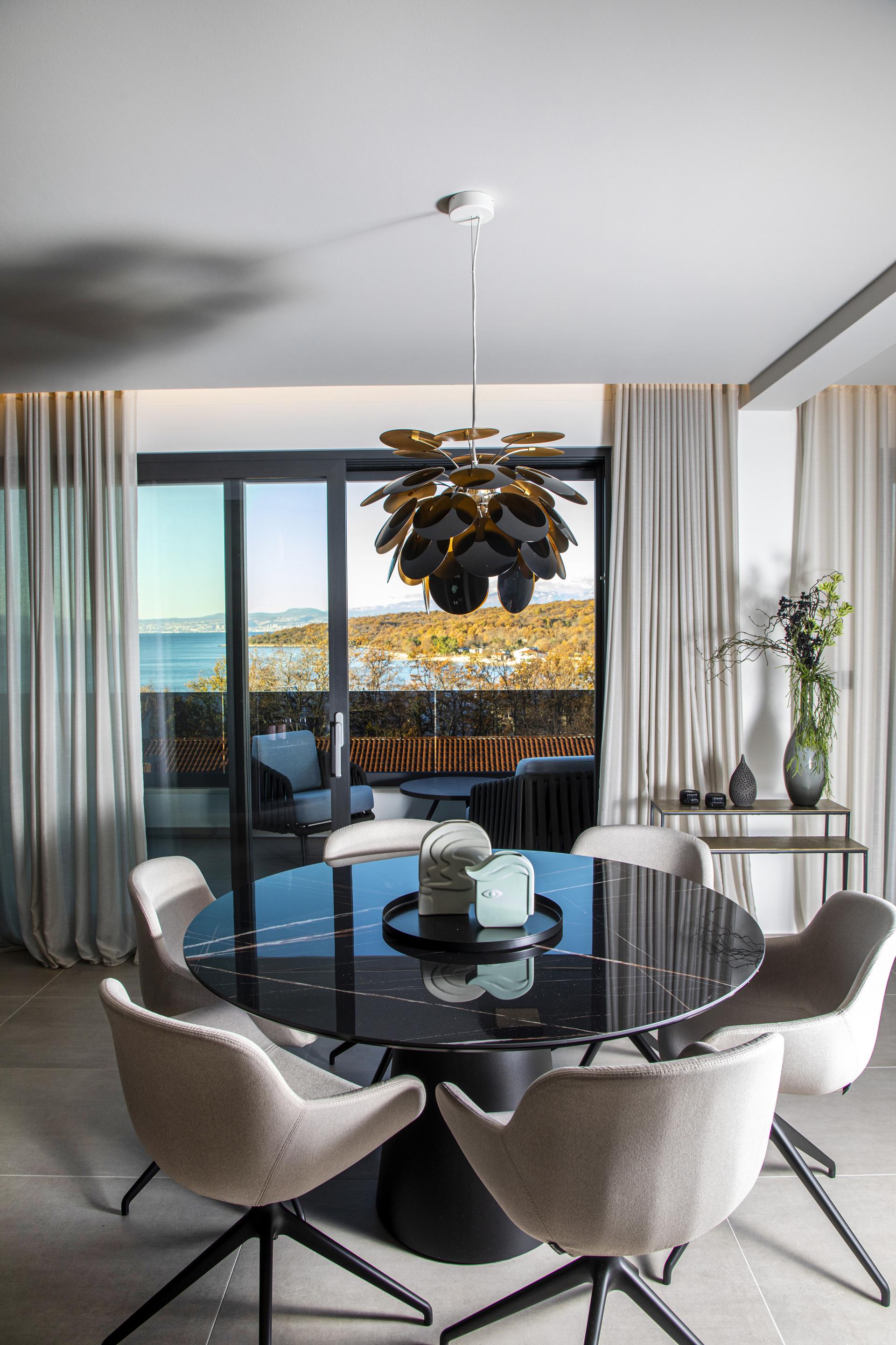 Pogled odmah privlači i crna kuhinja s otokom, a ulaskom u izduženu dnevnu zonu, koja objedinjuje prostor za kuhanje, blagovanje i odmor, uočava se jedan od glavnih aduta stana: dugačke staklene stijene koje omogućavaju otvaranje pogleda sa svih strana. Plavetnilo neba te prirodno okruženje reflektiraju se na pojedinim površinama kao što je, primjerice, blagovaonski stol, čime se stječe dojam da je krajolik dio interijera. Još veća prednost stana na moru su i dvije velike terase: natkrivena se proteže u punoj širini dnevnog boravka, a nastavlja se na krovnu terasu, koja će se uređivati uoči ljeta.