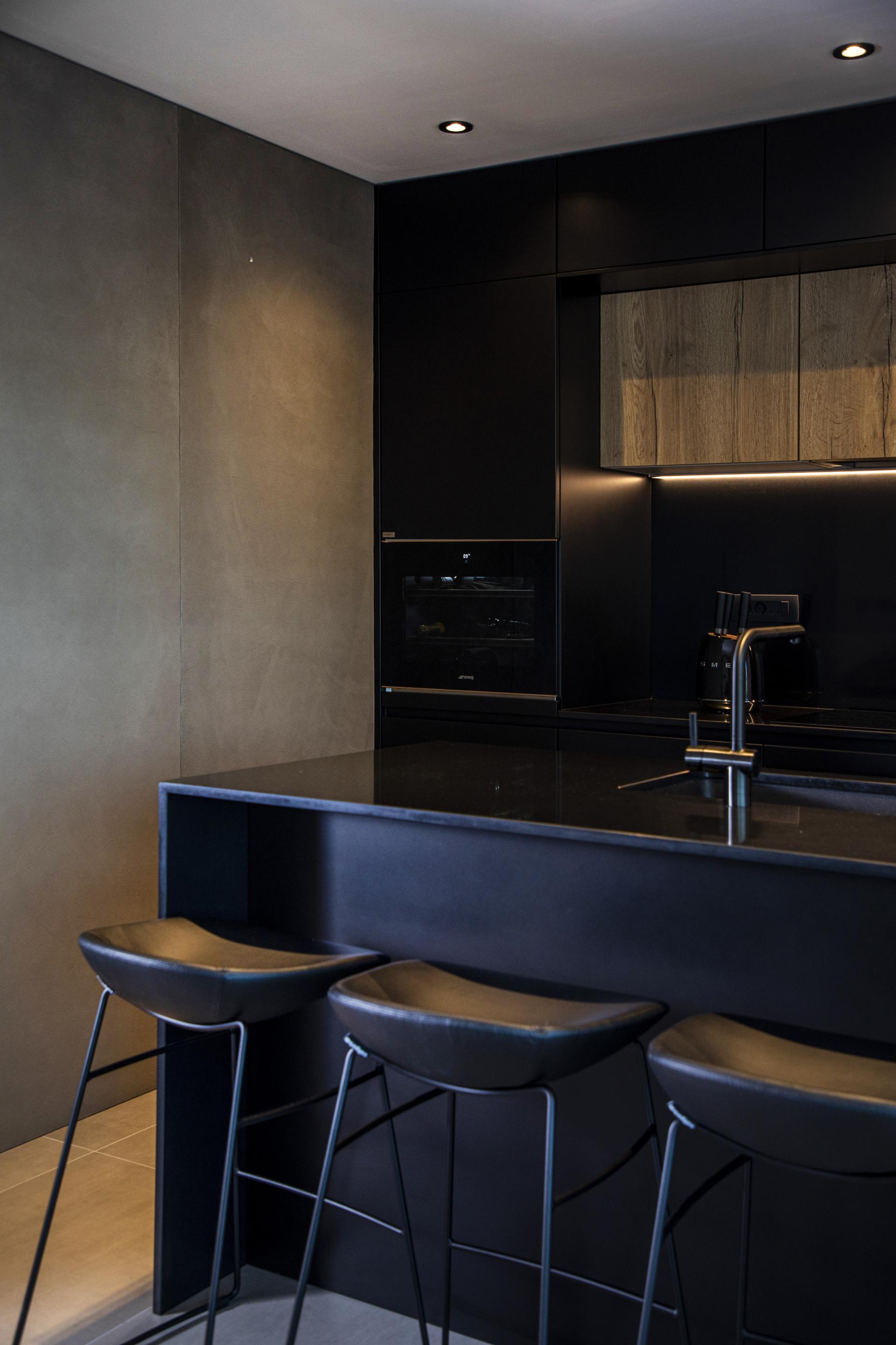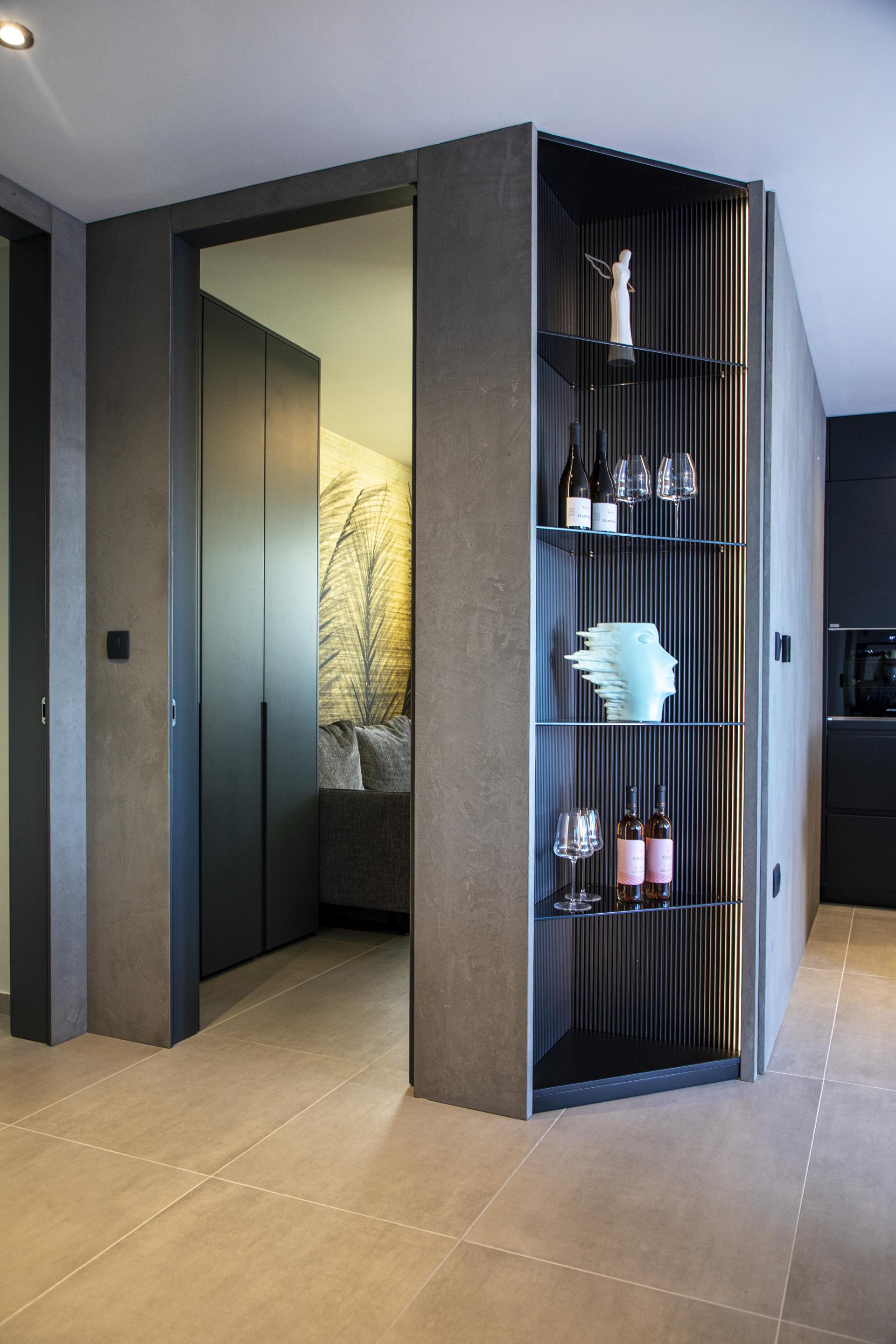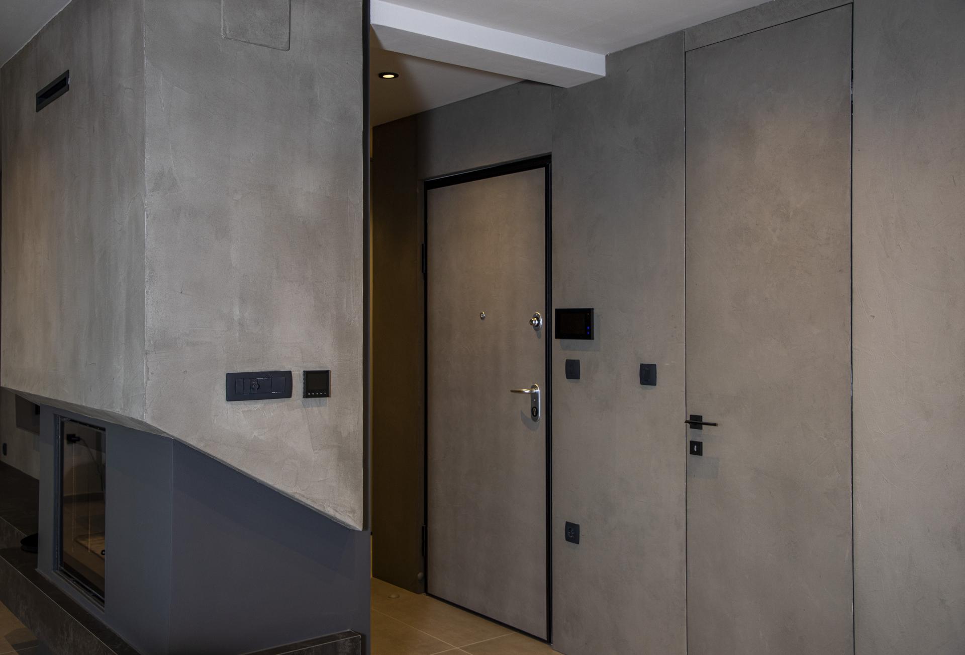 Ovaj je stan smješten na zadnjoj, trećoj etaži urbane vile, a veličine je 100 četvornih metara. Već u ulaznom hodniku daje se naslutiti da je riječ o jednostavnom i suvremenom dizajnu, ali s odvažno odabranim elementima. Dominiraju tamne, dramatične boje i pomalo neočekivani materijal. Naime, na zidovima je navučeni mikrocement, koji skriva sva sobna, pa čak i ulazna vrata, a ujedno pridonosi prostornosti cijelog prostora.