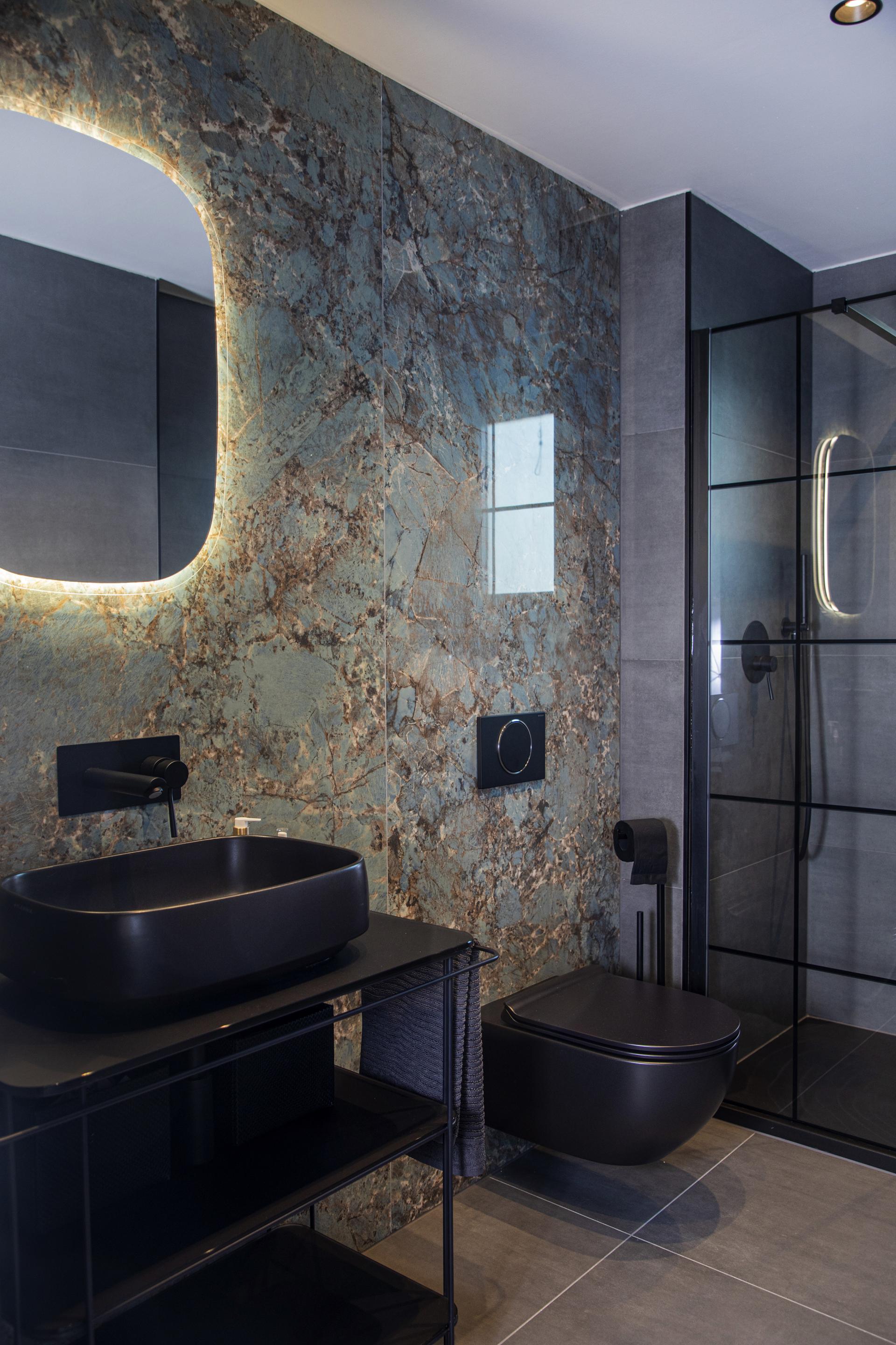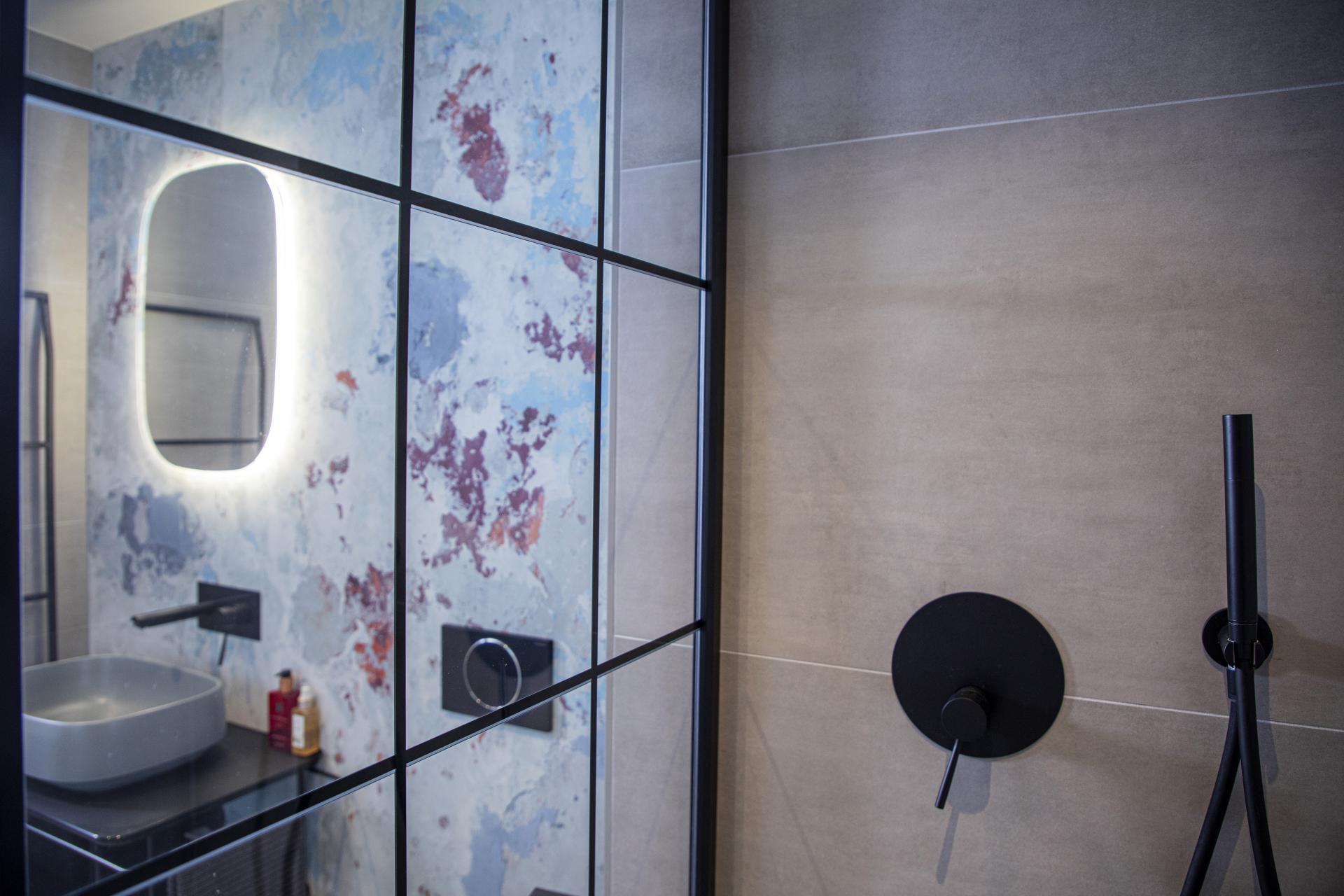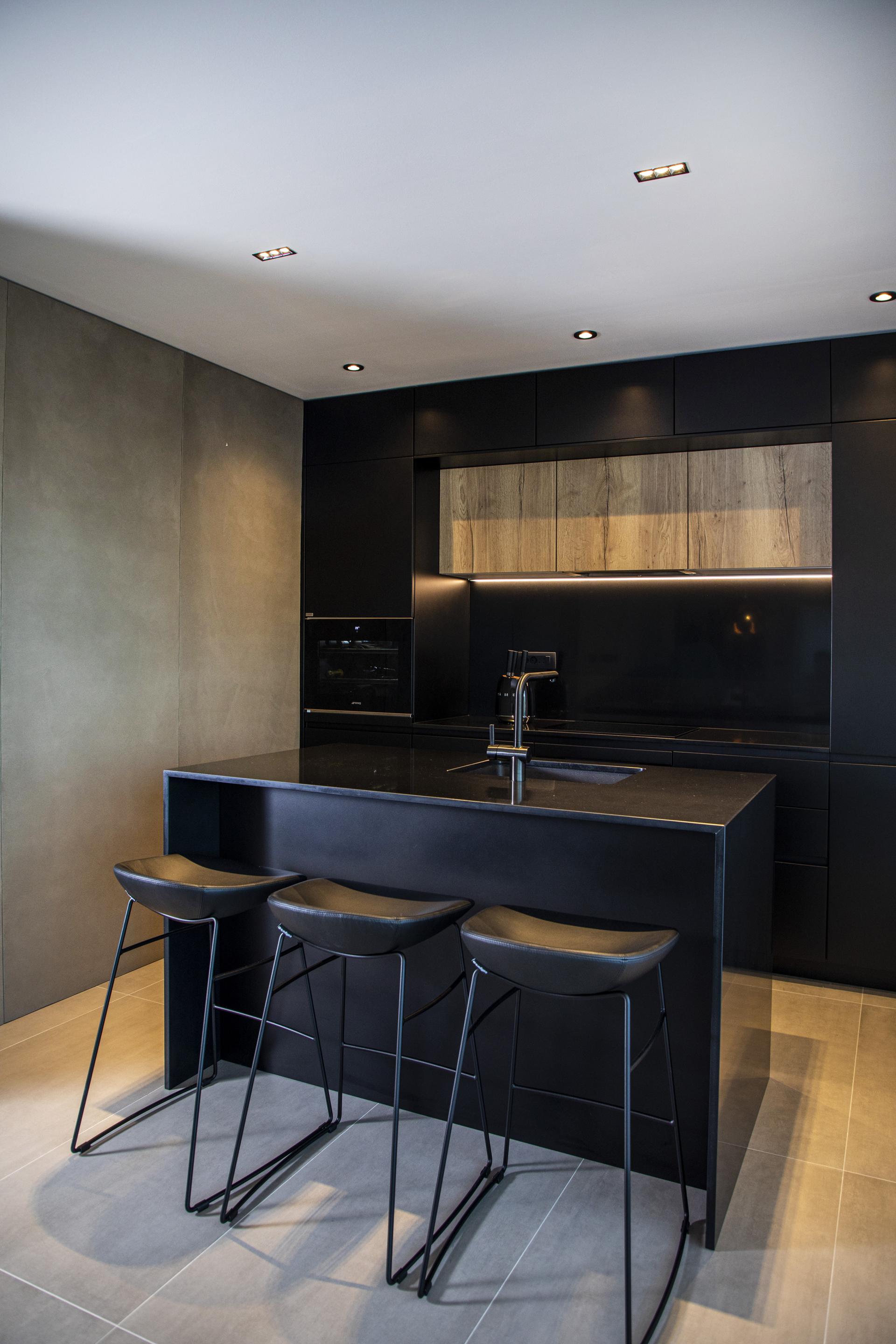Ovaj je stan smješten na zadnjoj, trećoj etaži urbane vile, a veličine je 100 četvornih metara. Već u ulaznom hodniku daje se naslutiti da je riječ o jednostavnom i suvremenom dizajnu, ali s odvažno odabranim elementima. Dominiraju tamne, dramatične boje i pomalo neočekivani materijal. Naime, na zidovima je navučeni mikrocement, koji skriva sva sobna, pa čak i ulazna vrata, a ujedno pridonosi prostornosti cijelog prostora.
