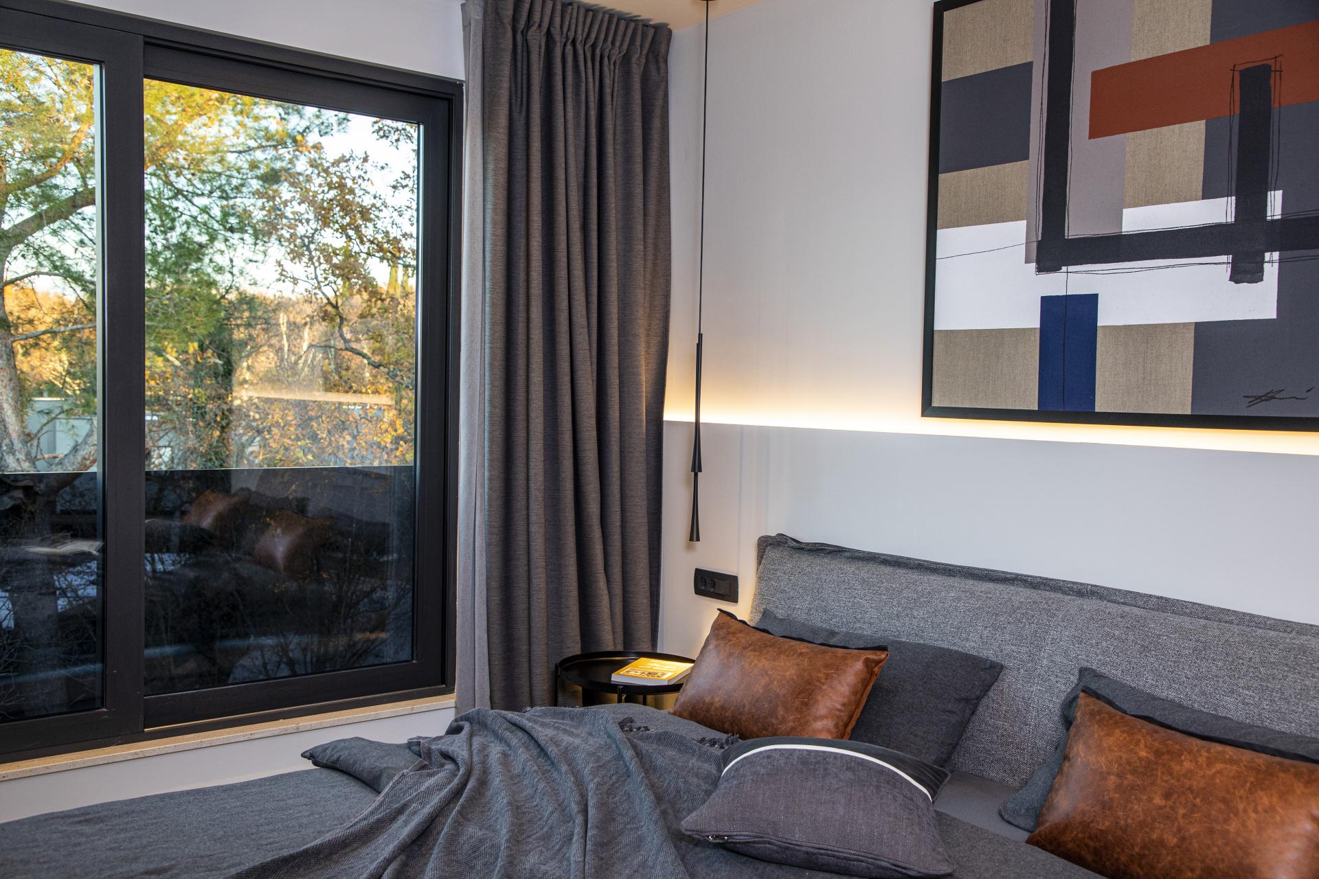 Stan još sadrži radnu sobu, ostavu i dvije spavaće sobe s velikim staklenim otvorima i staklenim ormarima s ugradbenom rasvjetom, a svaka ima i pripadajuću kupaonicu, koje su posebno dojmljive odabirom sanitarne opreme i zidnih obloga.