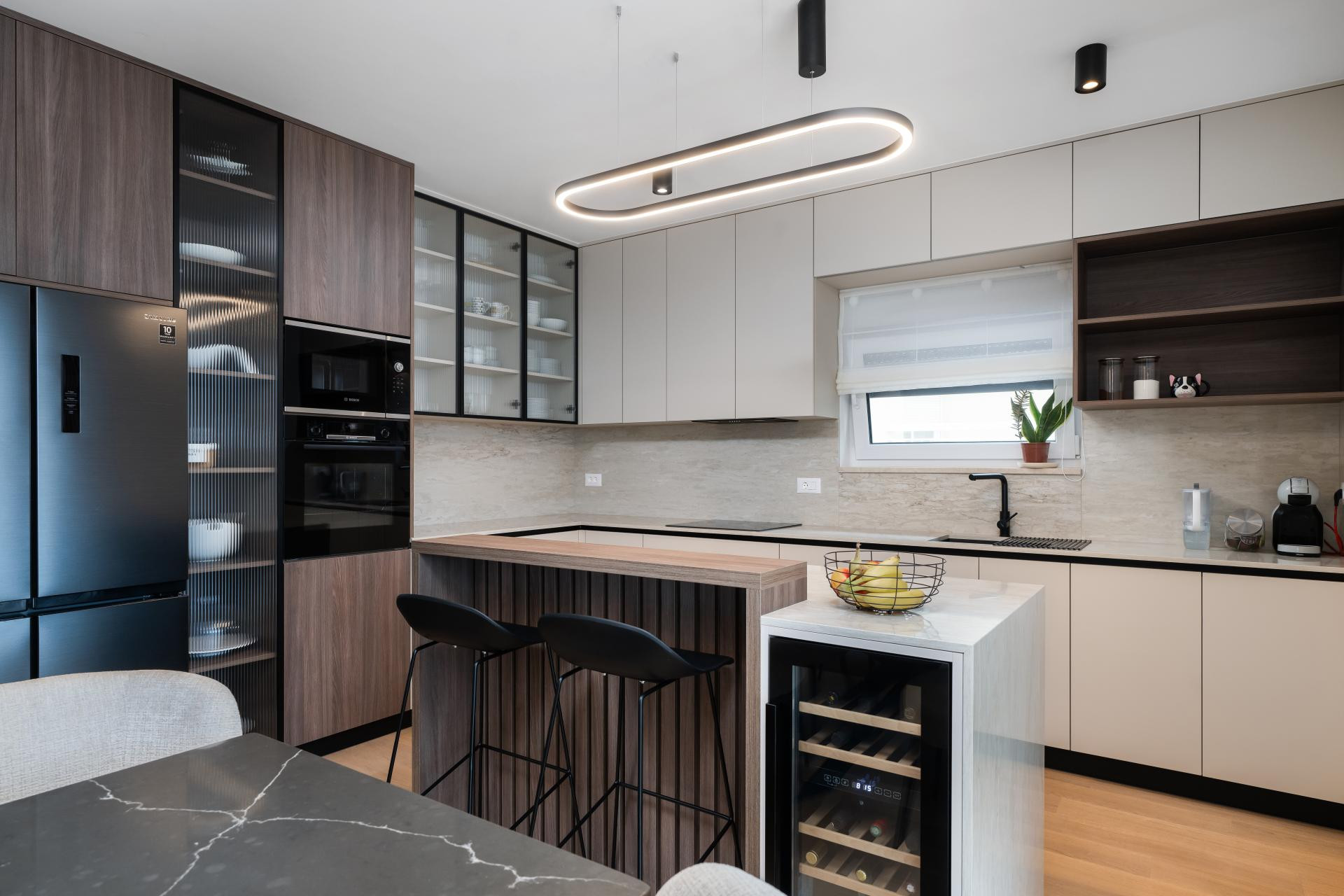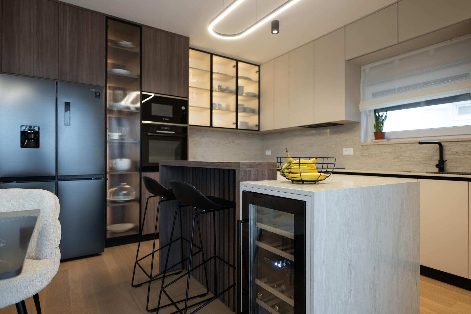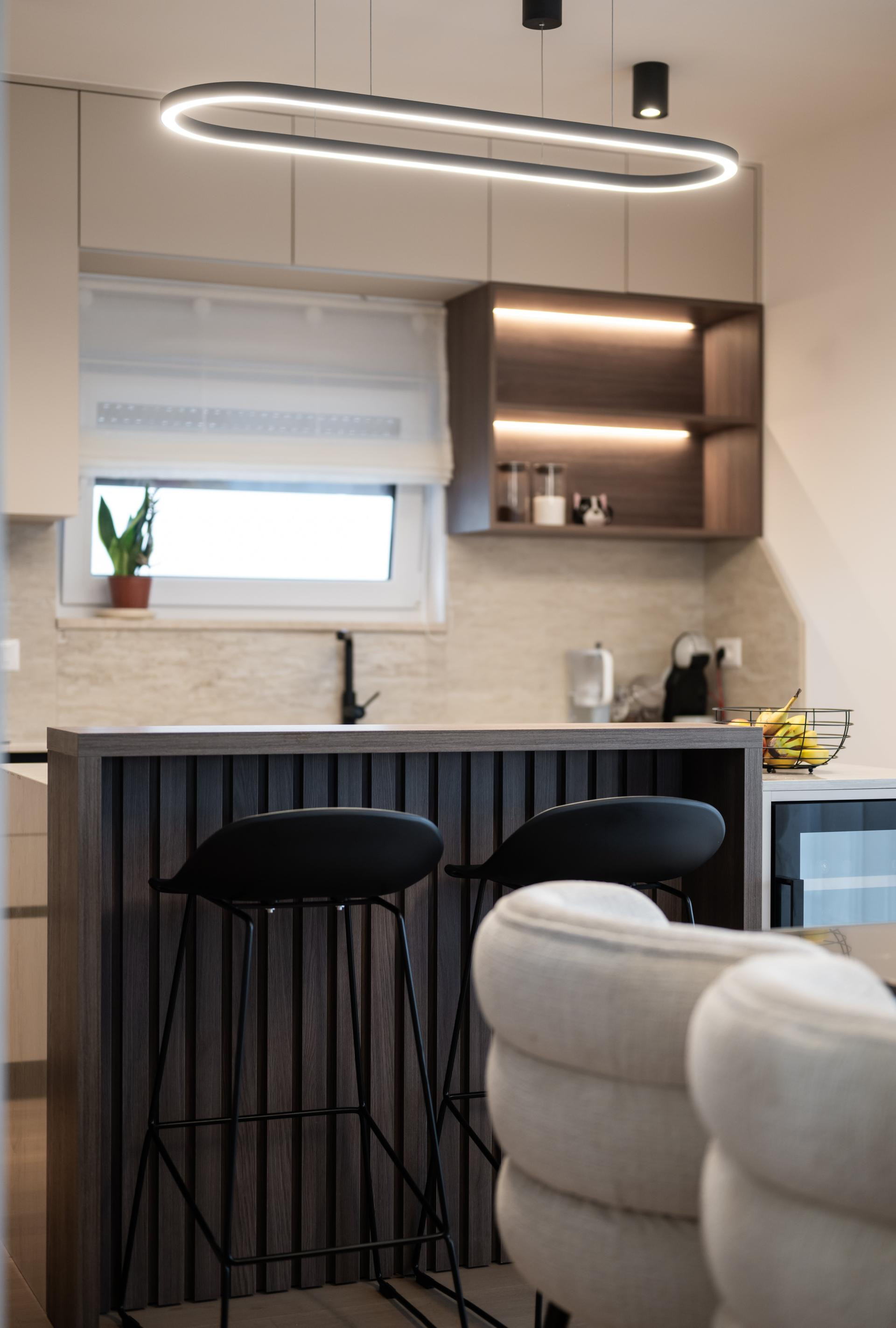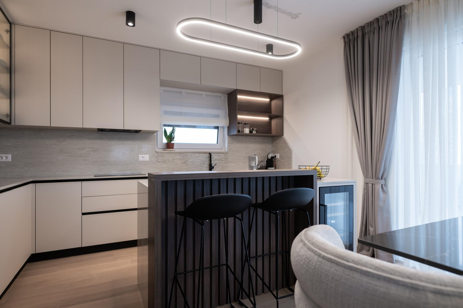 - Dnevni boravak i kuhinja predstavljaju pravu zvijezdu stana, spoj funkcionalnosti i estetike. U kuhinji smo koristili različite materijale kako bismo prostoru dali dinamiku: radna ploča i zidna obloga napravljene su od kvarca koji izgleda kao kamen travertin, dok je cijeli kuhinjski otok također obložen istim materijalom, a unutar njega je smješten vinski frižider. Blagovaonski stol je rađen po mjeri, kao i postolje ispod TV-a, te su usklađeni s kuhinjskim elementima i također obloženi kvarcom. Iza TV-a se nalaze letvice izrađene od frezanog medijapana, farbane u istu nijansu kao i kuhinja. Glavna kupaonica i gostinjski WC osmišljeni su tako da budu funkcionalni, ali i estetski ugodni.