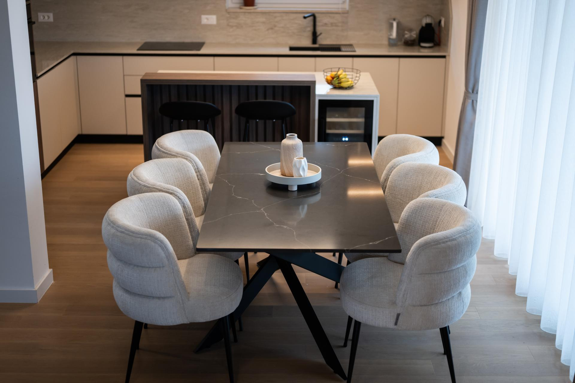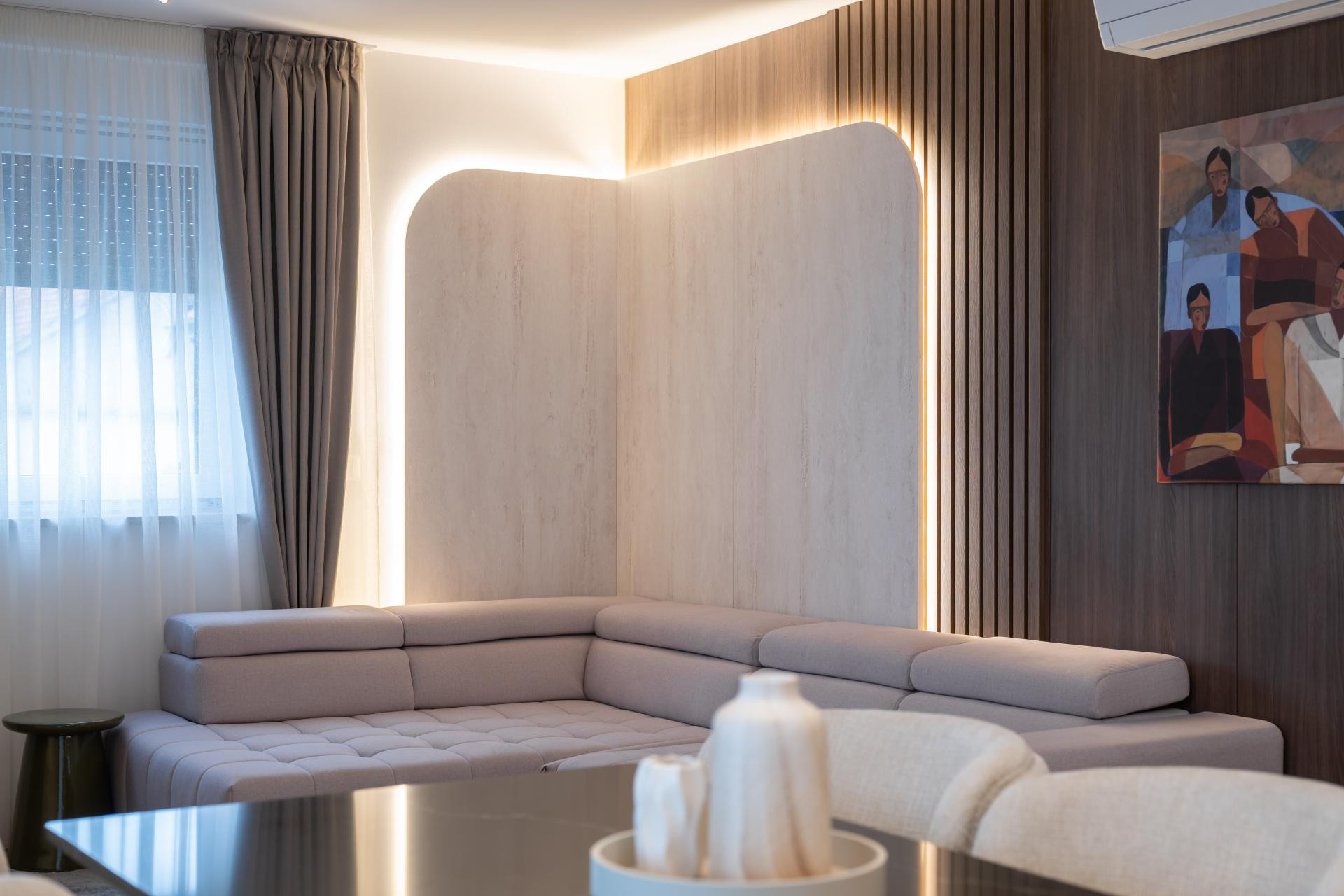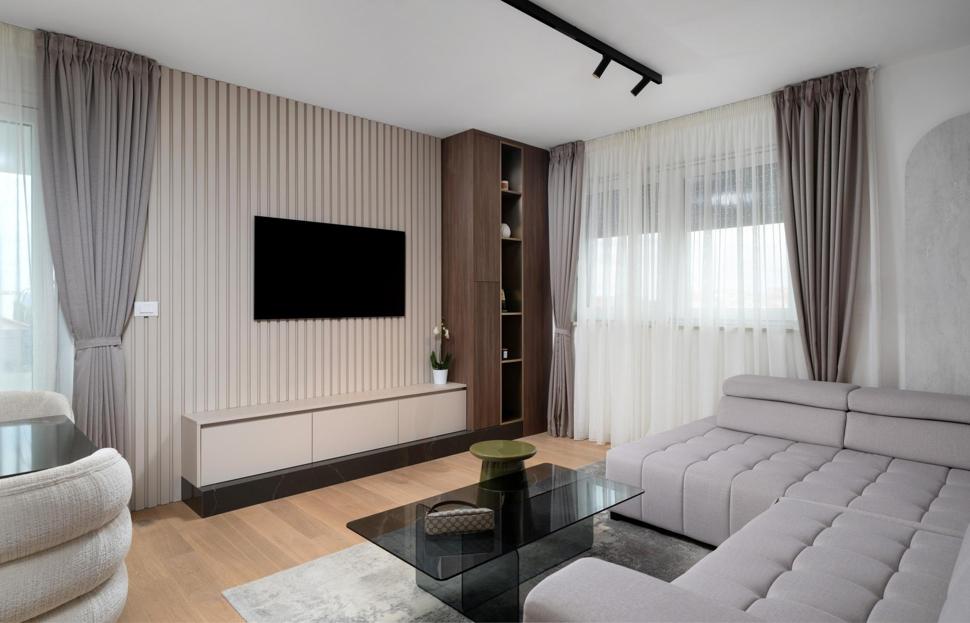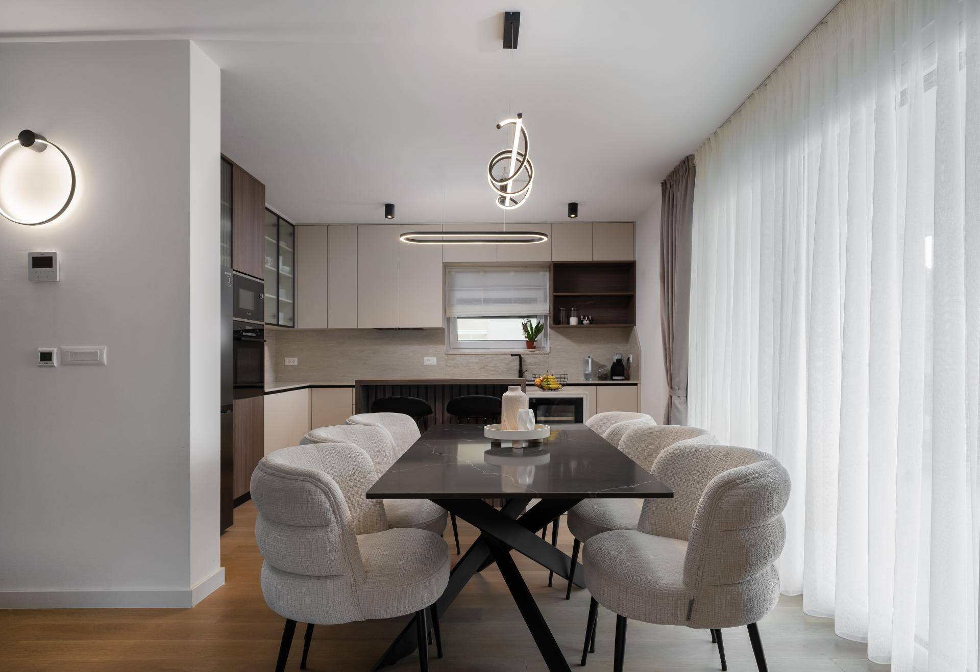 - Dnevni boravak i kuhinja predstavljaju pravu zvijezdu stana, spoj funkcionalnosti i estetike. U kuhinji smo koristili različite materijale kako bismo prostoru dali dinamiku: radna ploča i zidna obloga napravljene su od kvarca koji izgleda kao kamen travertin, dok je cijeli kuhinjski otok također obložen istim materijalom, a unutar njega je smješten vinski frižider. Blagovaonski stol je rađen po mjeri, kao i postolje ispod TV-a, te su usklađeni s kuhinjskim elementima i također obloženi kvarcom. Iza TV-a se nalaze letvice izrađene od frezanog medijapana, farbane u istu nijansu kao i kuhinja. Glavna kupaonica i gostinjski WC osmišljeni su tako da budu funkcionalni, ali i estetski ugodni.
