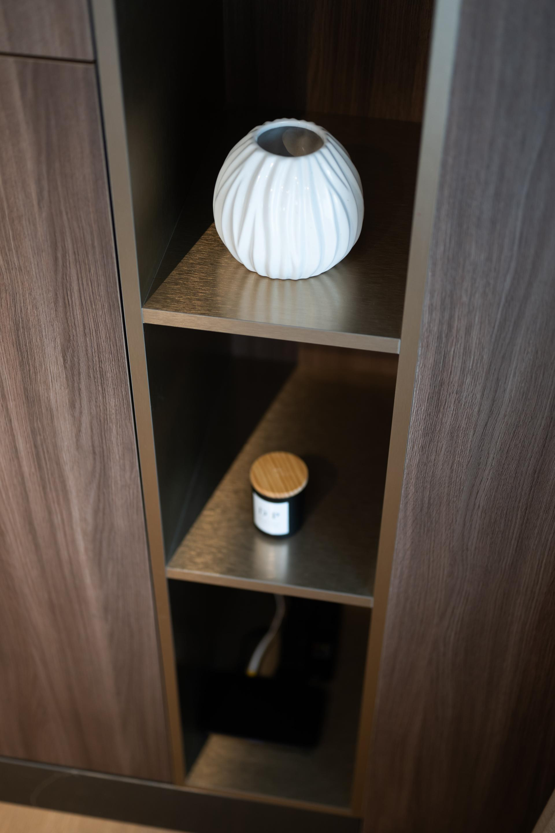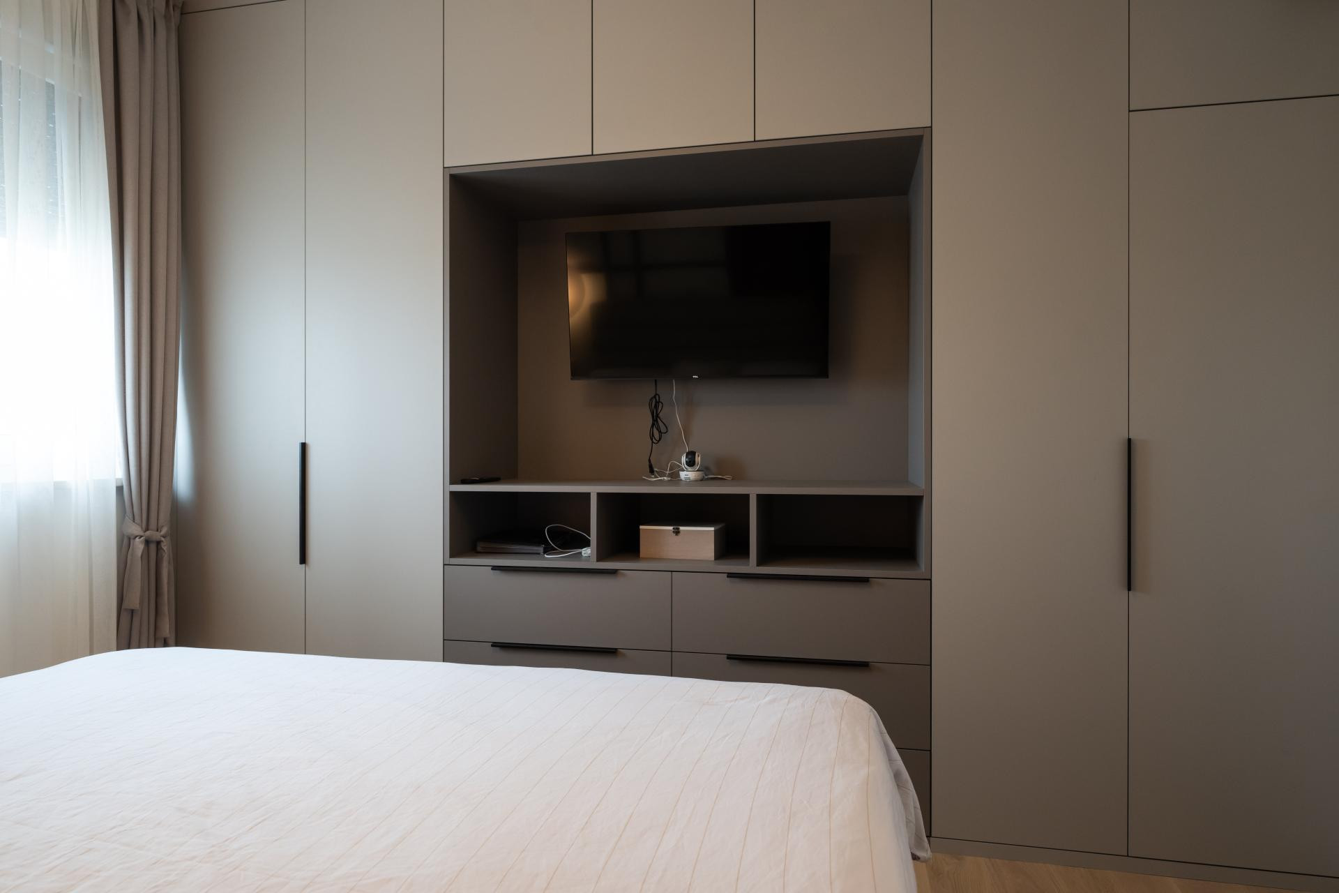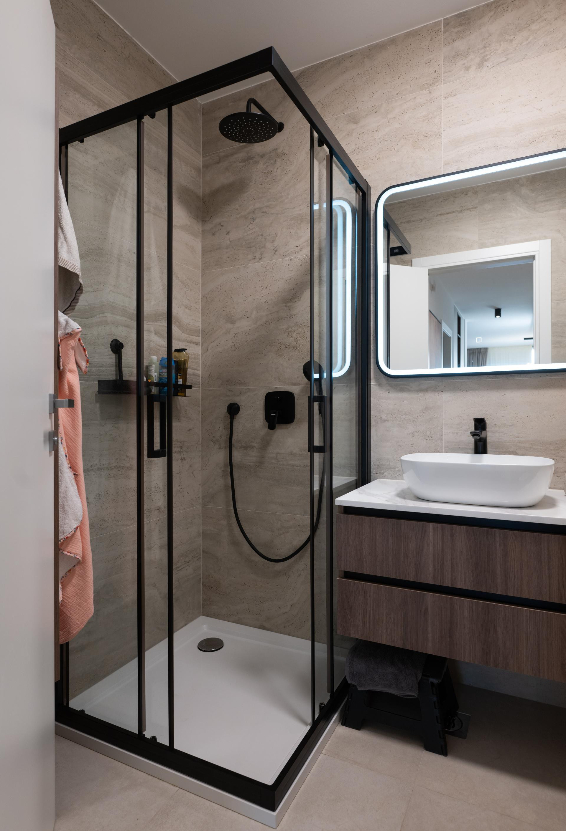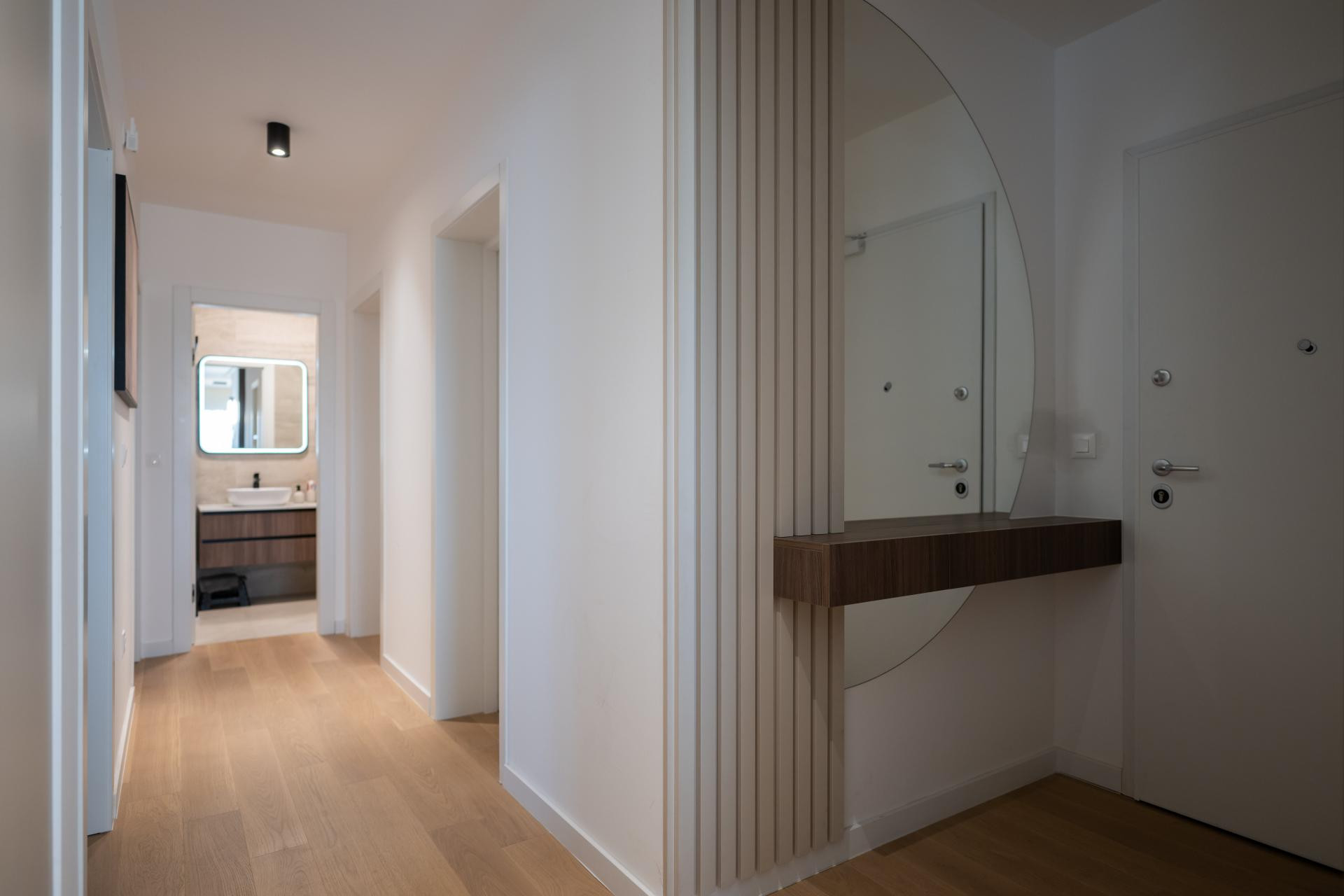 - Dnevni boravak i kuhinja predstavljaju pravu zvijezdu stana, spoj funkcionalnosti i estetike. U kuhinji smo koristili različite materijale kako bismo prostoru dali dinamiku: radna ploča i zidna obloga napravljene su od kvarca koji izgleda kao kamen travertin, dok je cijeli kuhinjski otok također obložen istim materijalom, a unutar njega je smješten vinski frižider. Blagovaonski stol je rađen po mjeri, kao i postolje ispod TV-a, te su usklađeni s kuhinjskim elementima i također obloženi kvarcom. Iza TV-a se nalaze letvice izrađene od frezanog medijapana, farbane u istu nijansu kao i kuhinja. Glavna kupaonica i gostinjski WC osmišljeni su tako da budu funkcionalni, ali i estetski ugodni.