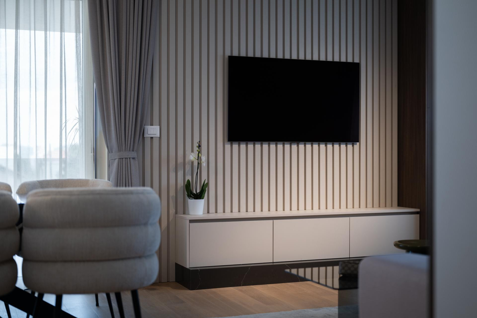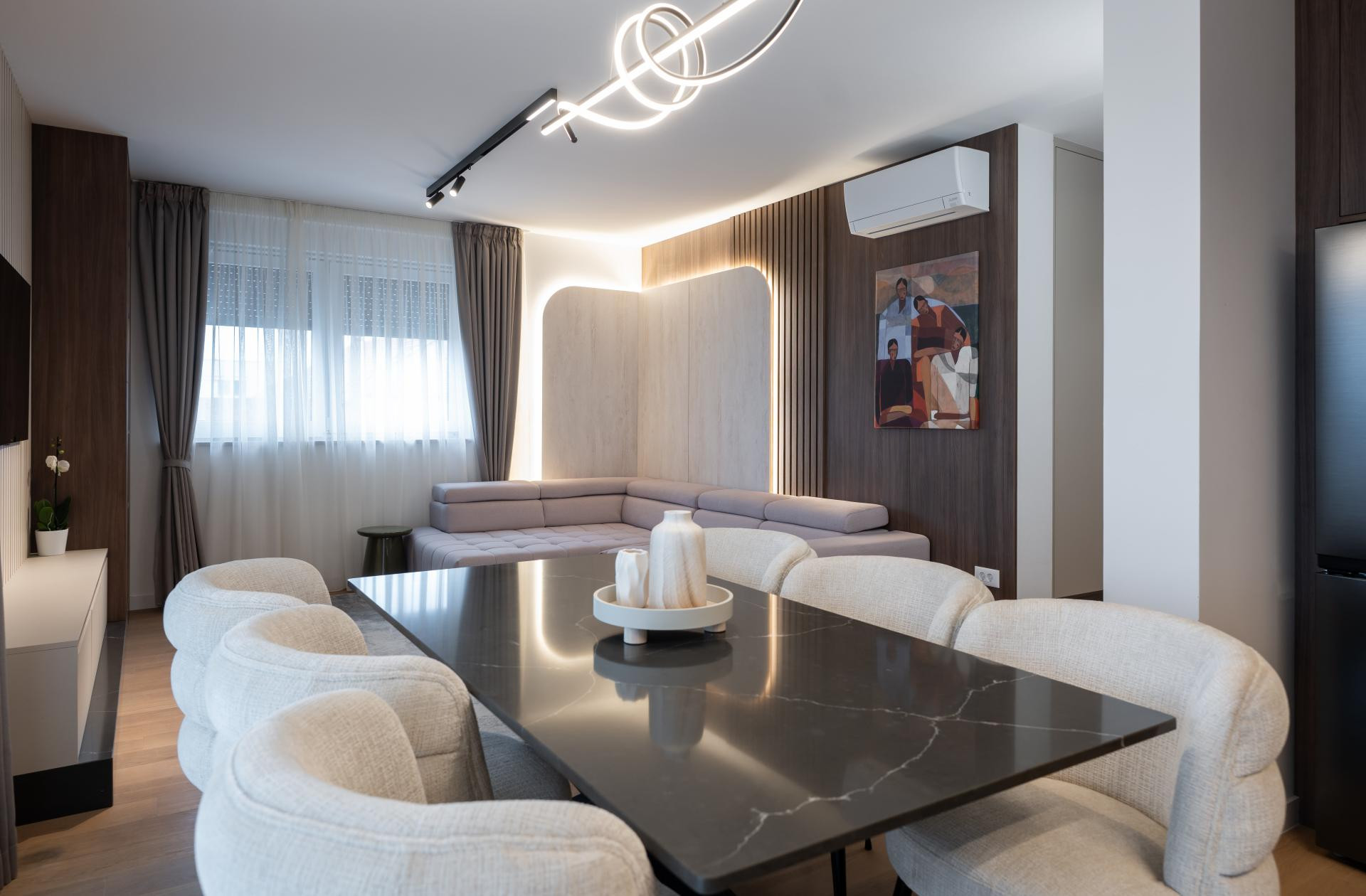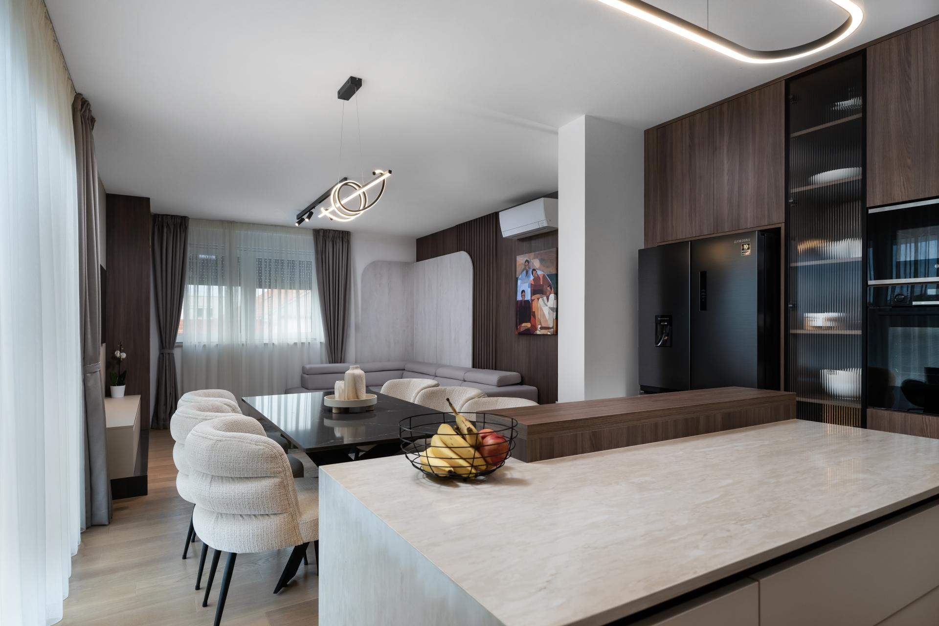 Sav namještaj u stanu je nov i većina je rađena po mjeri, kako bi se lijepo uklopio u prostor i odgovarao potrebama obitelji. Uz to, u dnevnom boravku su kupljeni dizajnerski komadi poput kauča, stolica, tepiha i stolića, kao i pažljivo odabrana rasvjeta, koja dodatno naglašava karakter prostora i povezuje cjelokupni interijer.