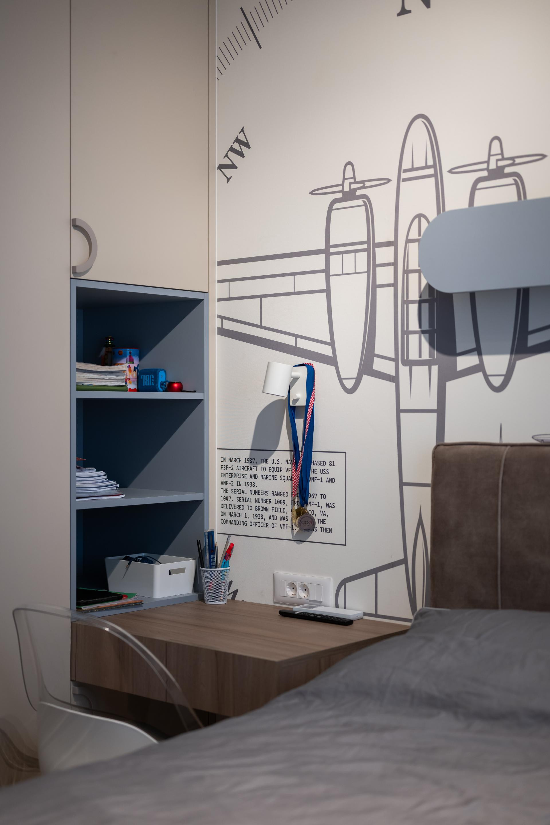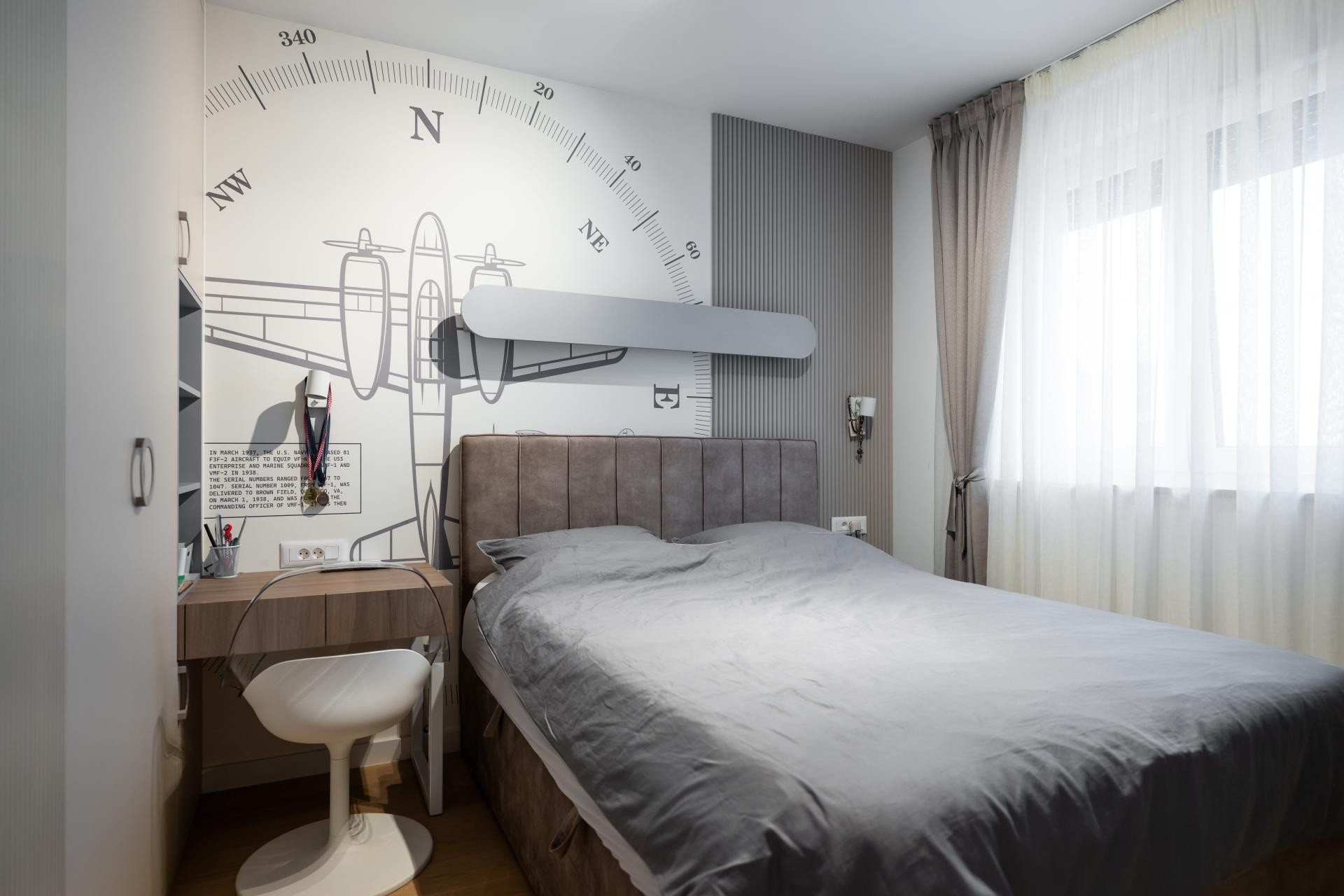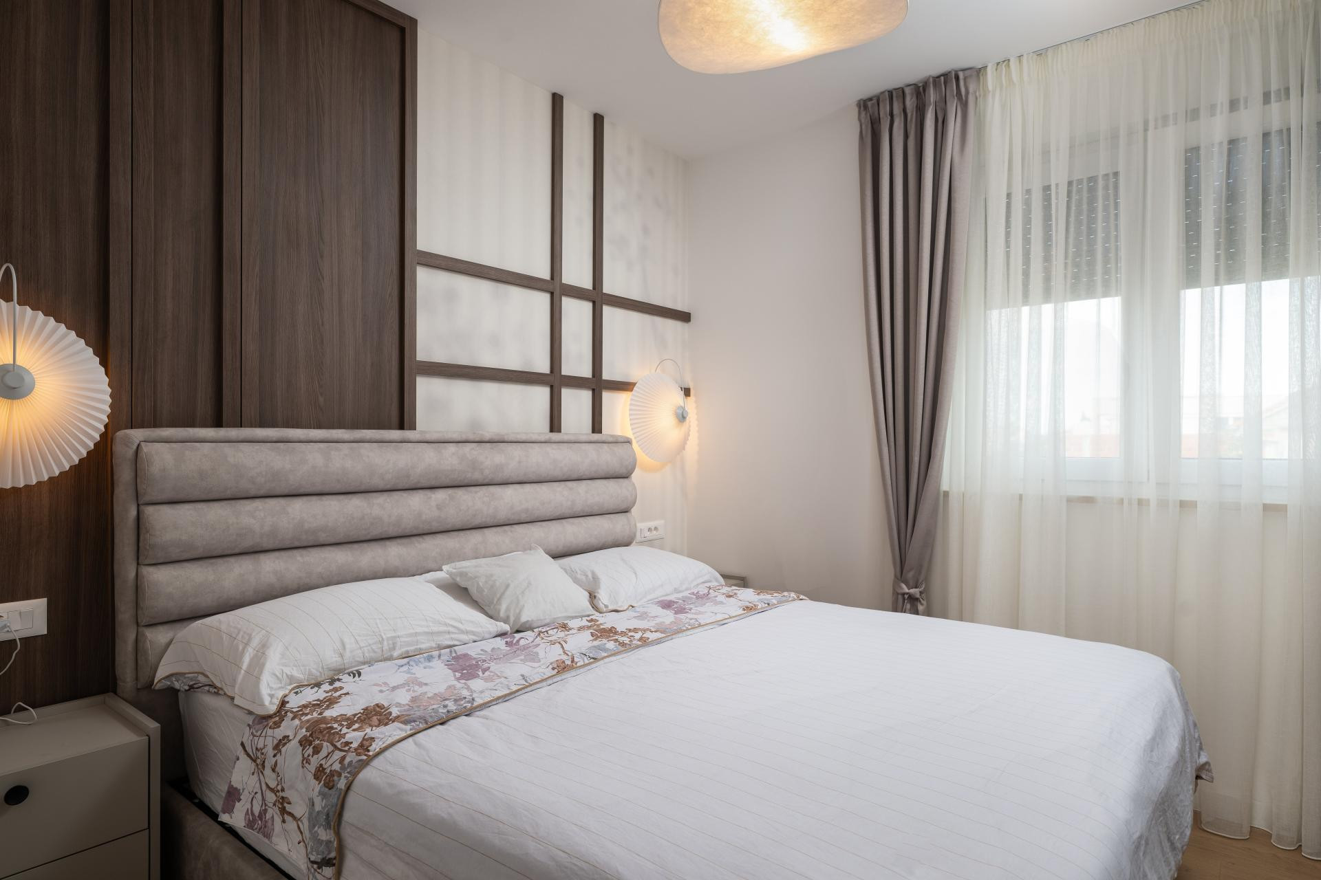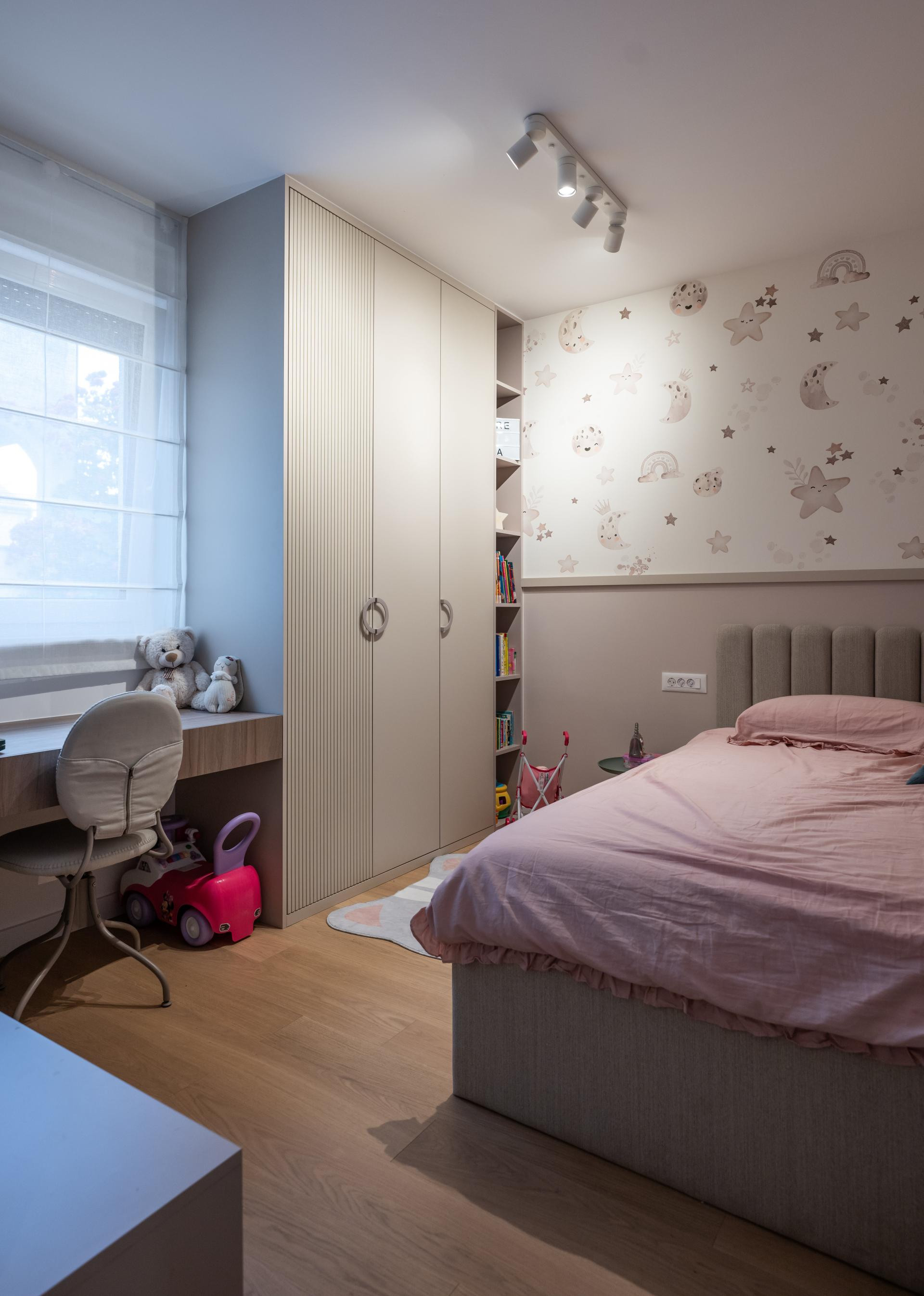 Dječje sobe su, pak, u potpunosti prilagođene mališanima i njihovim karakterima. Jedna je uređena za dječaka, u kombinaciji sivih, plavih i bež tonova, s razigranom zidnom tapetom s motivima aviona i kompasa brenda Wall LAB, koja prostoru daje poseban šarm i dinamiku. Soba djevojčice odiše nježnošću kroz blage roza i bež tonove. Iako je još mala, u prostor je Daniela Perica odlučila ugraditi i radni stol kako bi soba bila funkcionalna i u narednim godinama. Na zidu se također nalazi tapeta Wall LAB, koja zaokružuje cjelinu i unosi dozu razigranosti i topline. Glavna spavaća soba zamišljena je kao mirna oaza doma, prostor za odmor i opuštanje. Nježna zidna tapeta u kombinaciji s drvenim letvicama stvara toplu i umirujuću pozadinu, dok pažljivo odabrane zidne lampe i luster unose dašak japandi stila i dodatno naglašavaju profinjenu, smirenu atmosferu sobe.