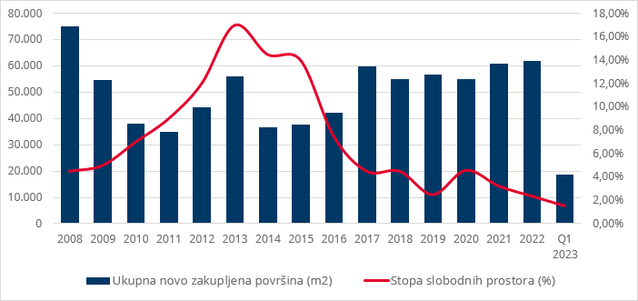 Tržište je i dalje obilježeno rekordno niskom stopom raspoloživih uredskih prostora, koja je tijekom prvog kvartala bila na razini ispod 2%, što je najniža stopa u posljednjih 14 godina te je dvostruko niža u odnosu na isti period prošle godine.