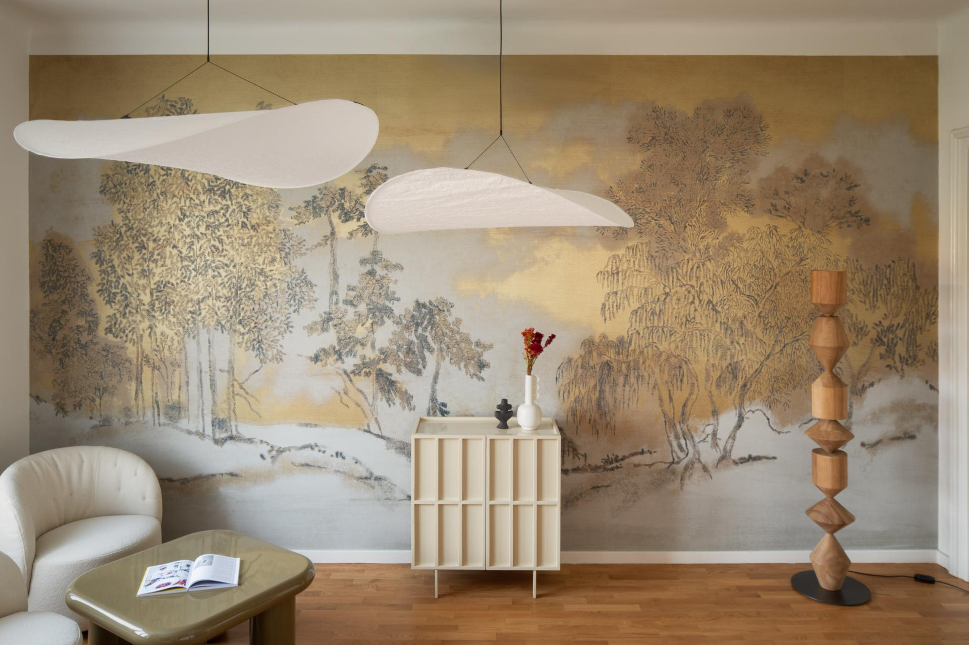Logično je bilo zadržati prekrasne salone u primarnoj funkciji primanja i ugošćivanja pa je u prvom danas soba za individualne tretmane: definiraju je jesenske i zemljane boje, eterično i mekano osvjetljenje, te dominantna zidna tapeta od svilenog papira brenda Casamance. Motiv poznatog japanskog Koraku vrta u proljetno vrijeme zauzima cijeli jedan zid.