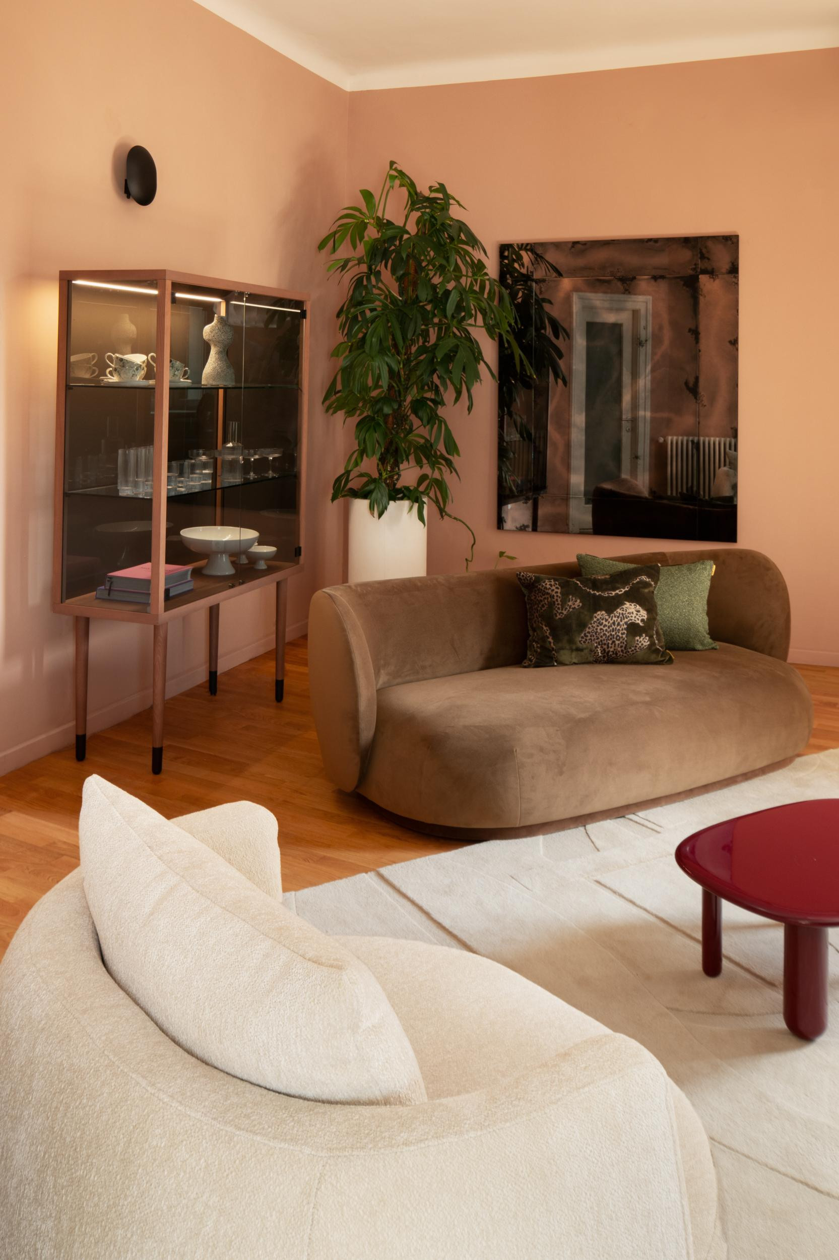 Četvrti salon danas je udobni dnevni boravak - eklektičnog je karaktera i inspiriran milanskim interijerima, ali u tonovima koji su usklađeni s ostatkom centra. Tepih Collage brenda Toulemond Bouchart te dvije mekane smeđe sofe Ferm Living u njemu stvaraju cozy atmosferu, a stakleni bar Miniforms (umjesto bocama pića ispunjen umjetninama i dizajnerskim suvenirima s putovanja) naglašava eleganciju tog prostora – koji nije namijenjen samo opuštanju i druženju nakon tretmana, nego i nutricionističkim savjetovanjima.