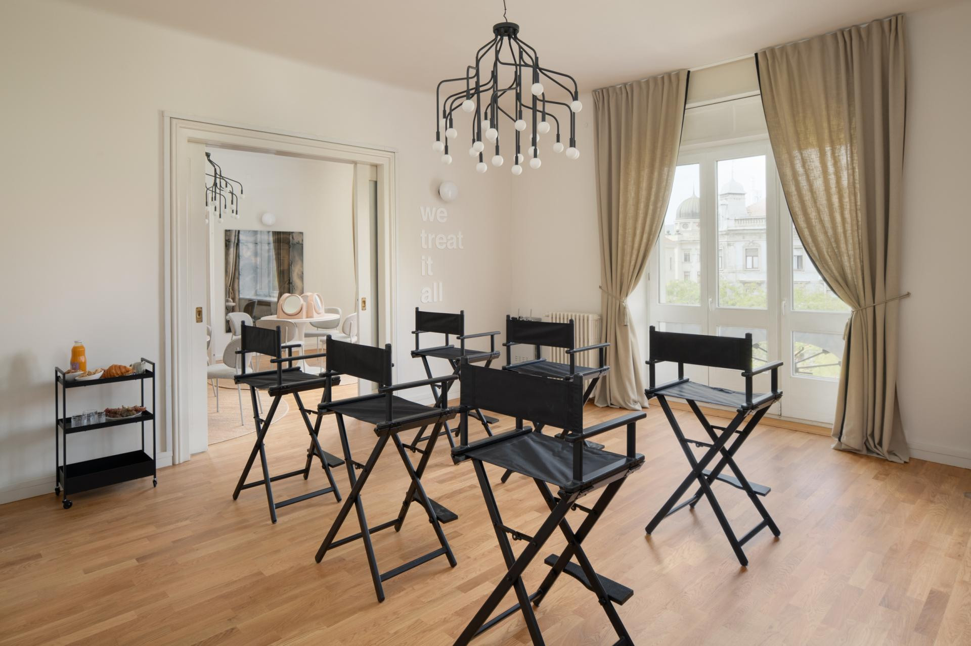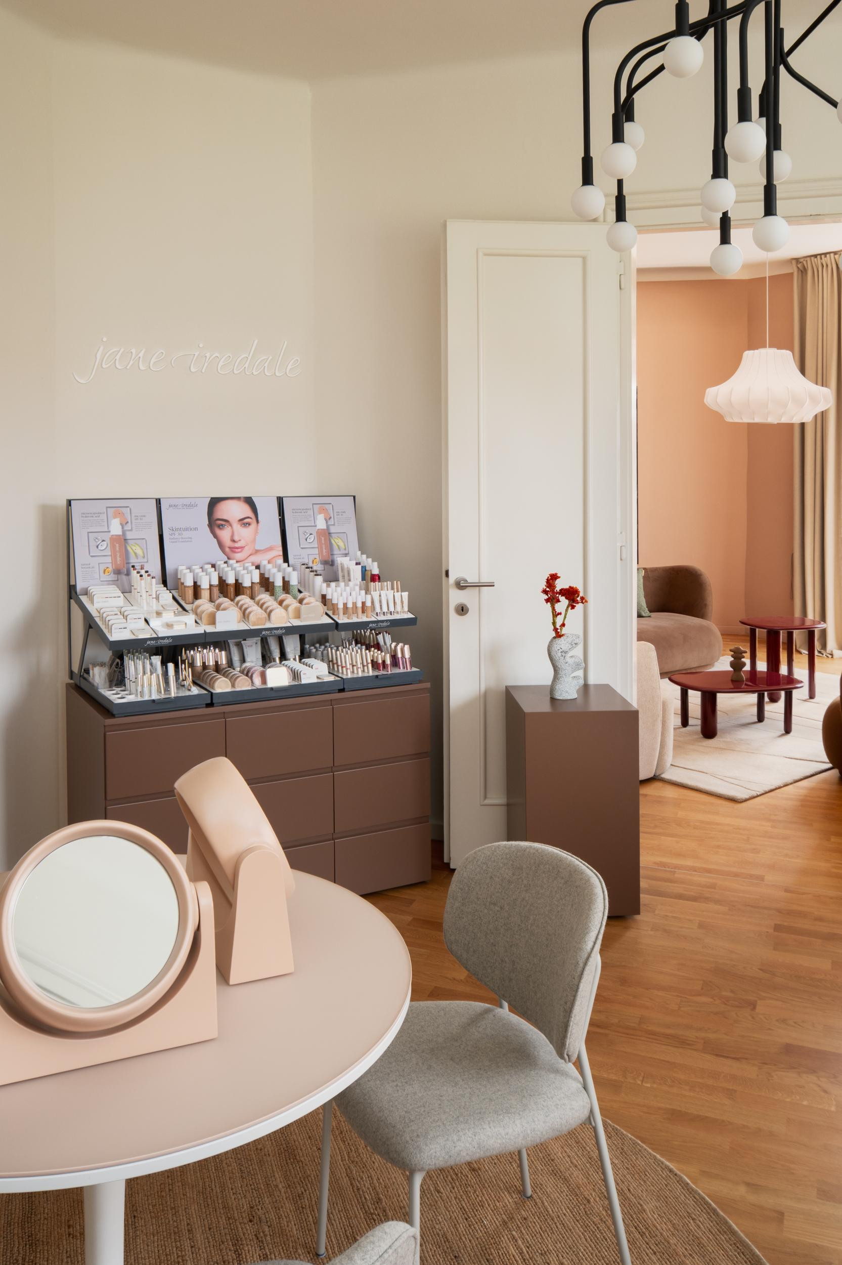 Druga dva salona postala su sobe za edukacije. Jedna je opremljena radnim stolovima prilagođenima make-up radionicama, a druga je namijenjena radionicama iz područja njege kože. Obje se mogu reorganizirati i transformirati, a dodavanjem stolaca lako se pretvaraju u prostore za predavanja ili različite evente. Namještaj je funkcionalan i praktičan, a dizajnerski štih prvoj sobi daju dvije komode brenda Miniforms, koje plijene pažnju odvažnom tamnocrvenom bojom i neobičnom teksturom prednjih fronta. Na jednu je postavljena velika vaza, rad umjetnice Louise Roe, a na drugu svjetiljka Sculpture brenda Vipp. Kroz obje sobe diskretno se provlače prepoznatljivi elementi Jane Iredale i Dermalogice - čime se naglašava profesionalnost i usklađenost prostora s brendovima koje predstavlja.