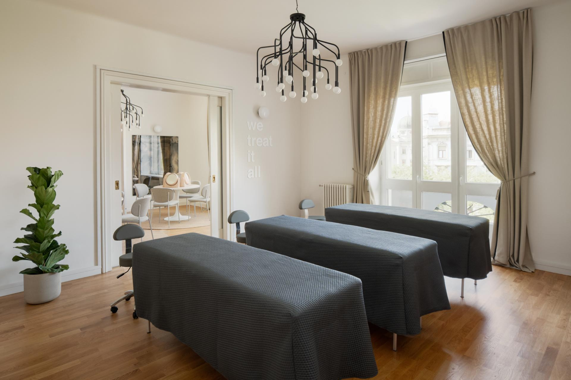 Kad smo prvi put ušle u taj predivni stan s visokim stropovima, prostranim prozorima i klasičnom arhitektonskom elegancijom, osjetile smo golemi potencijal koji se otvara na tih 160 četvornih metara. Vidjele smo puno svjetla, prozračnosti i karaktera, ali i osjetile da traži novu namjenu koja će ga osloboditi i istaknuti – kaže Jelena Babić, dodajući da je kod prenamjene ovakvog tipa prostora najveći izazov zadržati duh građanskog stana, a istodobno ga prilagoditi suvremenim zahtjevima beauty centra. Često se tu sklizne u neku krajnost - ili ispadne previše hladno i medicinski sterilno, ili pak pretjerano dekorativno i nefunkcionalno – no tri kreativke su itekako pazile da pronađu ravnotežu.