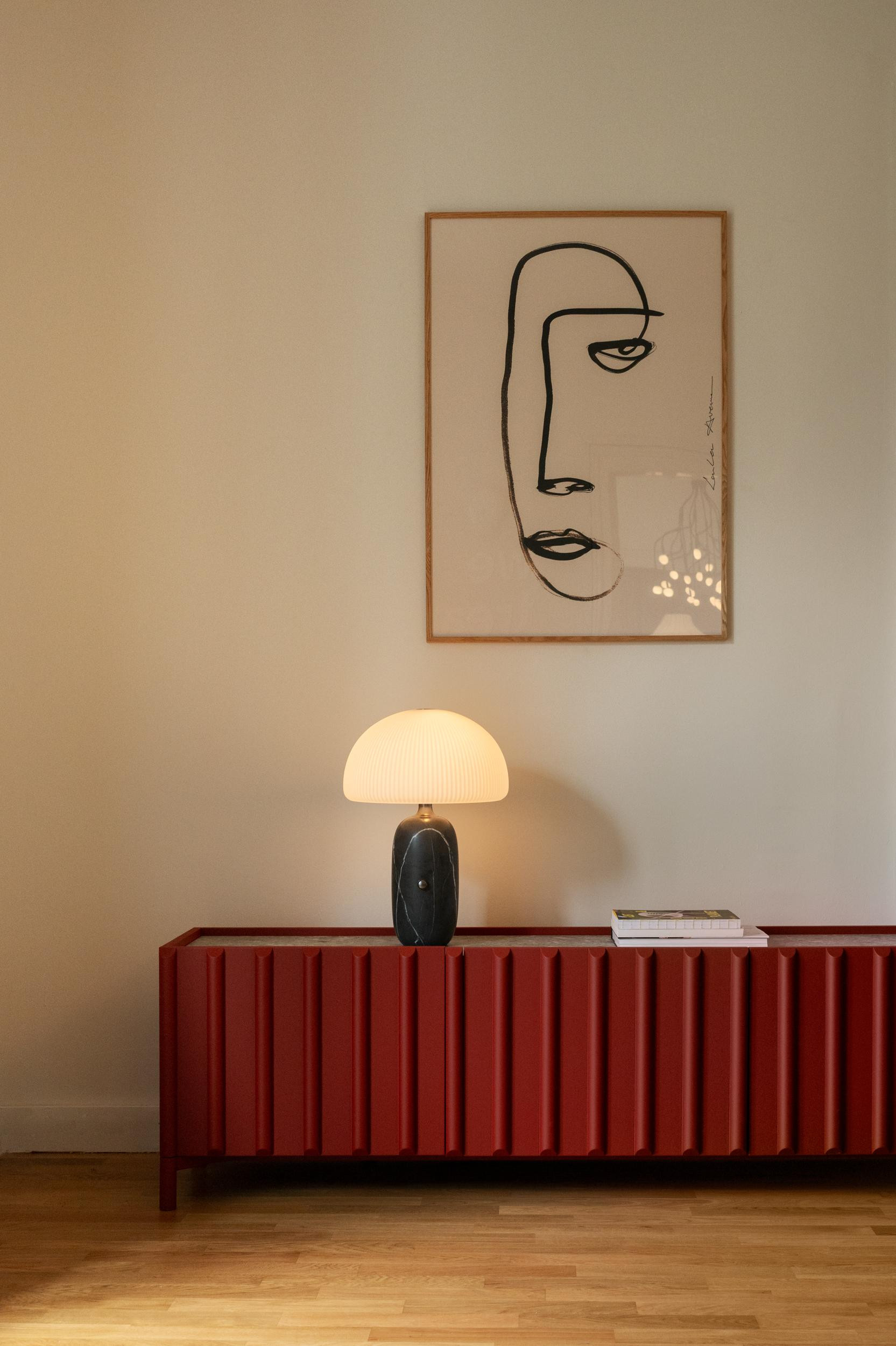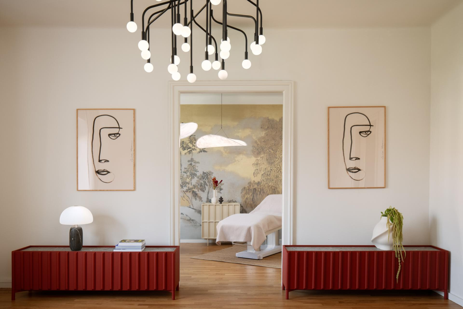 I rasvjeta je, nastavlja Anita Krmek, jedan od ključnih elemenata za doživljaj prostora. Stoga je u tretmanskoj sobi ona neutralna i precizna, dok je u lounge dijelu ambijentalna i opuštajuća. Rasvjetna tijela su minimalistička i djeluju gotovo skulpturalno – što je dobar opis za impozantne visilice Phantom danskog brenda Norman Copenhagen. Stolovi za tretmane dizajnirani su za maksimalno opuštanje, kao i artistički oblikovani Bilbao stolići za kavu iz talijanske kuće dizajna Mogg. Veličanstvena Puffy lounge fotelja (neovisnog dizajnerskog brenda Hem iz Stockholma) smještena je u ulaznom prostoru – kako bi poželjela dobrodošlicu svakom klijentu koji dolazi. Umjetnički potencijal ovog građanskog stana naglašen je posebno dizajniranim komadima poput drvenih podnih svjetiljki Constantina iz Mogga, ali i radovima suvremenih umjetnika – nekolicine domaćih autora (Domagoj Rogina, Maroje Batić i Hana Hanak) te europskih umjetnika, uključujući linoreze Jazmine Joye. Oni ovaj interijer čine jedinstvenim, daju mu osobnu notu i dodatnu slojevitost.