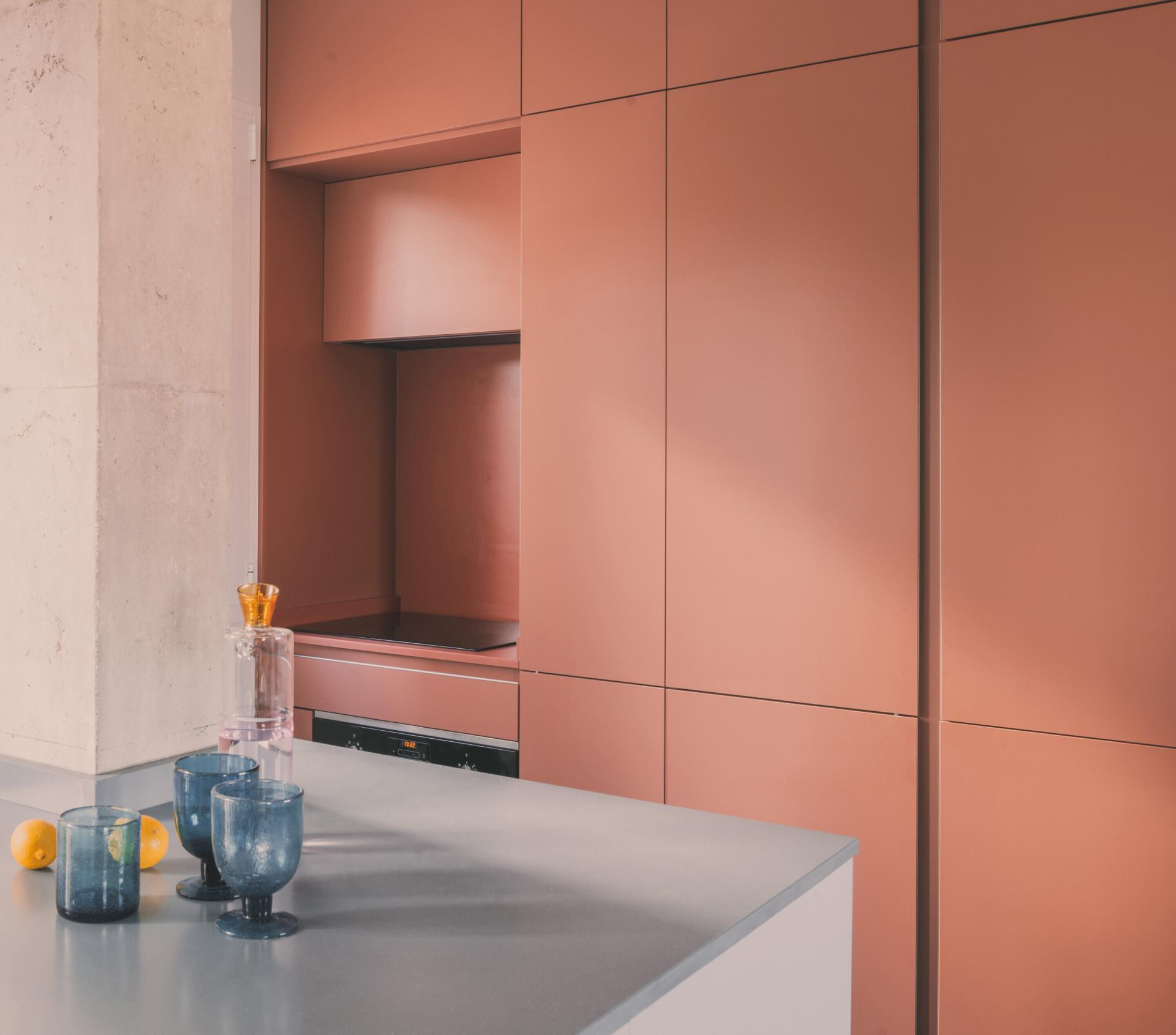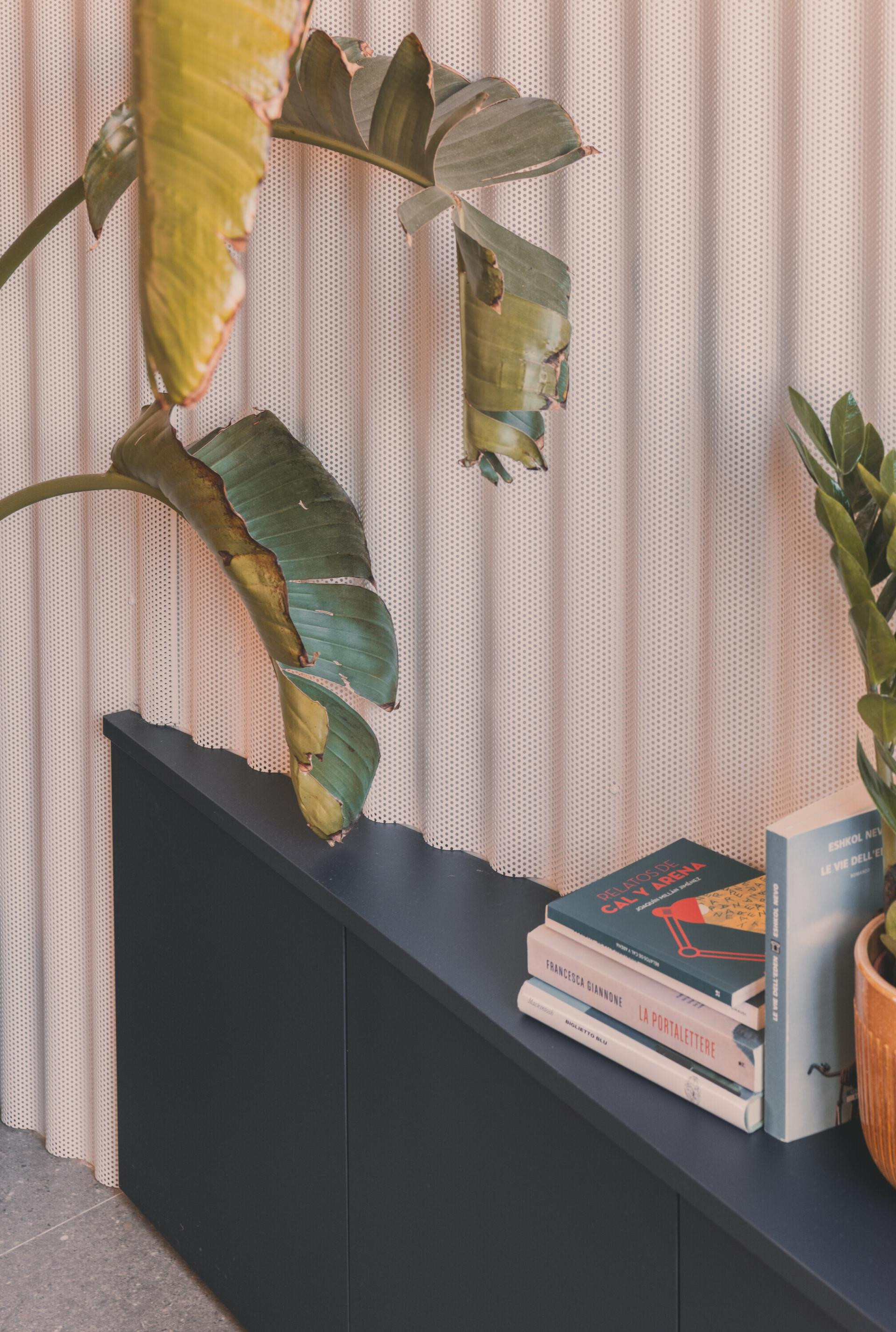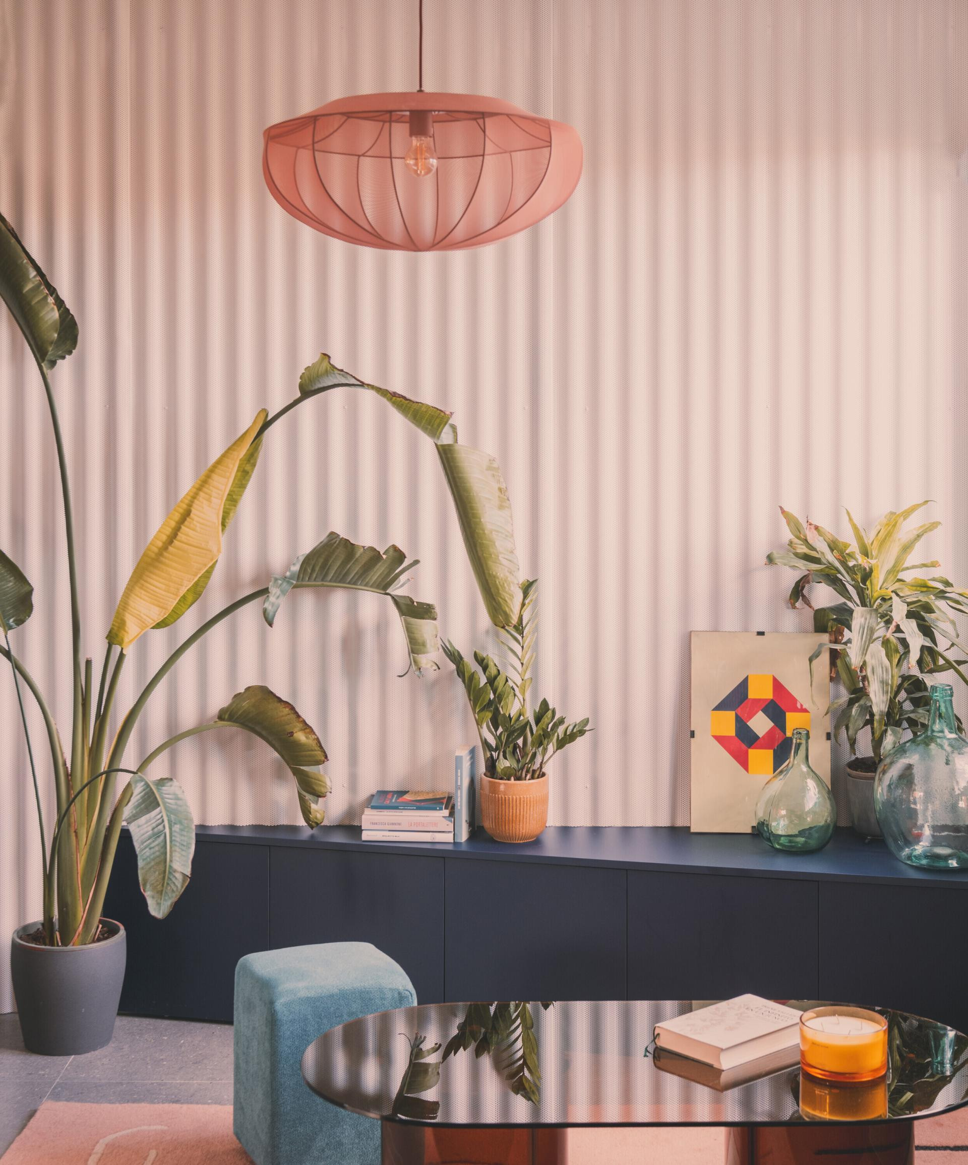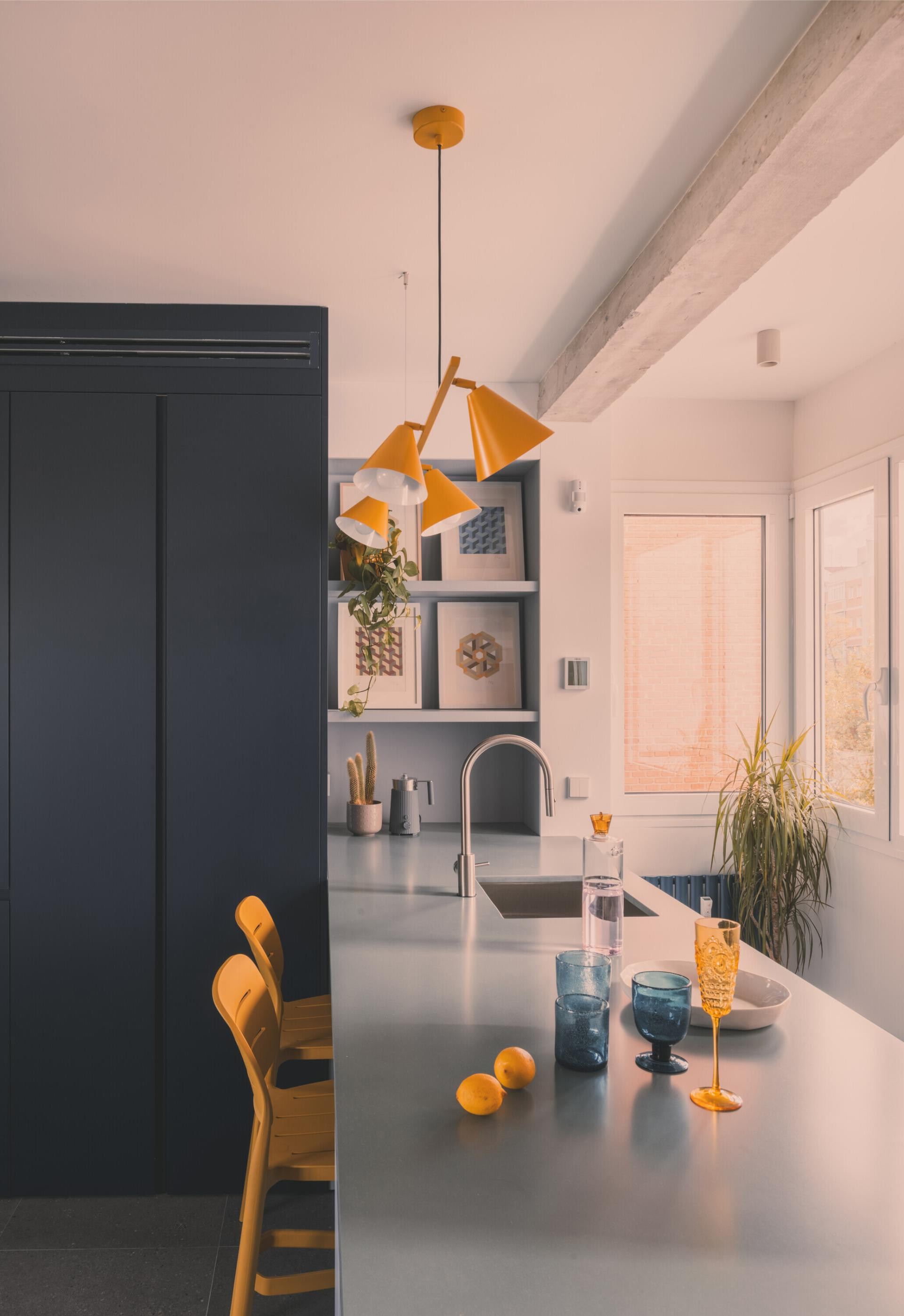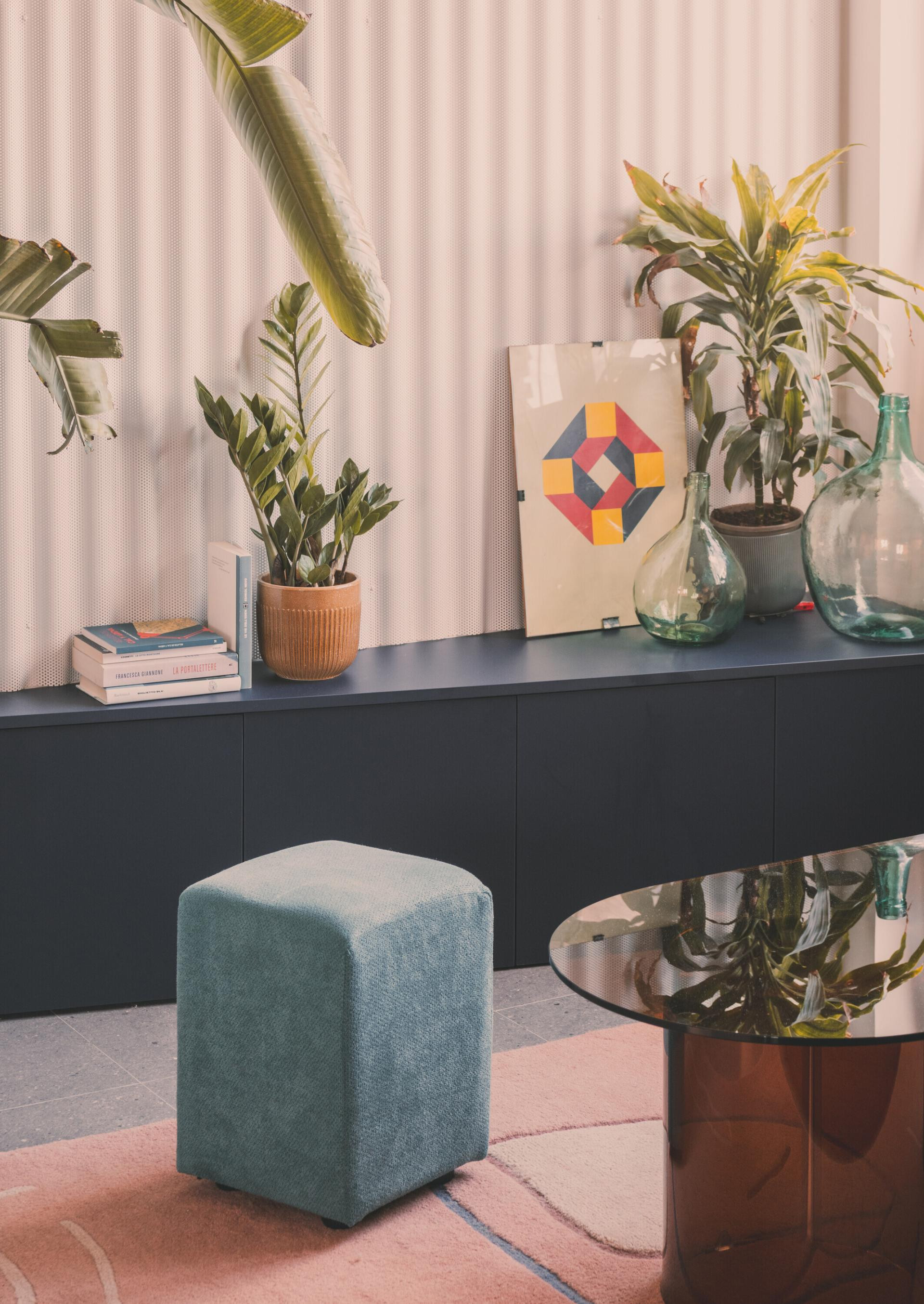 Na zidu dnevnog boravka, preko puta tamnoplavog kauča, valovita je metalna obloga, zlatna baršunasta zavjesa odvaja dnevni boravak od spavaće sobe, a njezini nabori odražavaju ritam žutih valovitih pločica na susjednom zidu. Nasuprot tome, komoda s maslinastozelenim vratima unosi novi kontrast. Zemljani tonovi svjetiljke nadovezuju se na boju ormara, dok žuta lampa povezuje prostor s nebeskoplavom kuhinjskom pločom.
