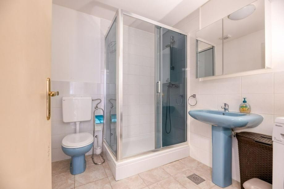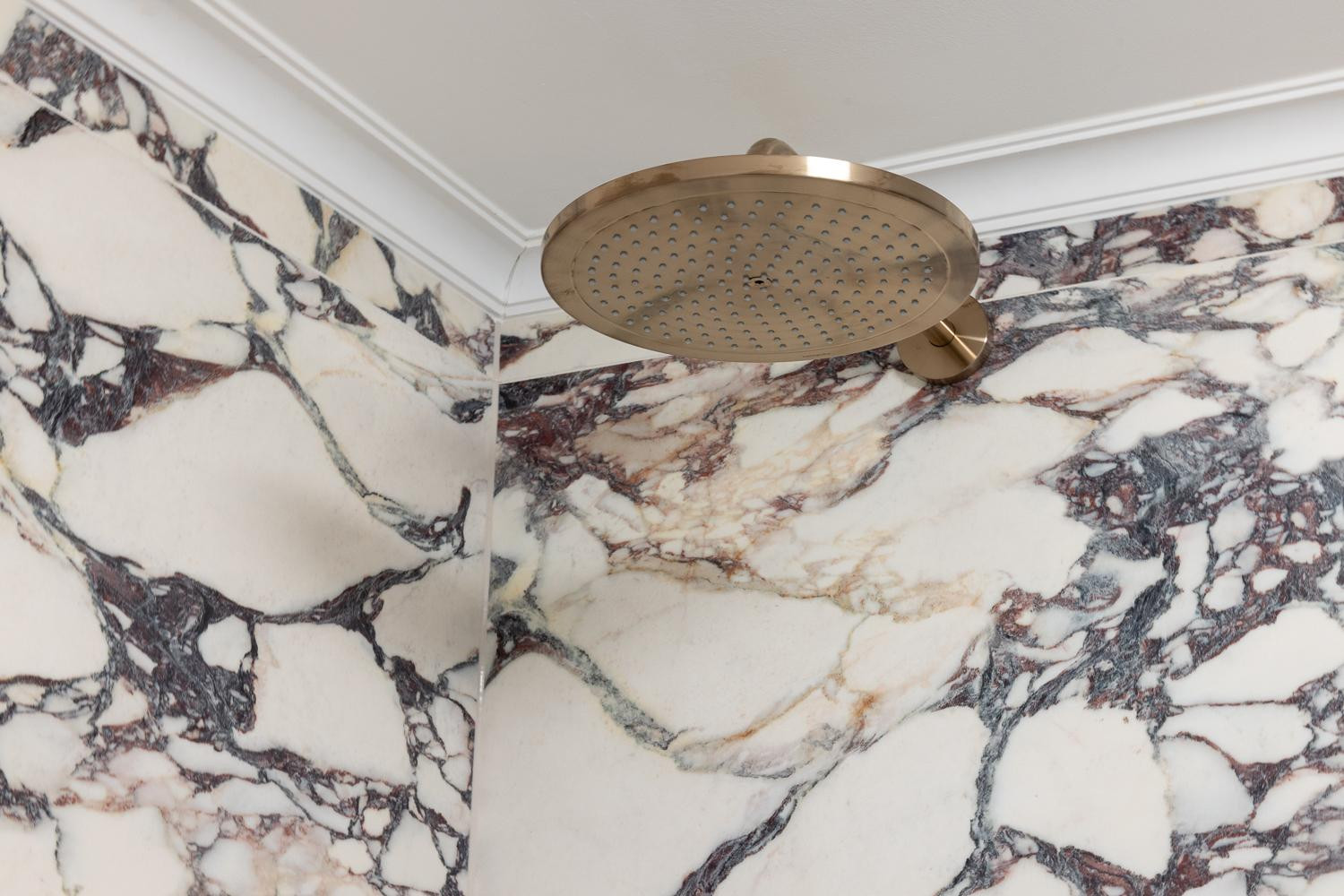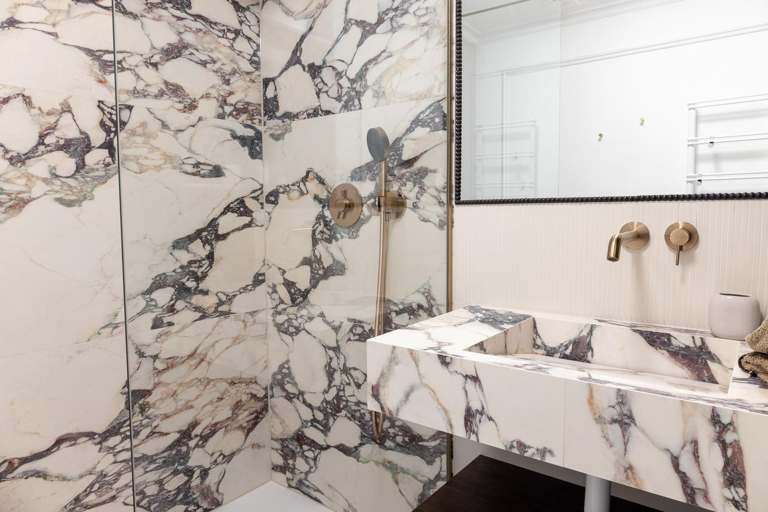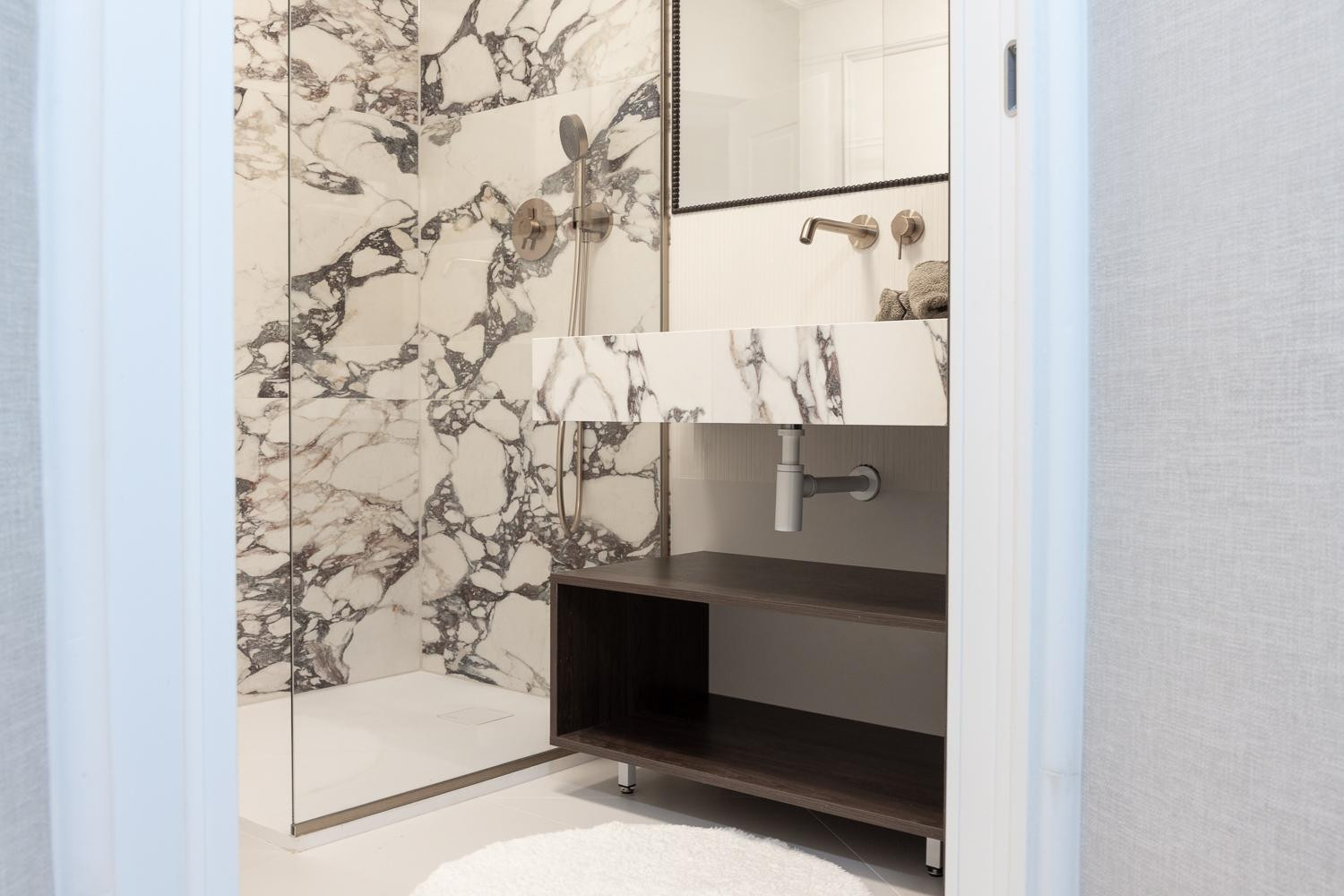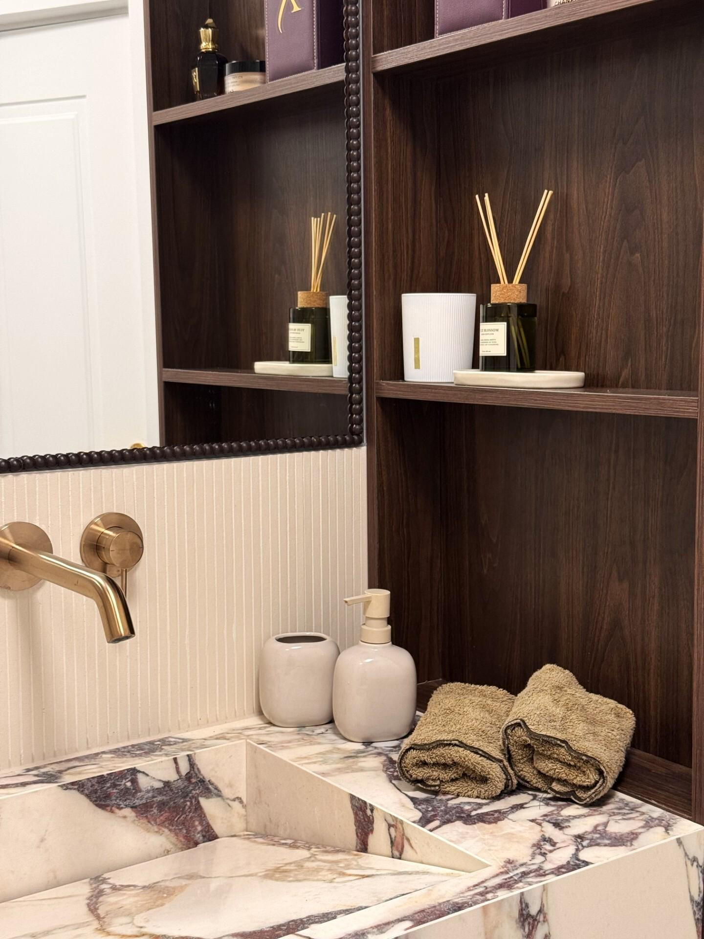 Umivaonik je rađen po mjeri od iste keramike kao i pločice u tušu, a sve je podignuto zlatnim detaljima – od slavina do okvira ogledala – koji prostoru daju dozu sofisticiranosti.