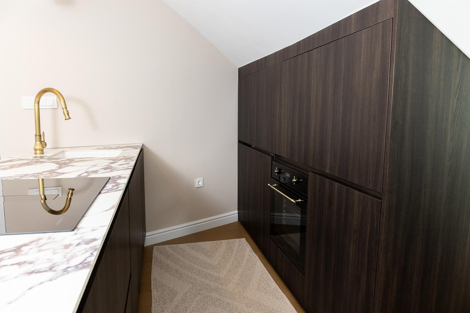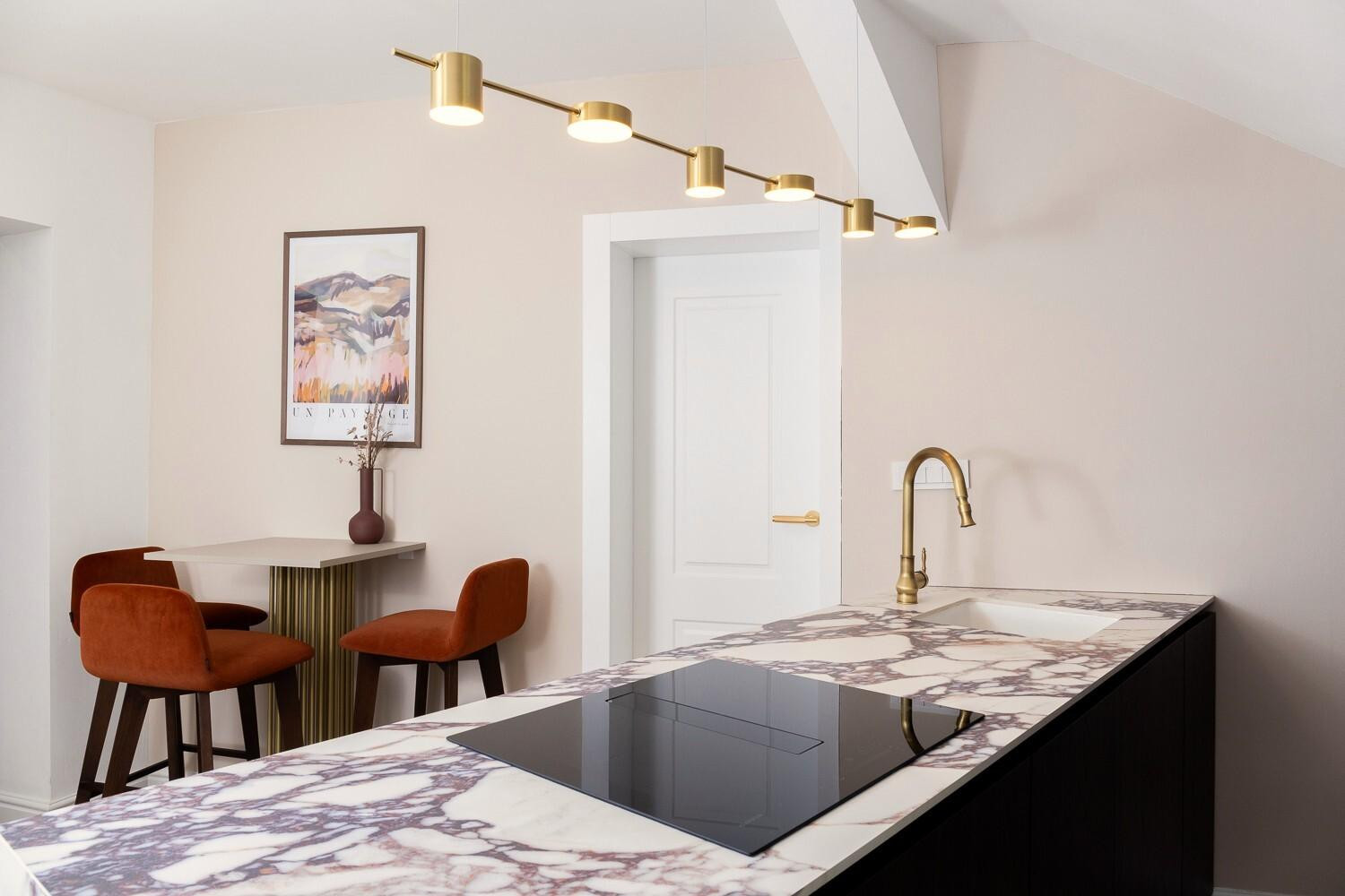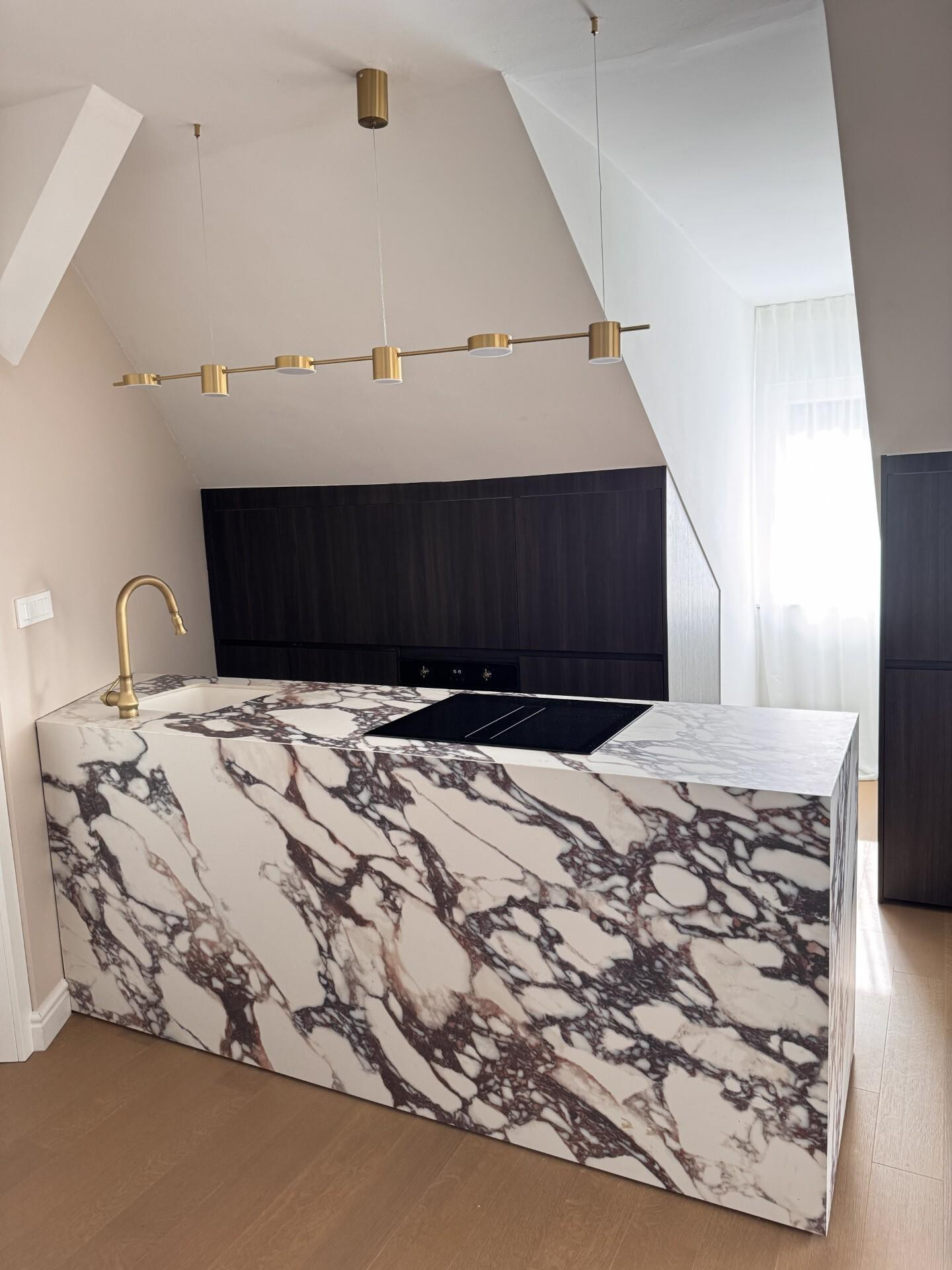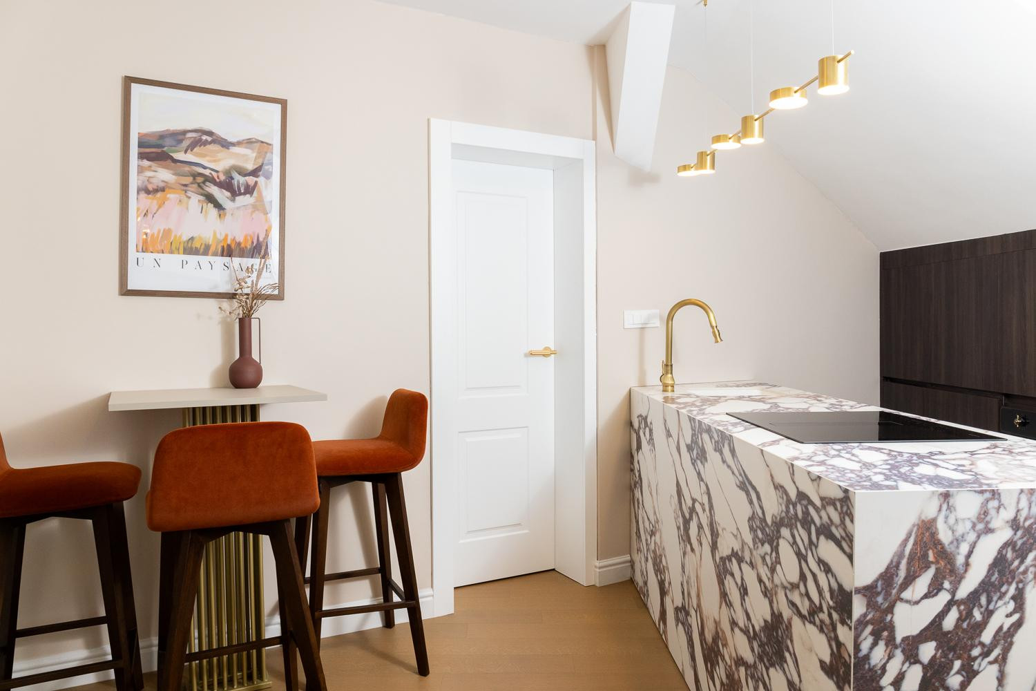 Tako je nastala otvorena, svijetla i prozračna cjelina – spoj kuhinje i dnevnog boravka, gdje danas dominira elegantni kuhinjski otok obavijen Laminam pločom u efektu mramora.