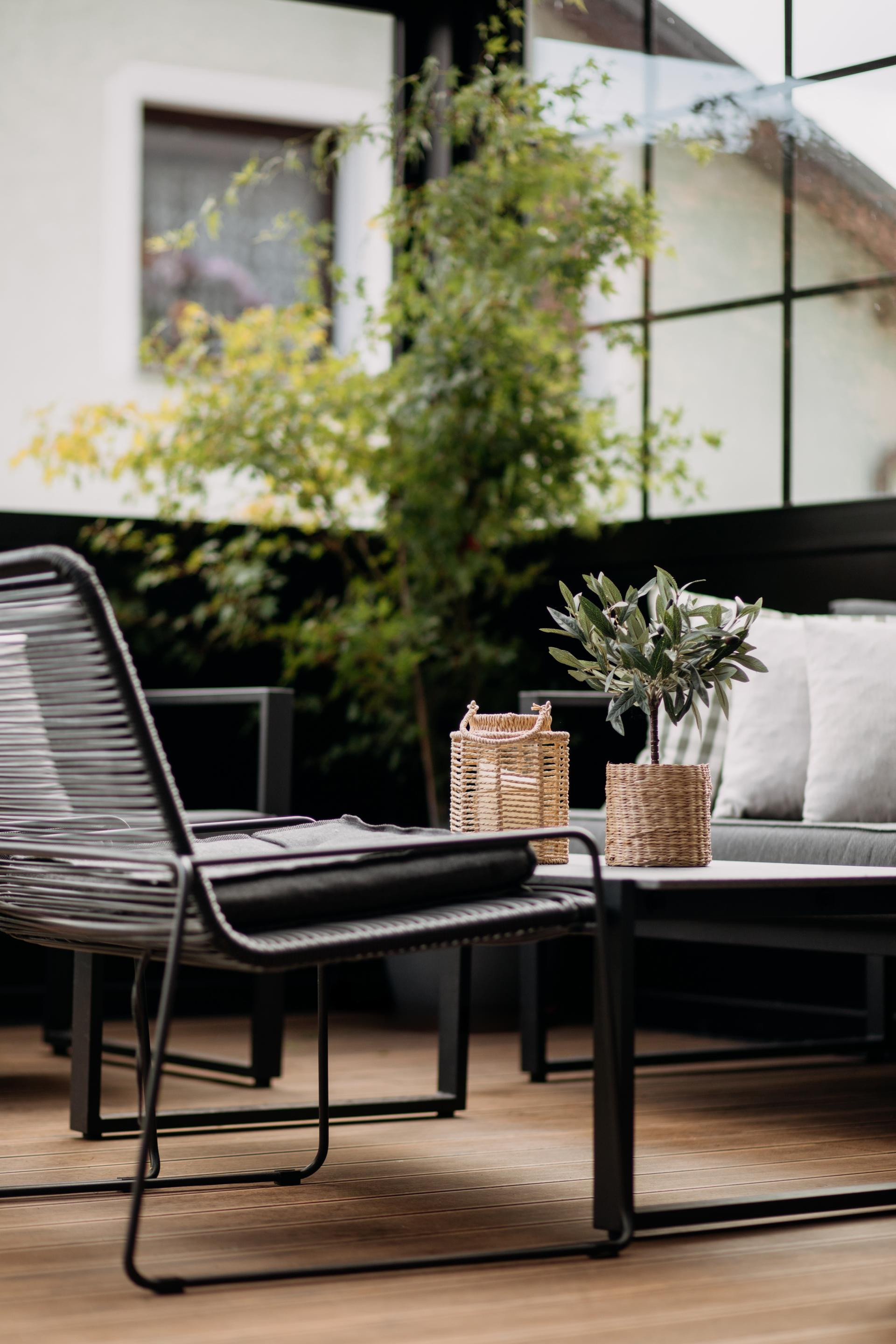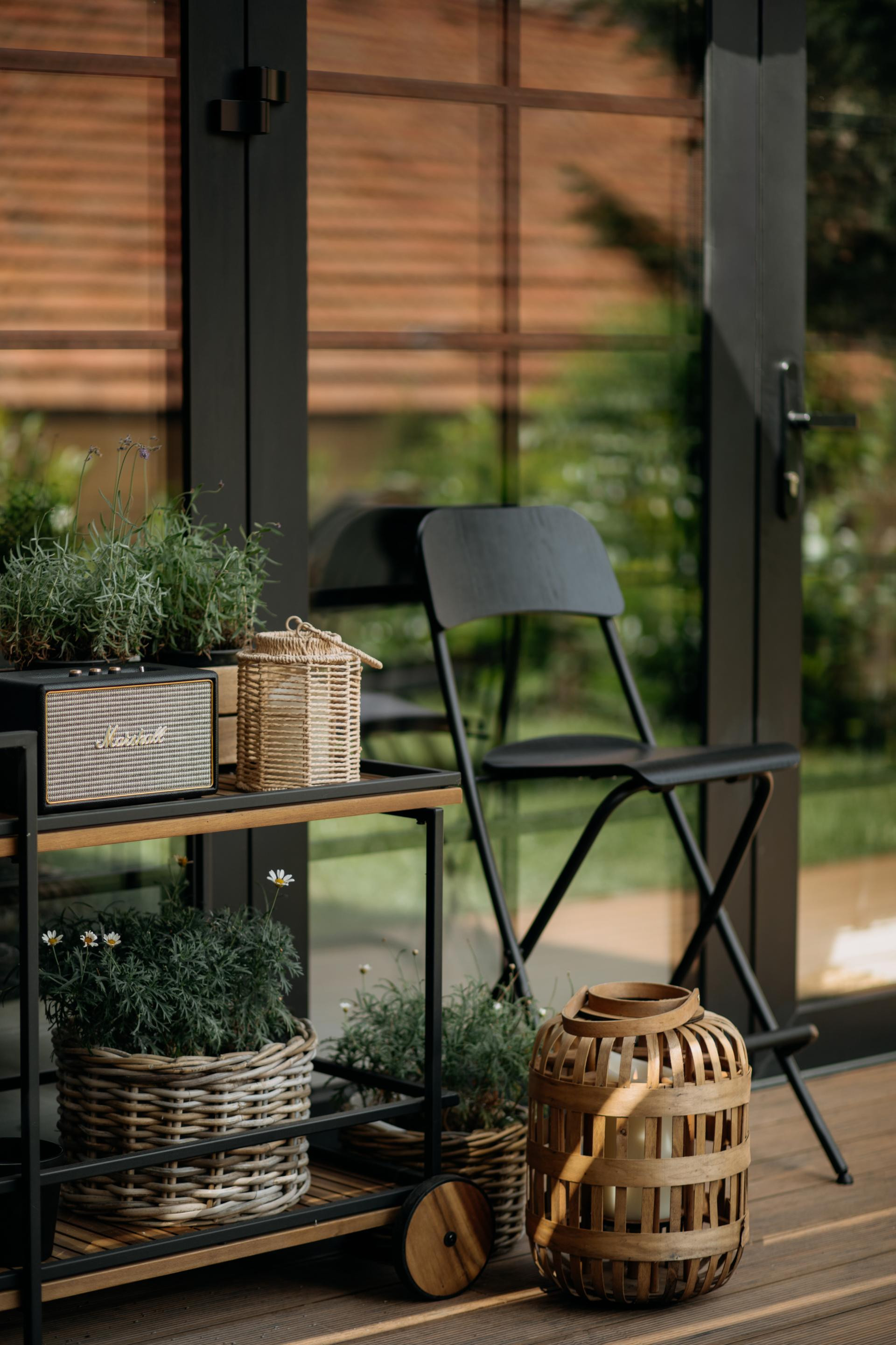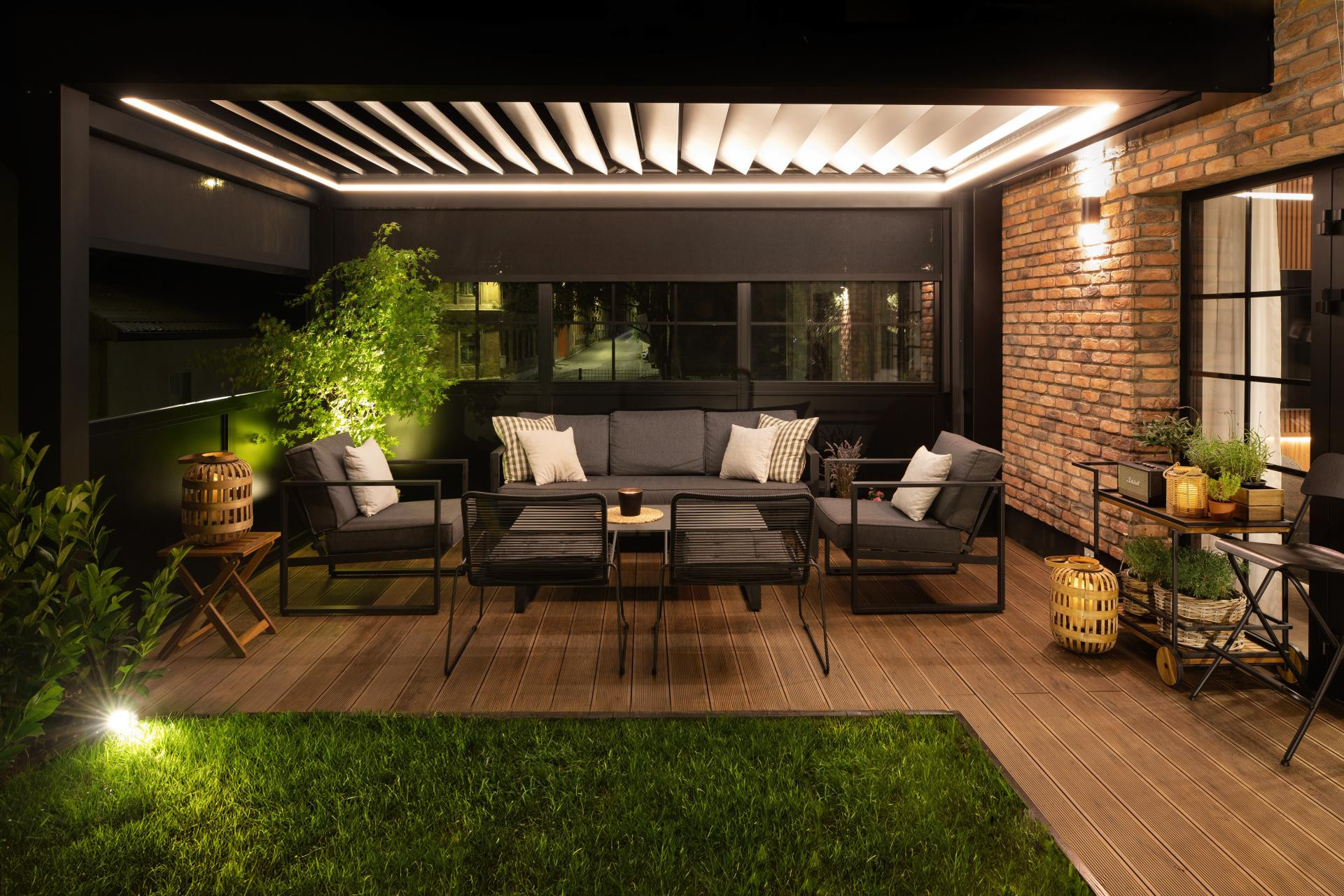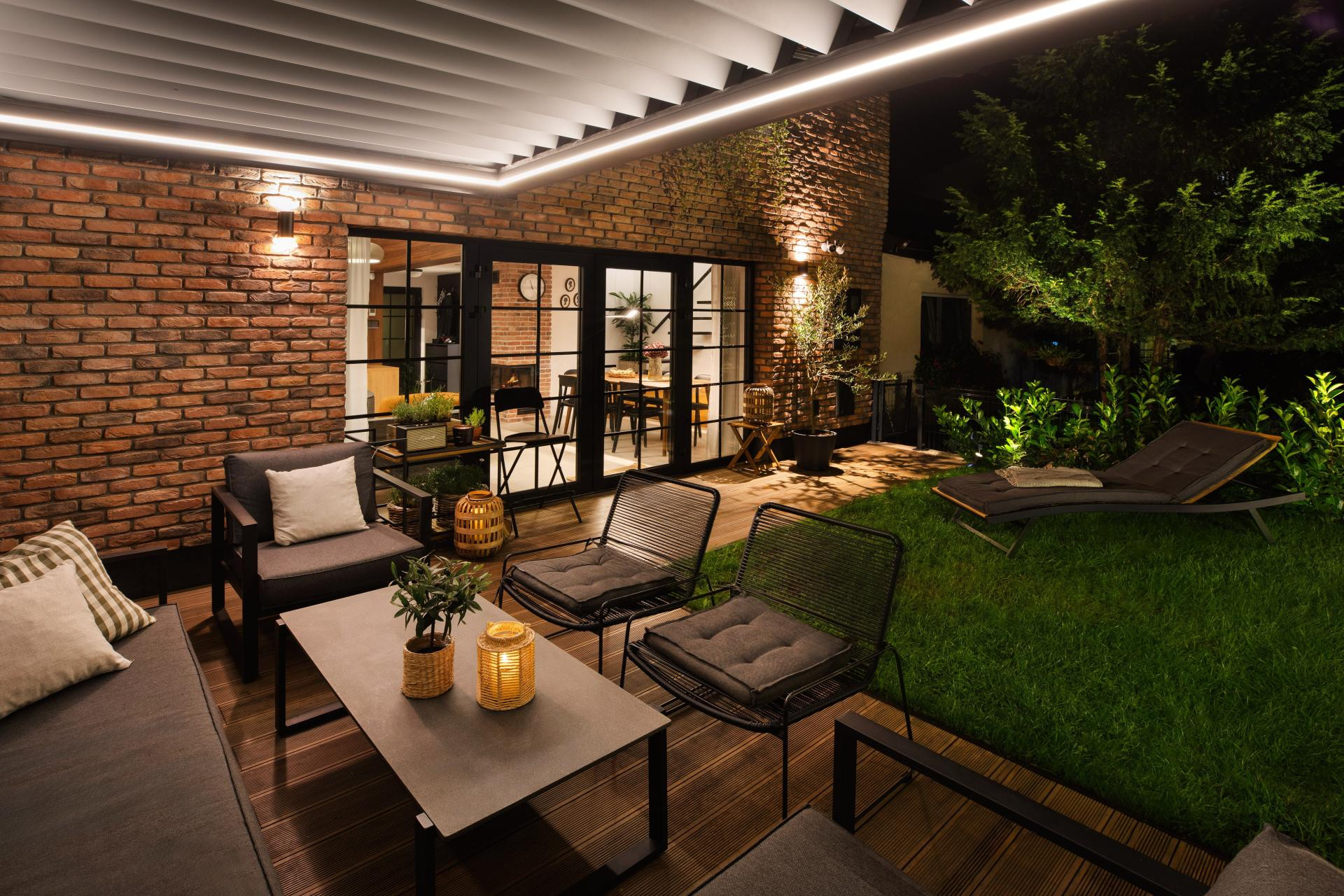 Vanjski prostor zamišljen je kao pravi dnevni boravak na otvorenom. Glavna terasa, smještena iznad garaže, opremljena je lounge garniturom, ležaljkama i modernom bioklimatskom pergolom koju je izvela tvrtka Portra iz Banje Luke.